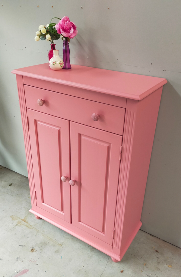 Wow, hoe leuk is deze kast geworden en die kleur !!! Toffe meidenkast met lade en achter de deurtjes heerlijk wat planken. Toffe bijpassende knoppen mochten op deze kanjer natuurlijk niet ontbreken! Wij zien deze natuurlijk alweer helemaal shinen op een vrolijke kinderkamer, maar in een kleurrijk interieur past deze knapperd natuurlijk ook!