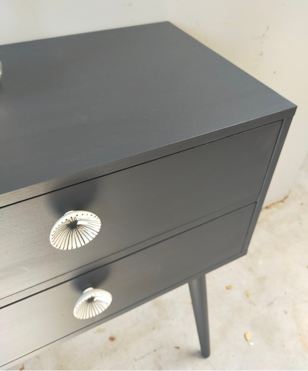 Hoog op z'n vintage vormgegeven pootjes! Deze ladekast is solide, fuctioneel en ook nog mooi! Past wat ons betreft ook echt in een industriele inrichting alsmede vintage huishouden en alles daartussen. De kleur Ash van Fusion Mineral Paint is hier gebruikt wat zich als een mooi diep antraciet laat omschrijven. Toffe knoppen op de soepel lopende lades maken het helemaal af !
