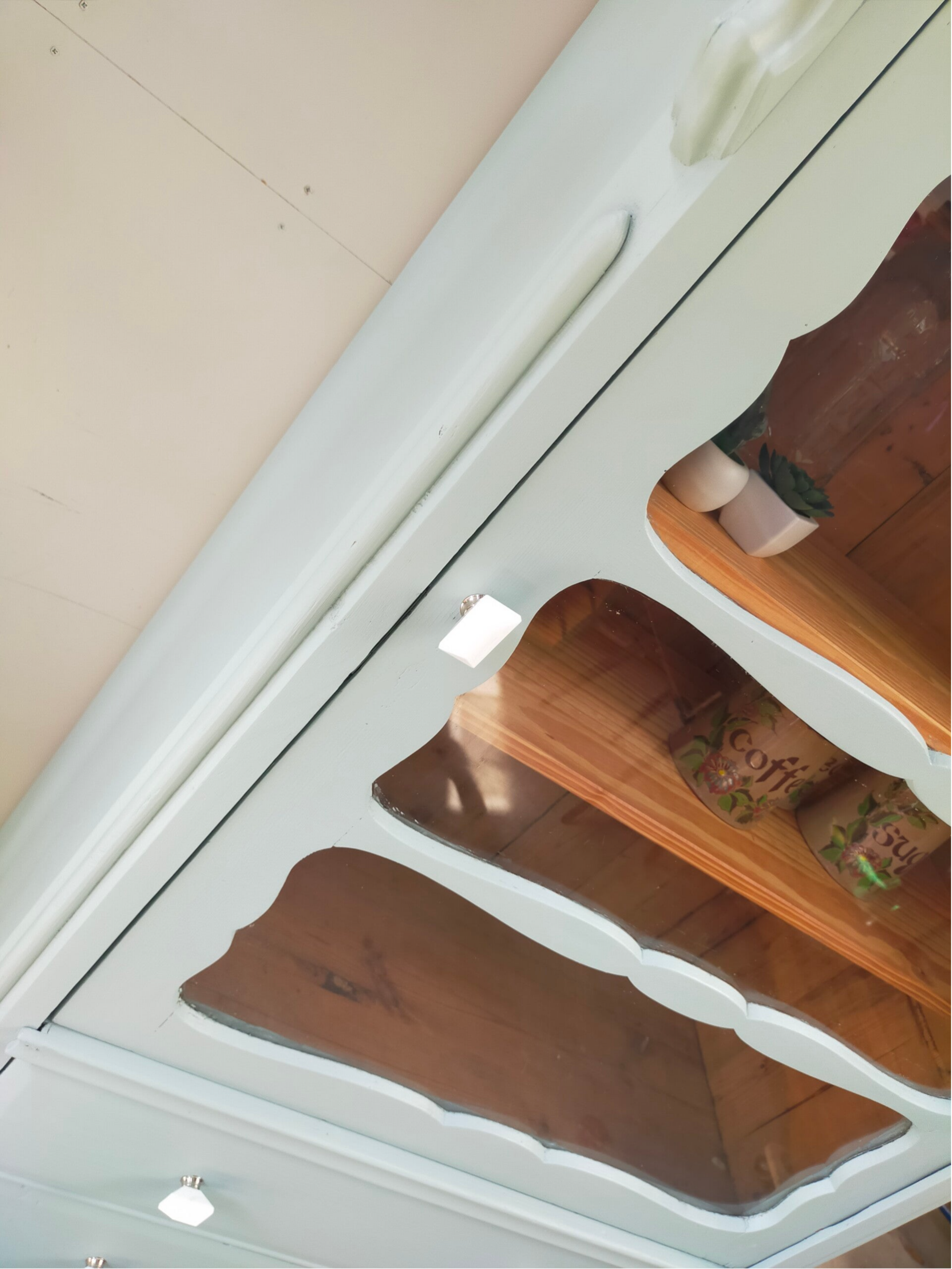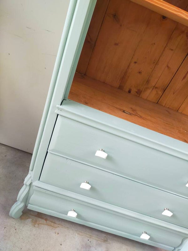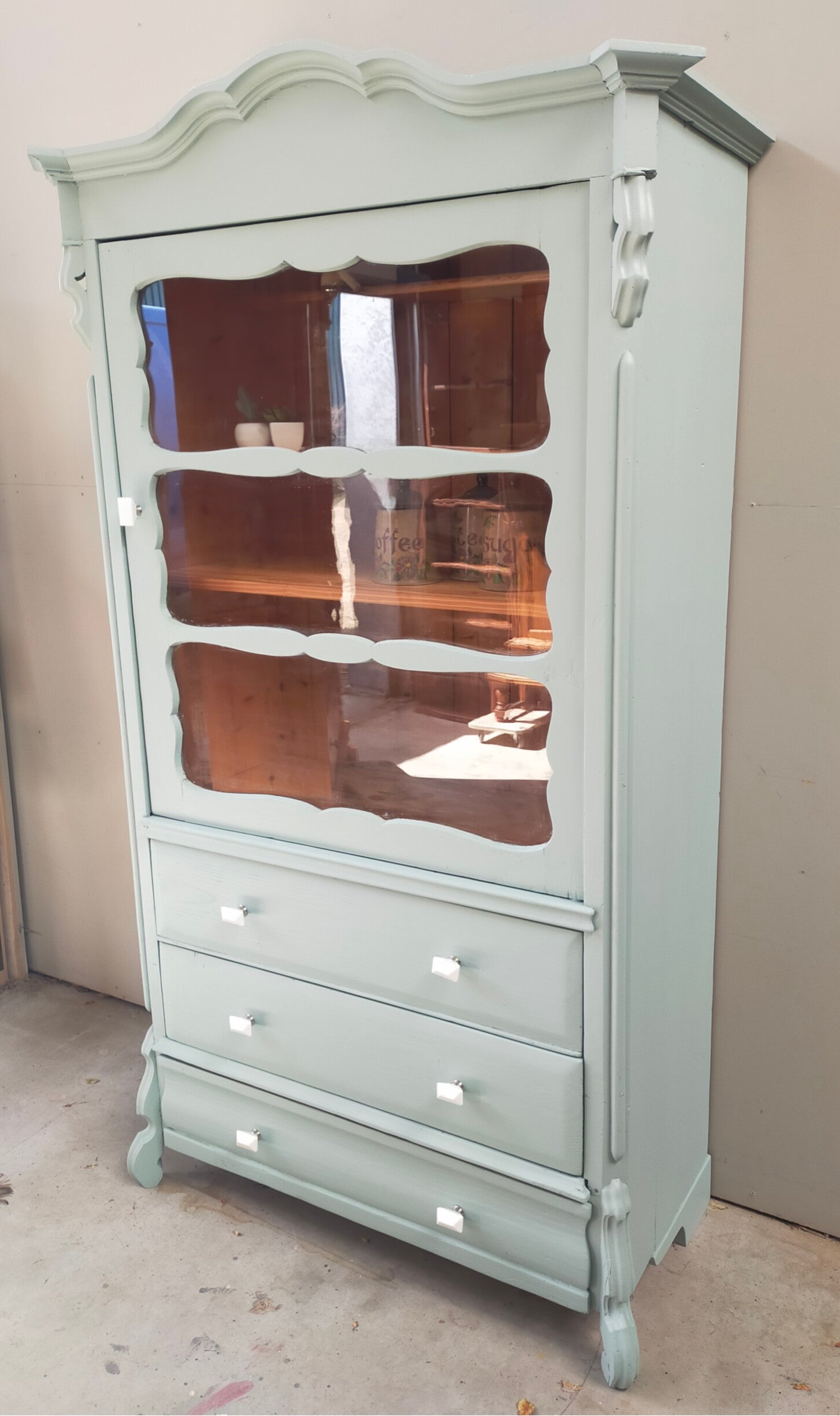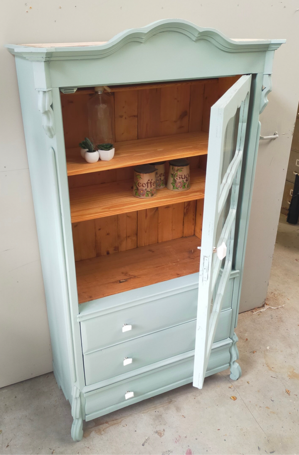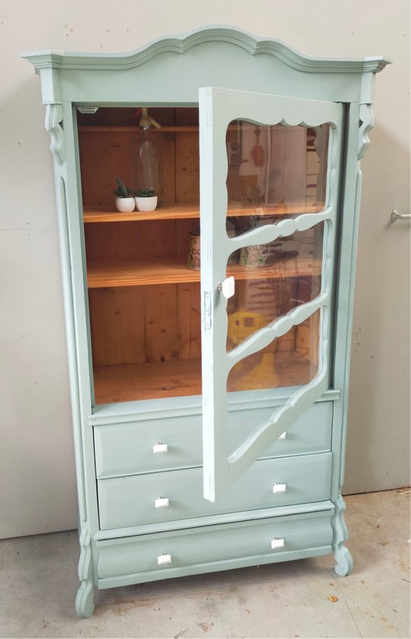 Een woest oude dame, deze vitrinekast. Maar ondanks dat mag ze er gerust nog zijn. Mooie vormgeving, subtiel houtsnijwerk en ter gelijker tijd een fantastische opberger. Zowel achter het glas als in de stevige lades. Kortom, multifunctioneel! De kleur Frech Eggshell is hier gebruikt van Fusion Mineral Paint, wat het geheel een rustige en zachte uitstralig geeft. De combinatie met het orginele hout aan de binnenzijde alsmede het beslag maken het wat ons betreft een uniek item en een lust voor het oog.
