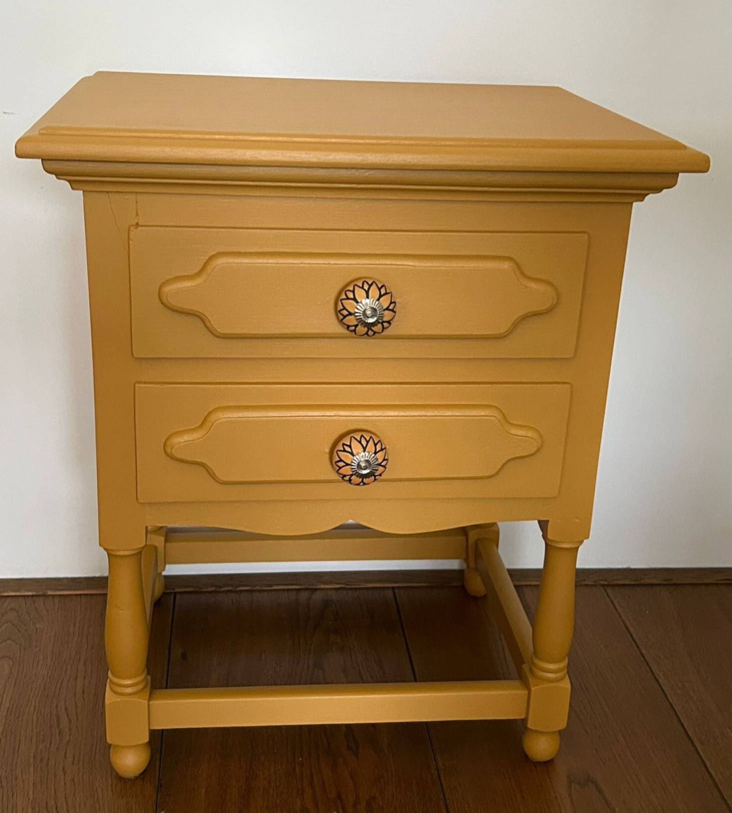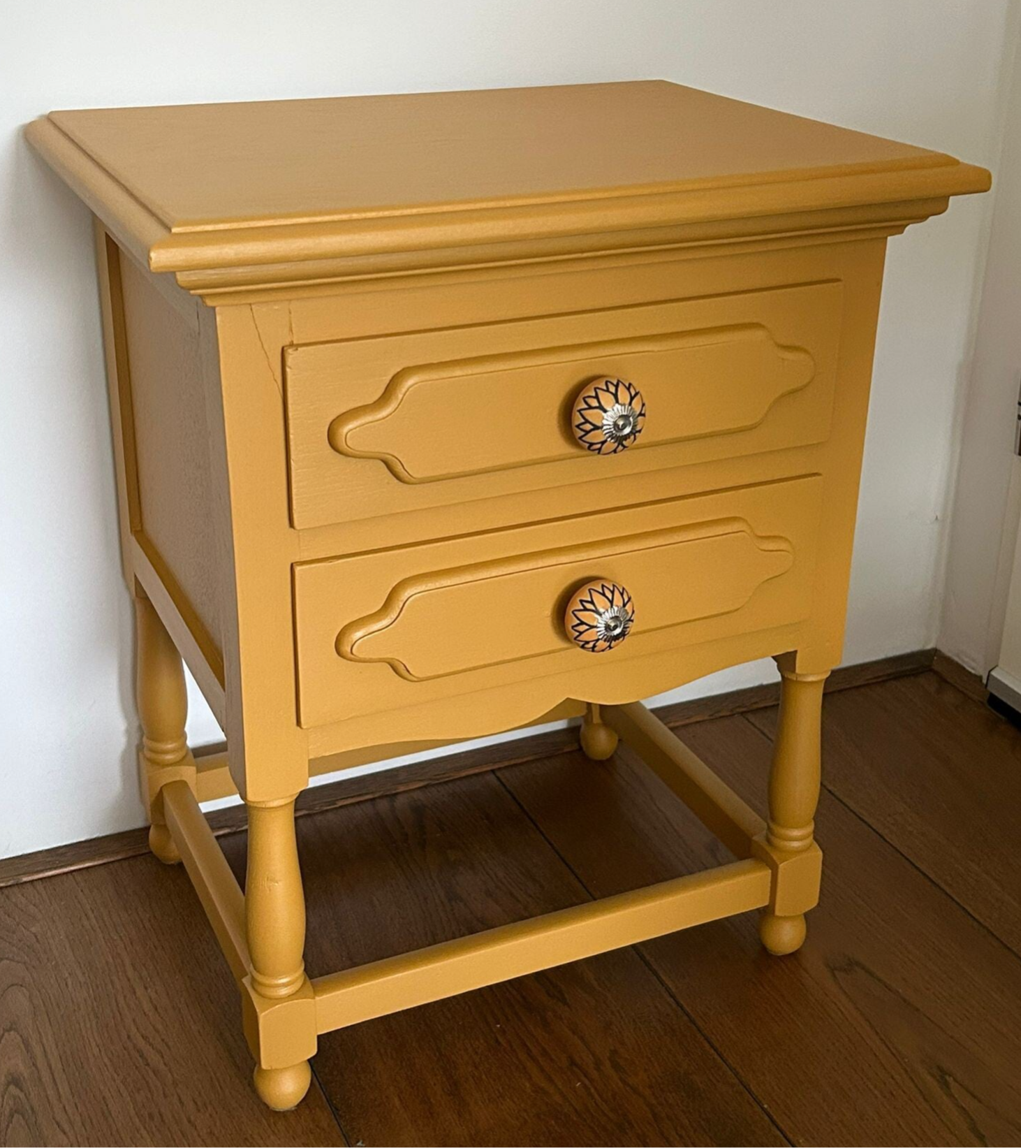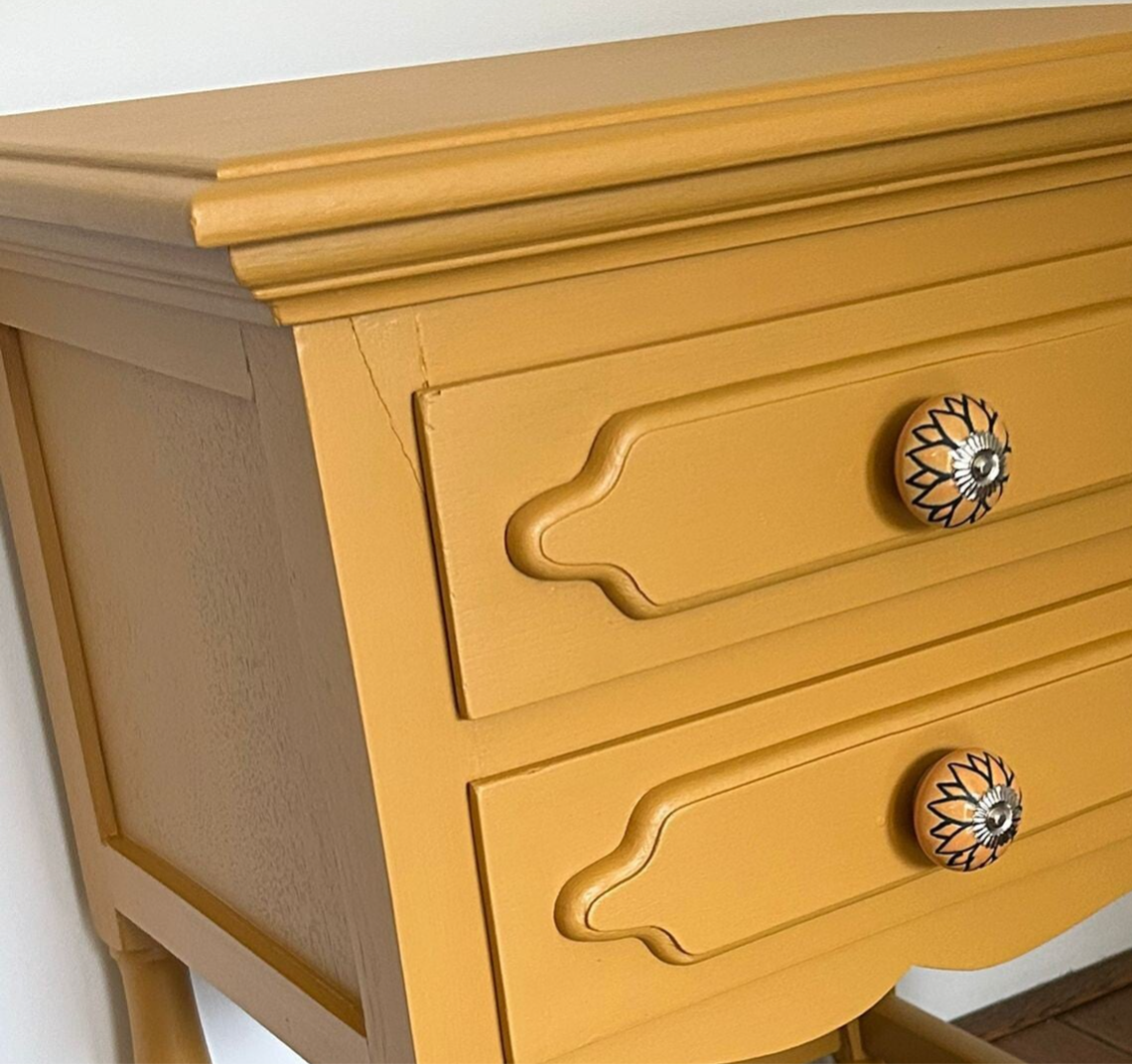 Een dot van een kastje, enigszins een spaanse uitstraling qua vormgeving, maar de kleur is natuurlijk helemaal vrolijk. Hier is gekozen voor de kleur Mustard van Fusion Mineral Paint, met dit als super fijn resultaat. De laatjes zijn voorzien van mooie bijpassende knopjes. Een solide kastje met fijn wat laatjes.