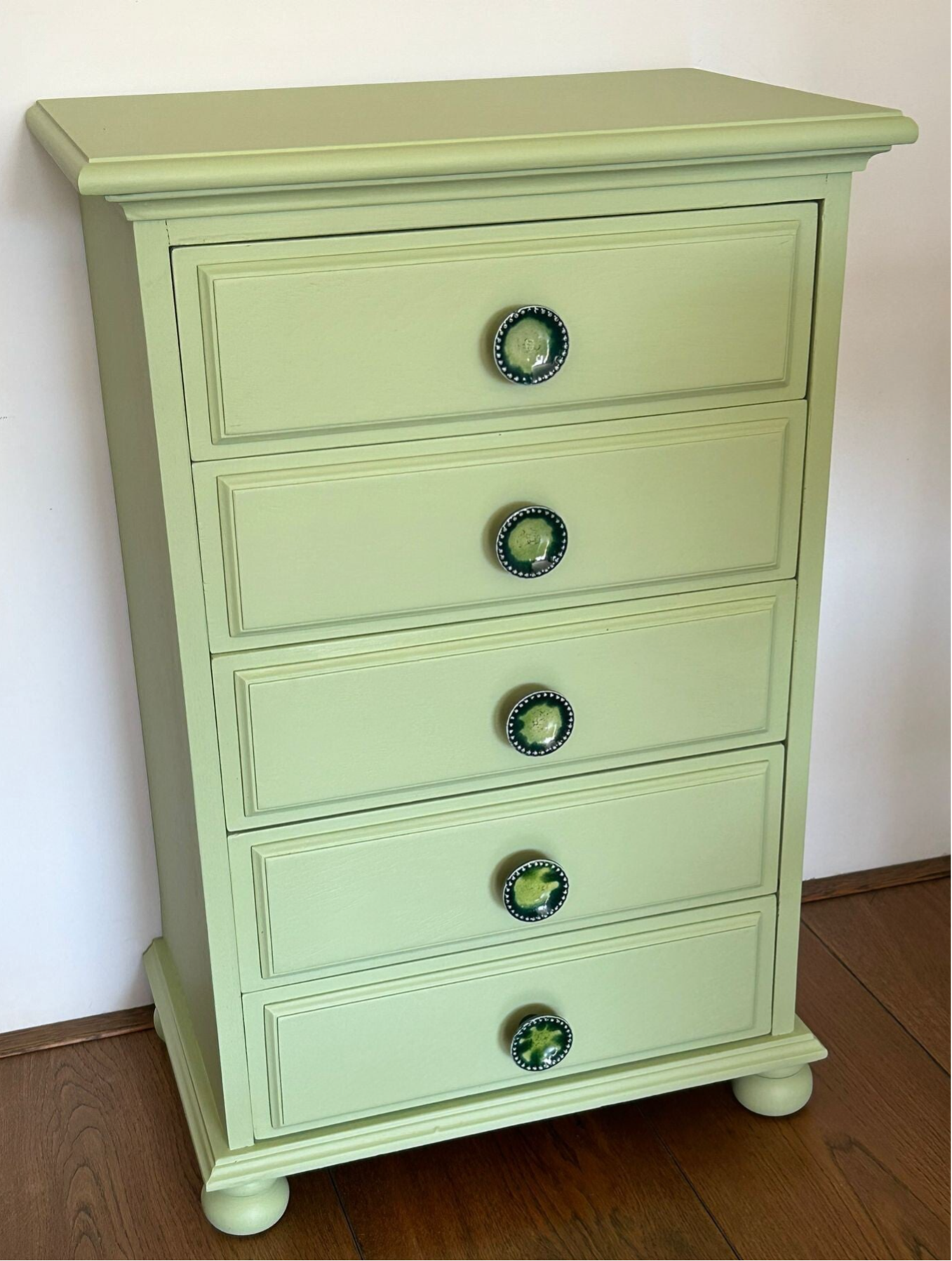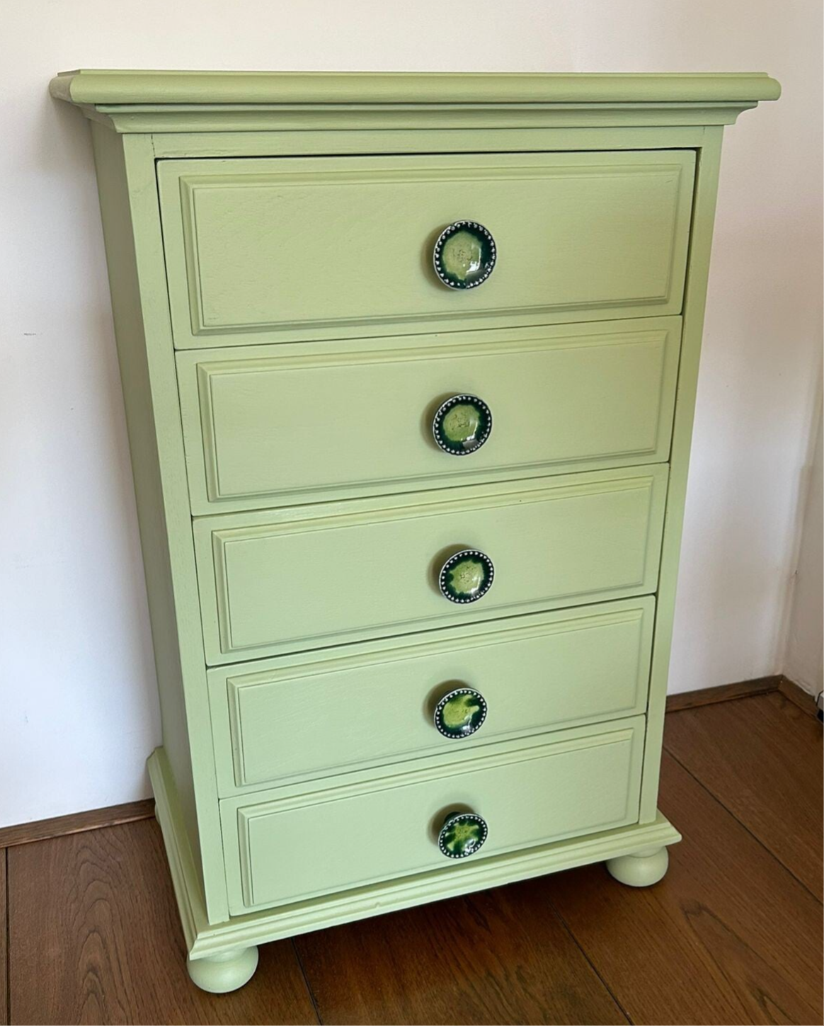 Een zeer solide en mooi model ladenkast. De kleur Upper Canada van Fusion Mineral Paint is hier gebruikt. Deze kleur laat zich het beste omschrijven als een fris groene kleur. Dit gecombineerd met frisse en leuke porseleinen knoppen maakt dit een prettig geheel. De lades geven een hoop opbergruimte en het is ook nog leuk om naar te kijken, wat wil je nou nog meer!