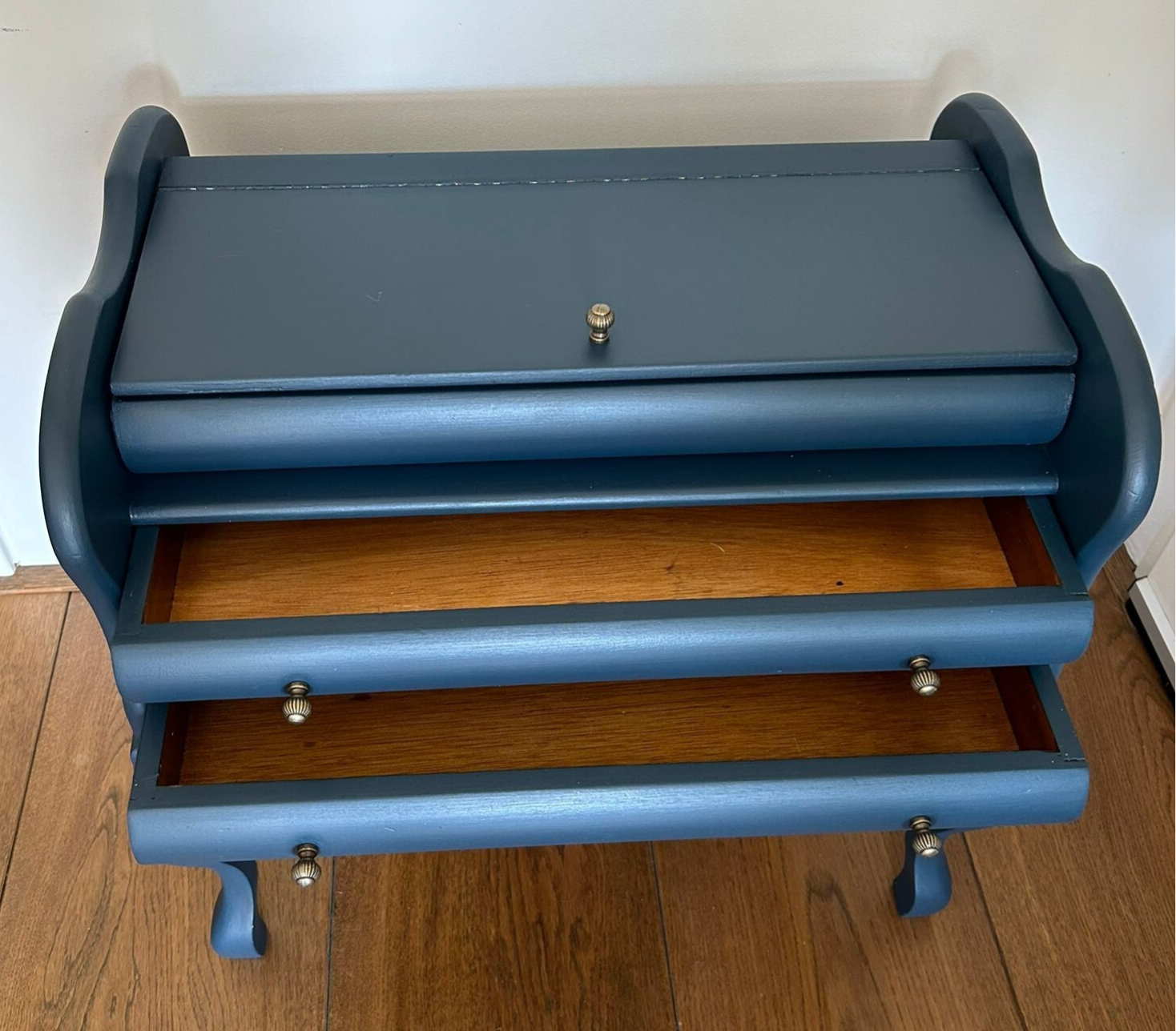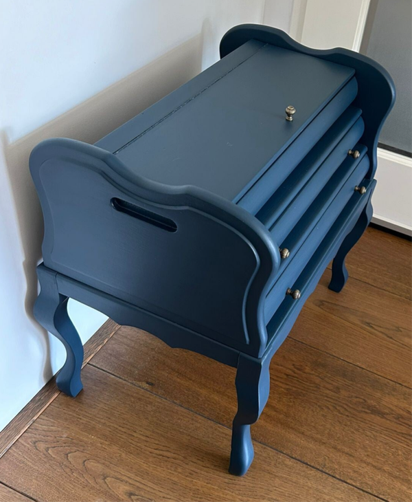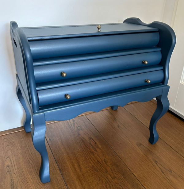 Werkelijk een oudje, dit klep kastje. Formeel een fournituren kastje of naaikist. Maar hoe leuk om daar weer een andere bestemming voor de vinden. Hoeft niet natuurlijk, want ook als naagerei kastje kan ze nog steeds goed dienst doen. Wel hebben we het beslag vervangen en de kleur aangepast. Een mooie blauw tint van Fusion Mineral Paint is hier gebruikt, te weten Willowbank.