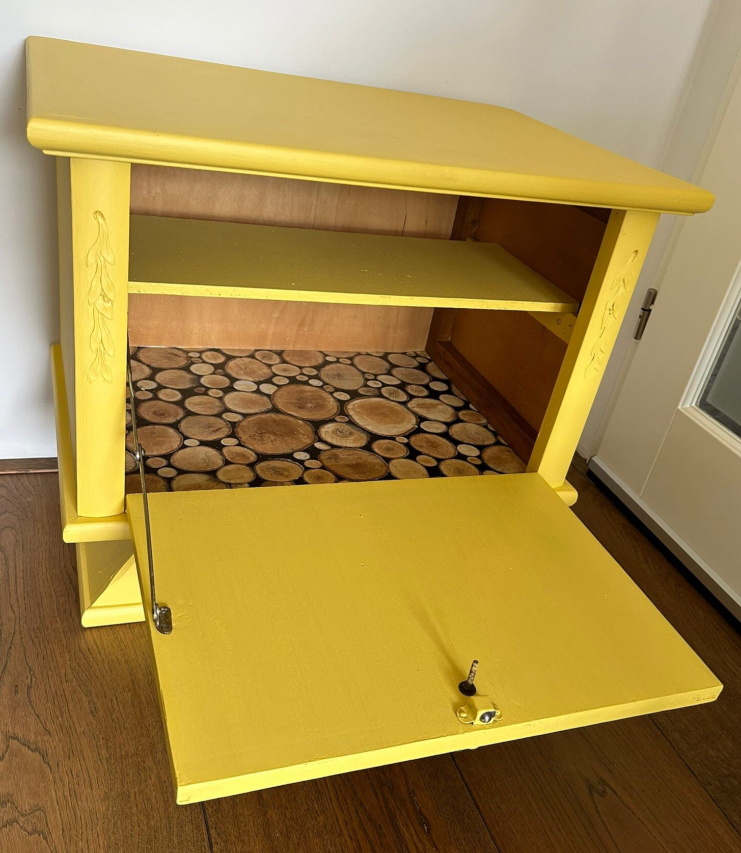 Super vrolijk dit zonne gele klepkastje. Te gek voor een meidenkamer of een kleurrijk interieur. Waanzinnig leuke en toffe knop er op, helemaal af zo toch?