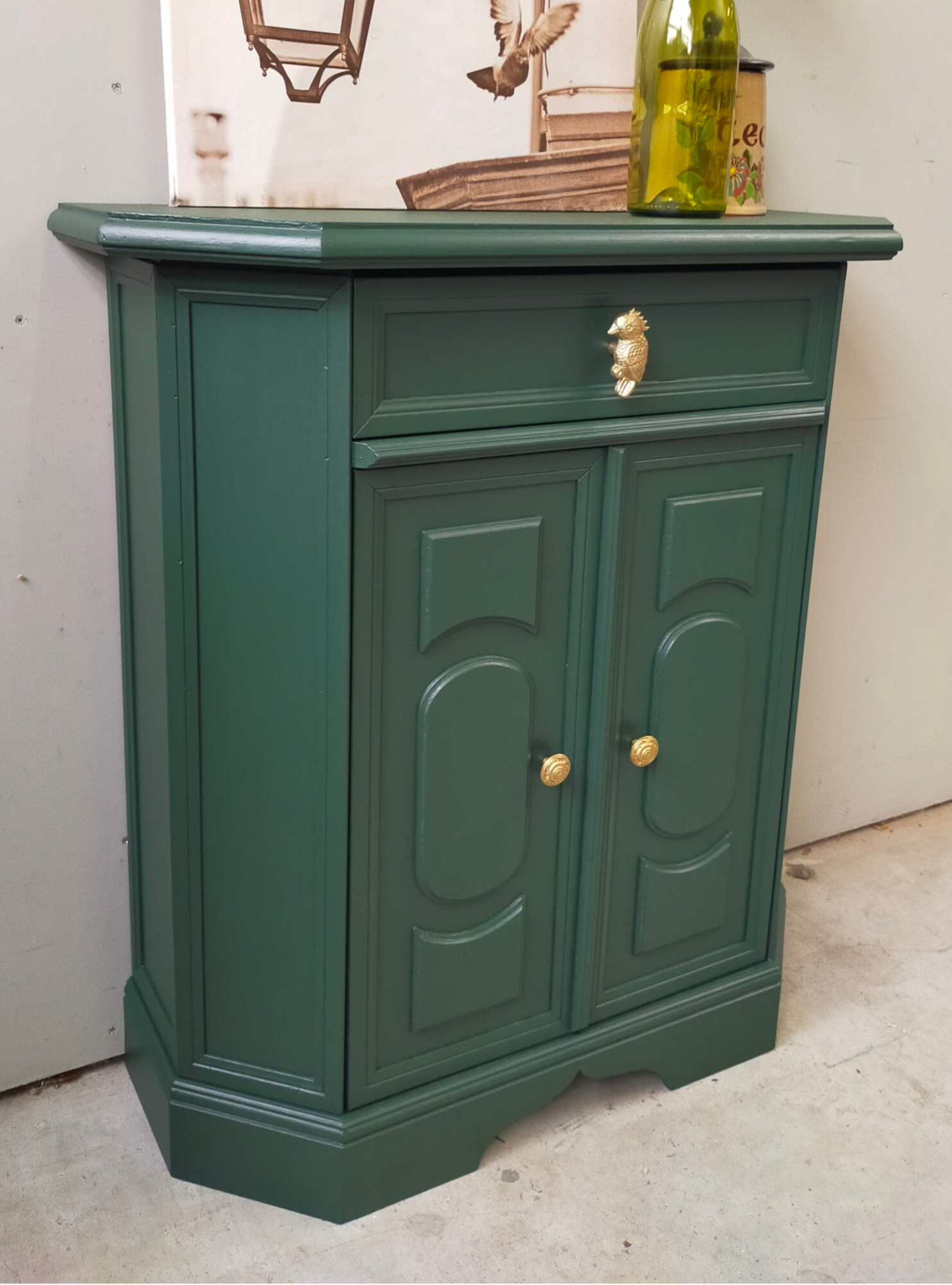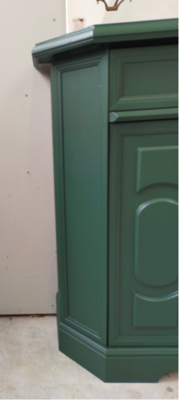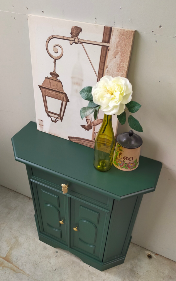 Het ideale model voor in de hal, maar ook voor in een wat kleinere slaapkamer of woonkamer of.....nou genoeg plekjes waar dit leuke "zogenaamde" halkastje kan shinen. De kleur is een intens groene tint, te weten Manor Green van Fusion Mineral Paint. Ooh en wauw, heb je die waanzinnige knop op de lade gezien, die past er wat ons betreft helemaal bij. Ook de deurtjes zijn voorzien van mooie bijpassende knopjes. Al met al een mooi en praktisch kastje met veel potentie / mogelijkheden.