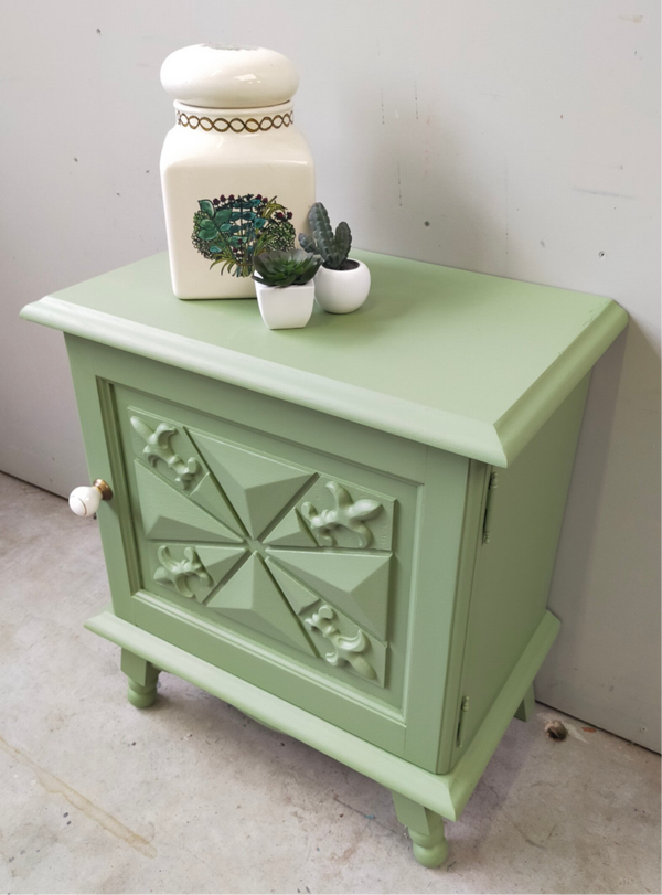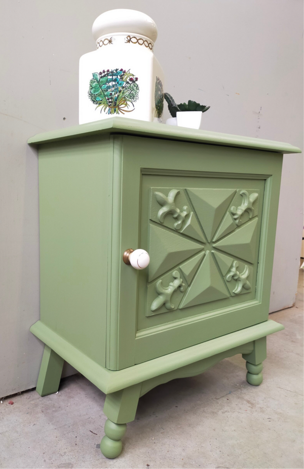Werkelijk een pareltje! Dit kastje kent zijn oorsprong in Frankrijk en is super mooi bewerkt aan de voorzijde van het deurtje. Dit in combinatie met de sierlijk vormgegeven pootjes maken dit werkelijk een uniek kastje. De kleur is Conservatory van Fusion Mineral Paint. Deze kleur is een warm en ter gelijker tijd fris groen en op het deurtje is een prachtige oud porseleinen knop geplaats. Het geheel is wat ons betreft helemaal goed zo en een lust voor het oog.