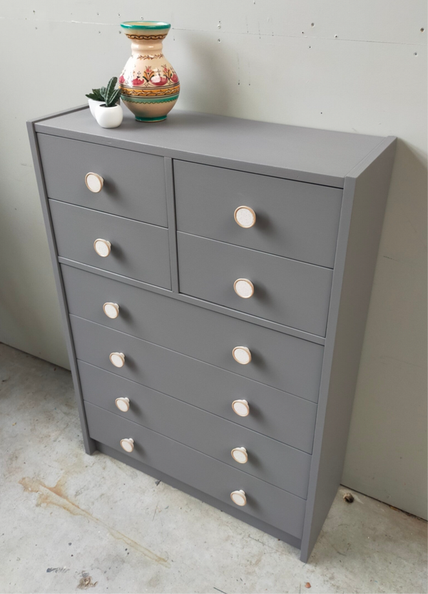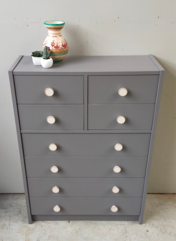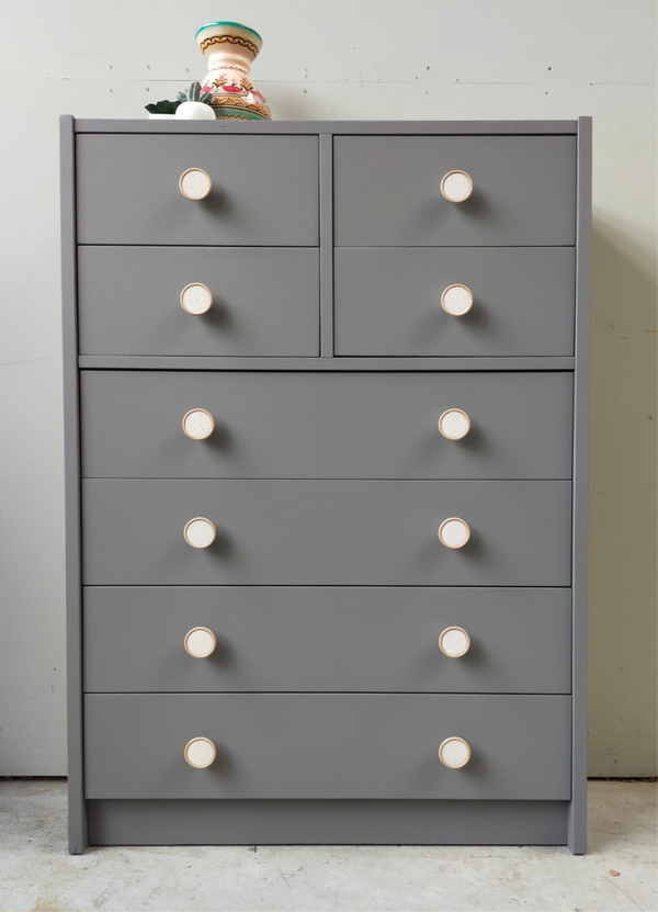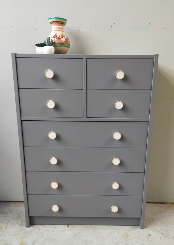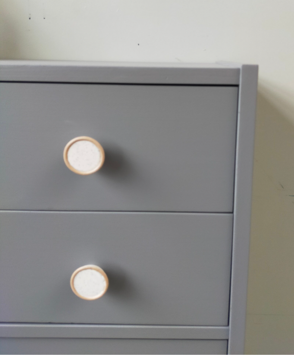Hier komt praktisch en mooi goed samen. Werkelijk een ideale ladenkast, wat mede komt door zijn afmetingen en hoeveelheid lades. De kleur Hazelwood is een grijs tint, maar met een hoop warmte inzich. Dit komt door de enigszins bruine ondertoon. De knoppen die hier weer uitstekend mee combineren maken het helemaal af maakt het geheel tot een unieke kast.