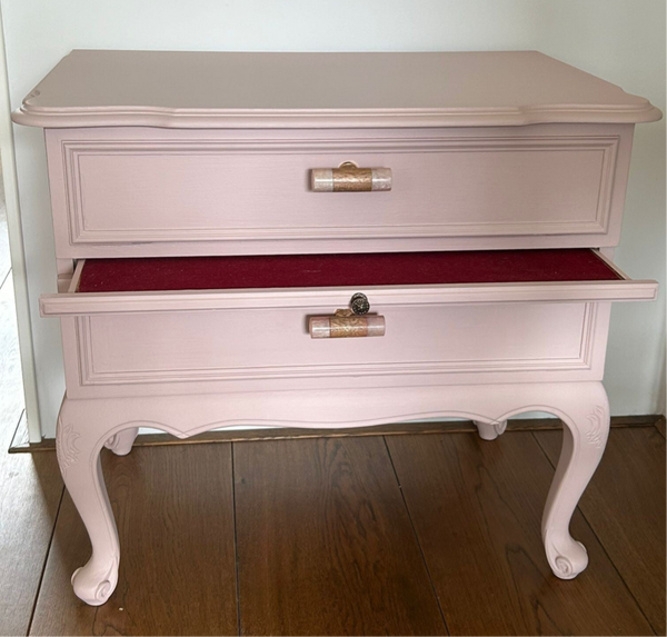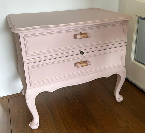 Zoet, zoeter, zoetst! Dat is wat er boven komt drijven als we naar dit kastje kijken. Wauw, wat staat de kleur haar goed en wat dacht je van die waanzinnig toffe knoppen!! De kleur is Rosewater van Fusion Mineral Paiint, een mooi pastel roze kleur. De vormgeving, de kleur, het extra uitschuif plankje.....alles maakt dat dit een tof ladenkastje is. Uiteraard kan het niet anders dan dat de tijd zijn sporen heeft achter gelaten, maar dit is zeker niet storend. Functioneel is deze mooie dame zeker nog!