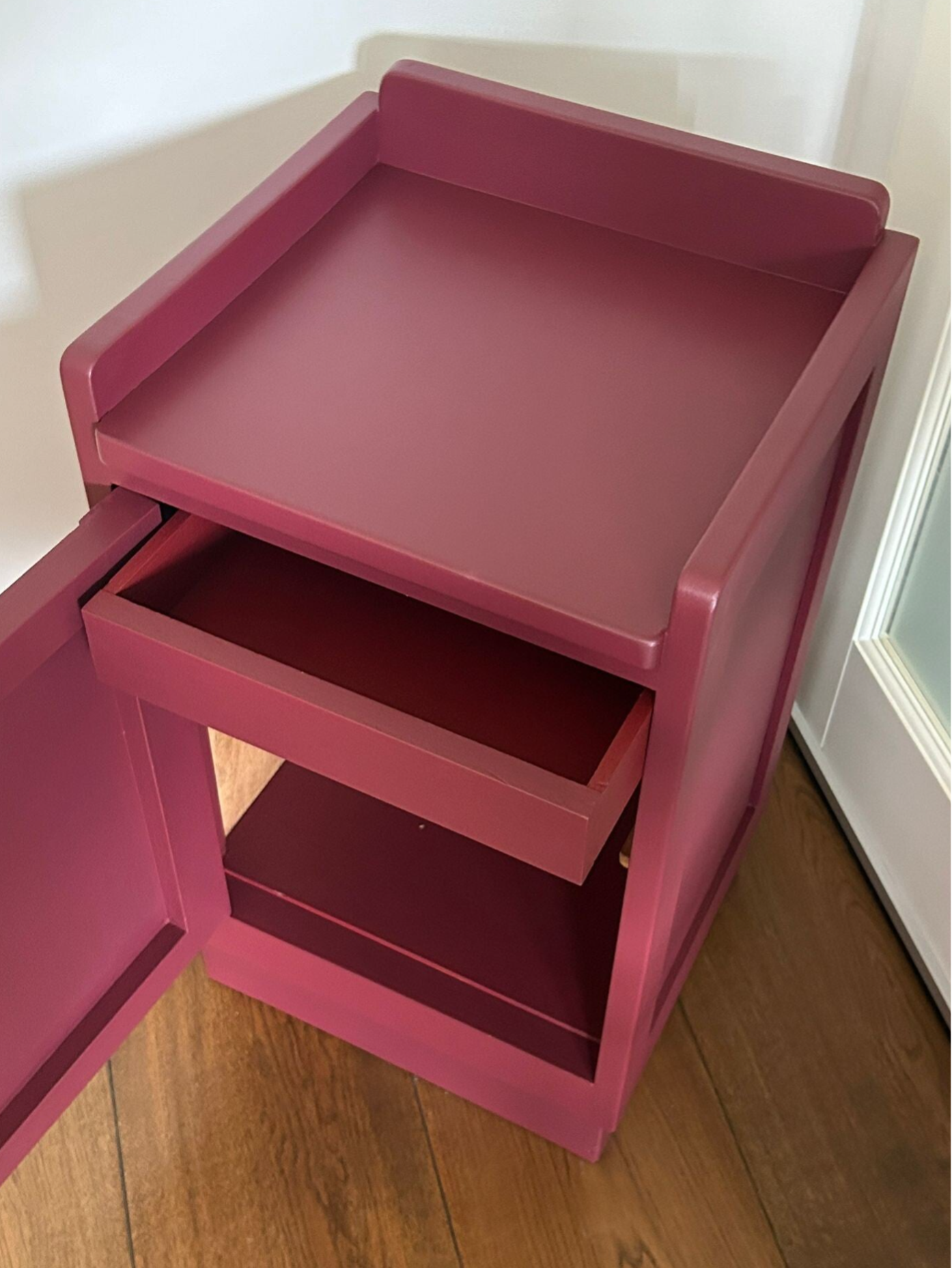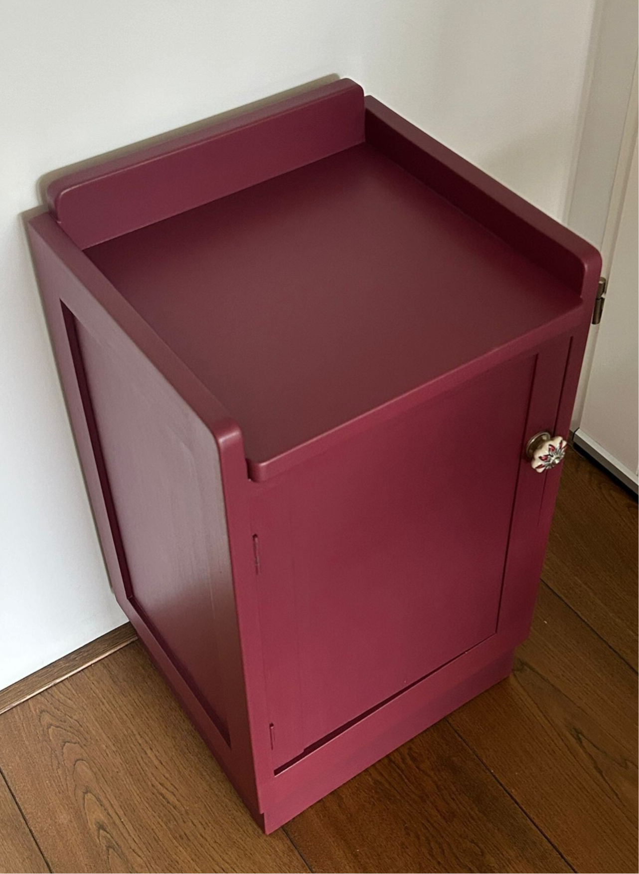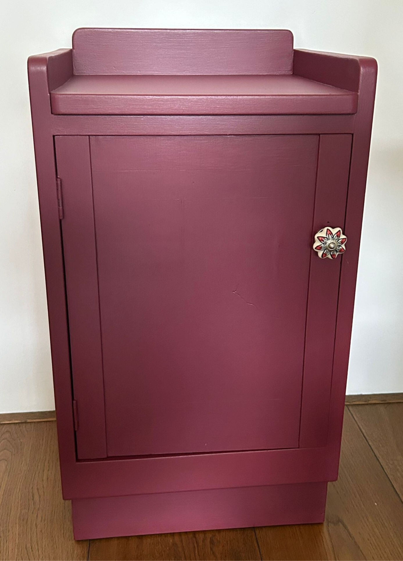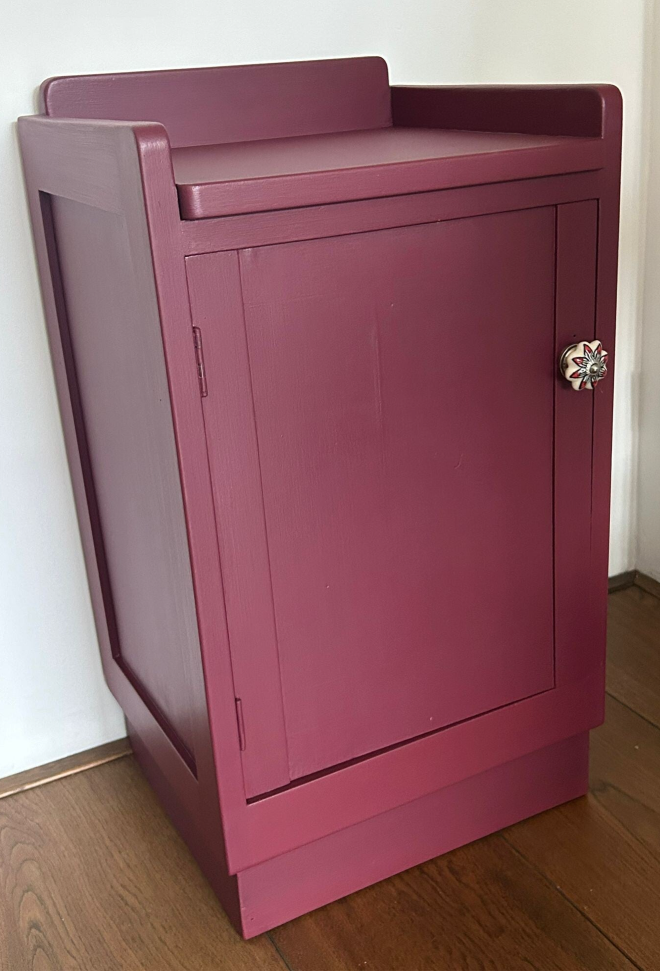 Een art deco vormgegeven wandkastje / nachtkastje. Door zijn aparte vormgeving reeds een uniek kastje, maar door de kleur en knopje helemaal one of a kind. De kleur is Highlander van Fusion Mineral Paint, wat zich als een mooi en warm rood laat omschrijven. Door deze kleur in je inrichting toe te voegen creer je direcht warmte en gezelligheid. Uiteraard kan het niet anders dan dat de tijd zijn sporen heeft achter gelaten, maar dit is zeker niet storend. Functioneel is deze mooie dame zeker nog!