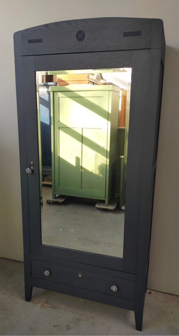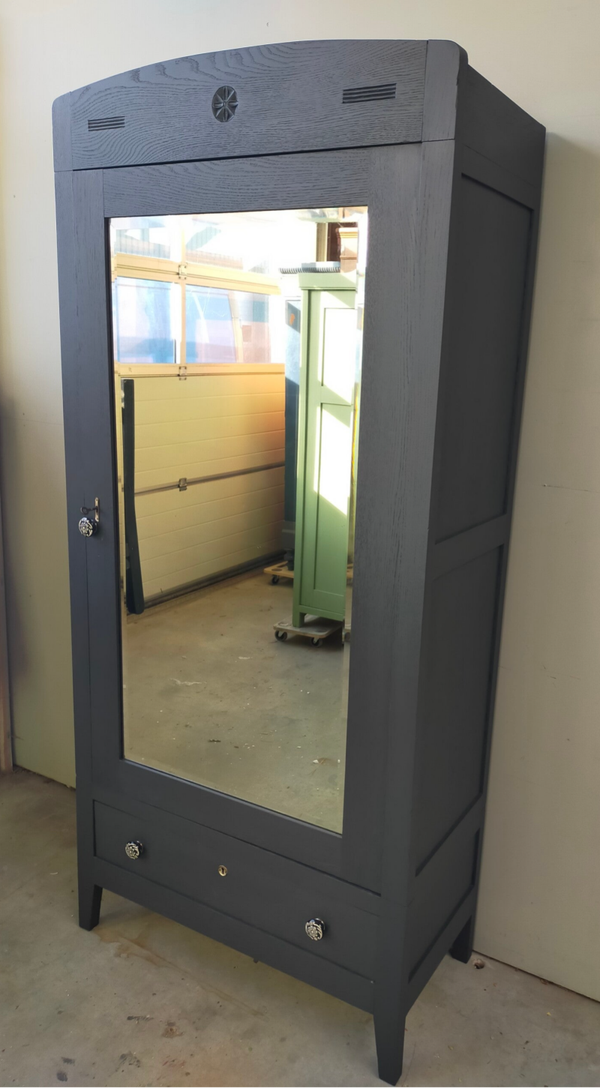 Gewoon weg WAUW ! Deze kast, ook wel spiegelkast, kan uitstekend dienen als linnen en/of garderobe kast, maar uiteraard ook prima als servieskast. De prachtige facet geslepen spiegel is gezien zijn leeftijd echt nog in topvorm net zoals de kast zelf. Wel is het belangrijk dat de kast "goed staat" zodat de deur goed kan sluiten. Staat hij wat uit het lood, kan hij ietsje pietsje klemmen. Hoe dan ook, de kast heeft binnenin heerlijk wat planken en een werkend slot met sleutel op deur ontbreekt niet. Ook de lade onder in is natuurlijk top, voor nog meer opbergruimte en wat dacht je van de toffe bijpassende knoppen? De kleur Ash, donker antraciet, van Fusion Mineral Paint is hier gebruikt, wat haar erg goed past al zeggen wij het zelf. Ondanks dat deze dame op leeftijd is, past ze wat ons betreft nu ook in een wat strak en/of industrieel interieur. De kast is ook nog demontabel, wat het dan weer makkelijk maakt om hem boven te plaatsen of tzt mee te verhuizen :-) Uiteraard kan het niet anders dan dat de tijd zijn sporen heeft achter gelaten, maar dit is zeker niet storend. Functioneel is deze mooie dame zeker nog!