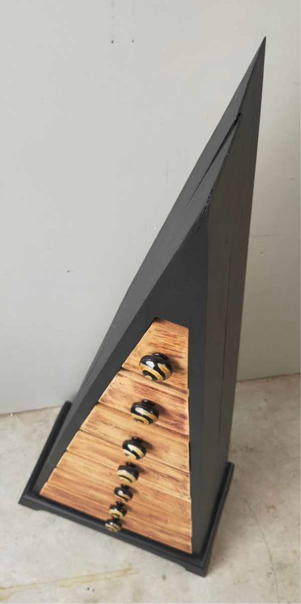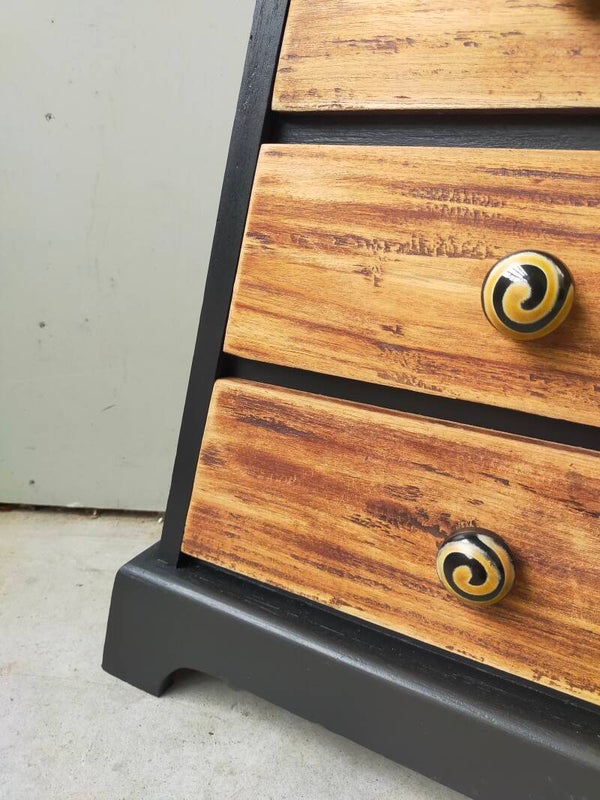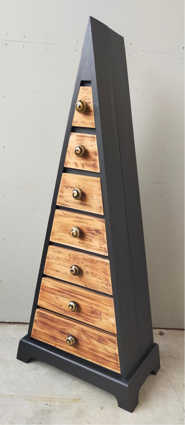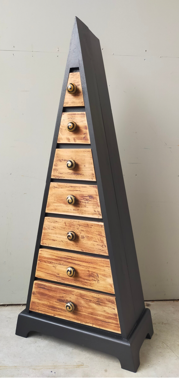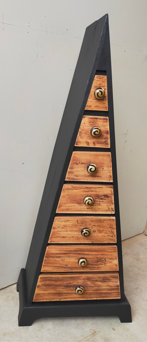 Waanzinnig leuke en aparte vormgeving! Deze pyramide ladenkast heeft een combinatie van warm hout en mooi mat zwart. De kleur Coal Black van Fusion Mineral Paint is hier gebruikt. De knoppen op de lades passen hier uitstekend bij en maakt het geheel tot iets unieks en moois. Uiteraard kan het niet anders dan dat de tijd zijn sporen heeft achter gelaten, maar dit is zeker niet storend. Functioneel is deze kanjer zeker nog!