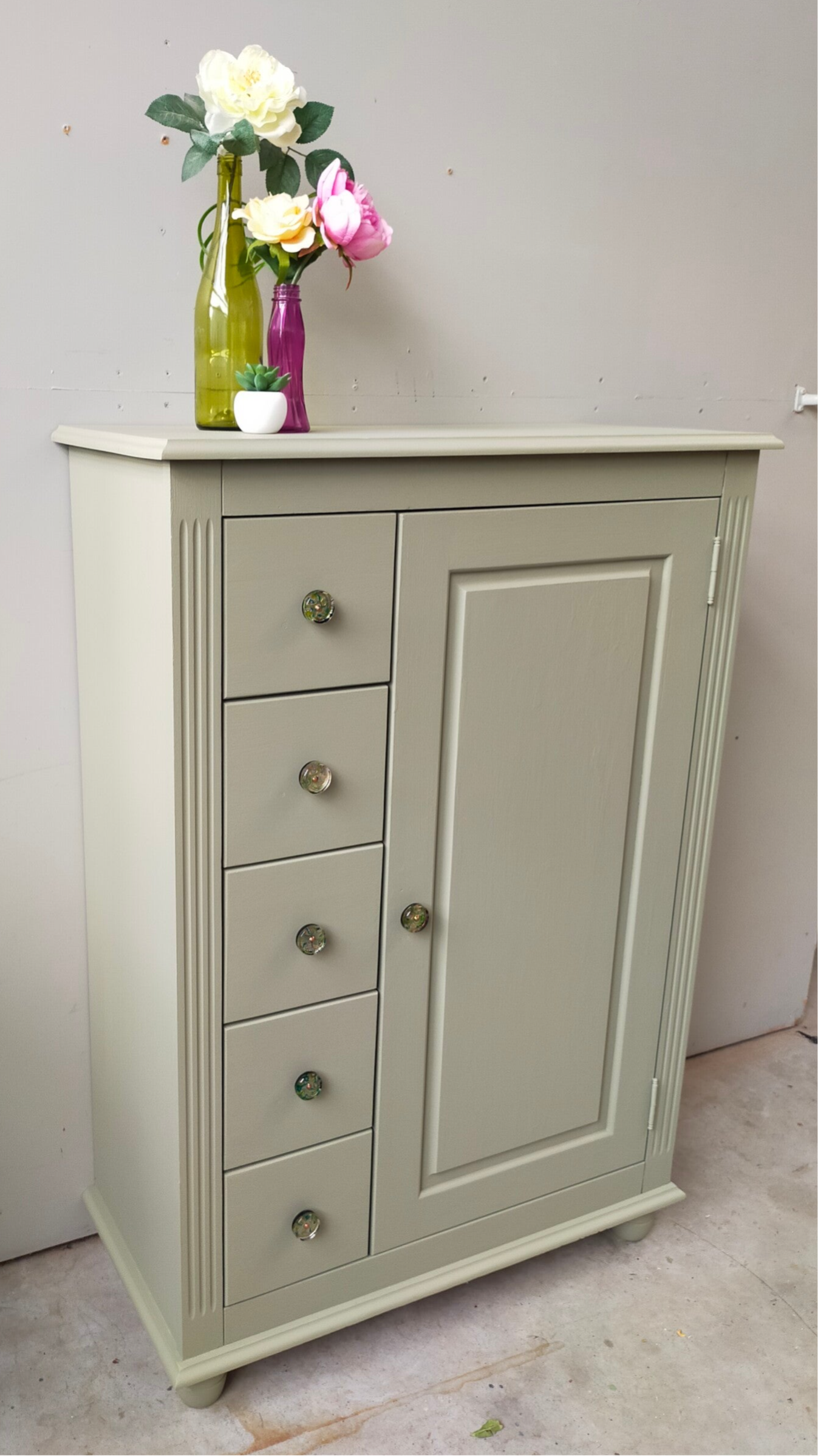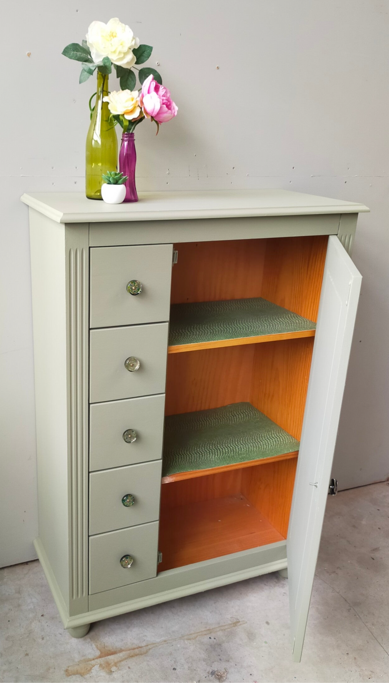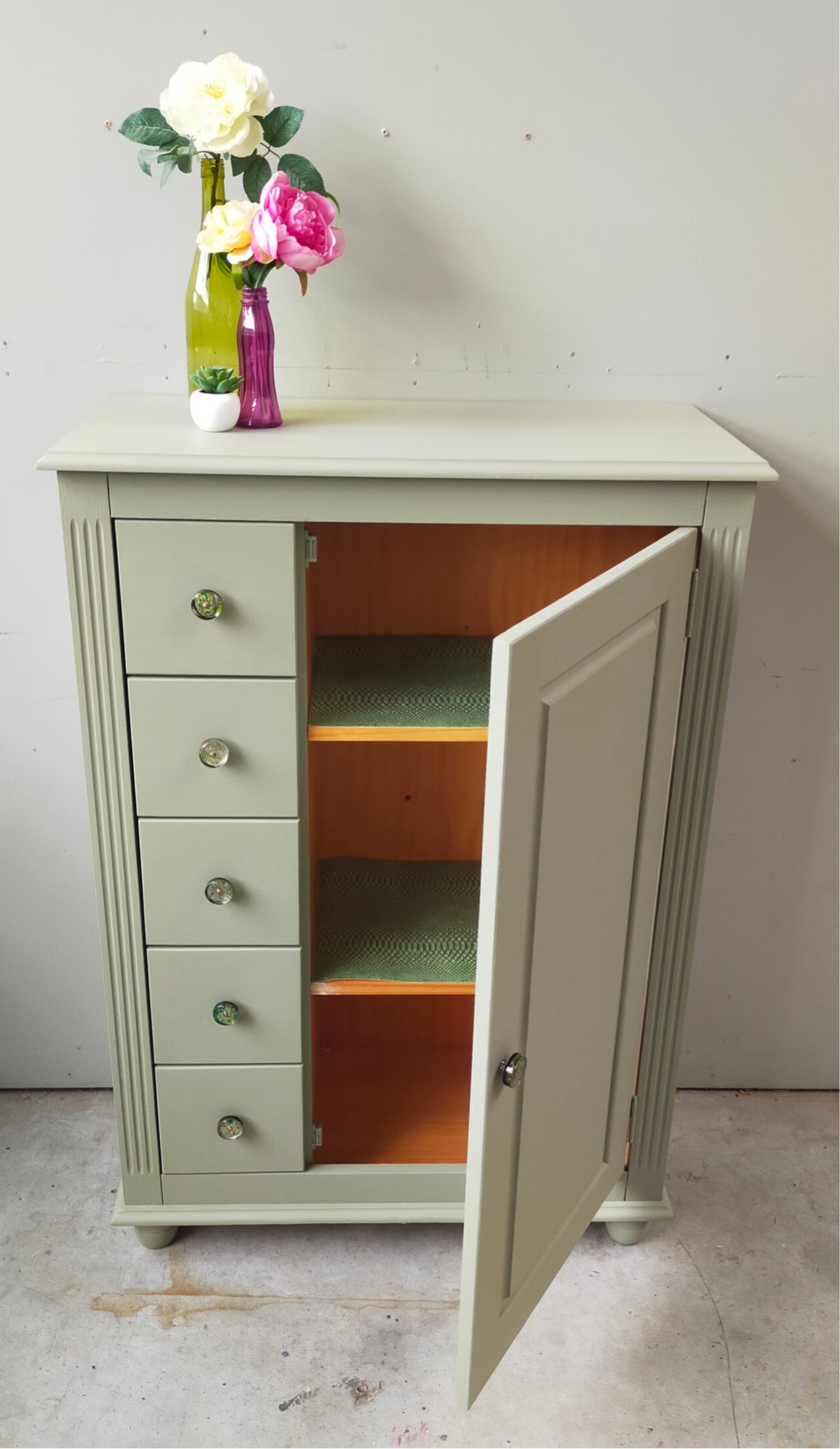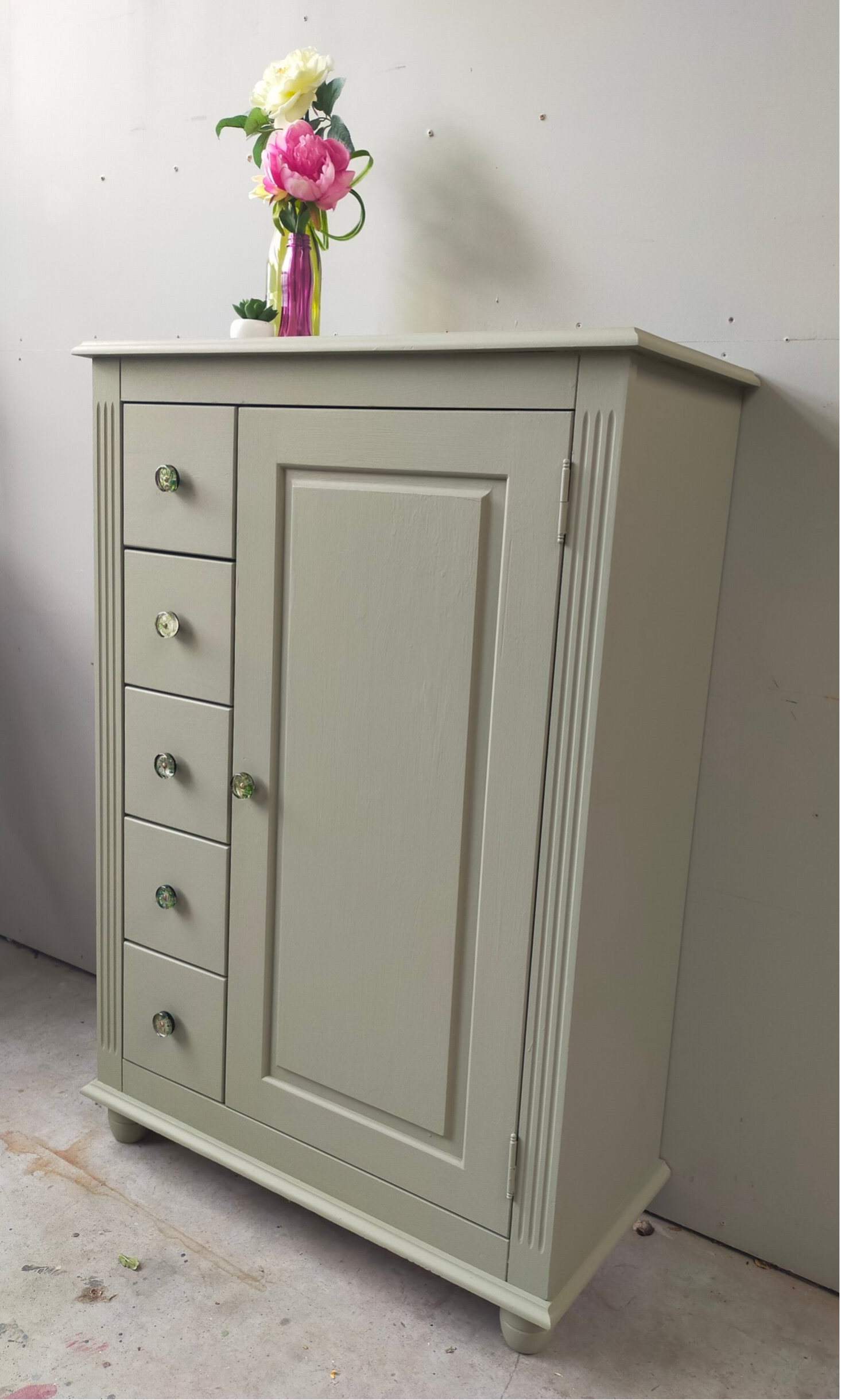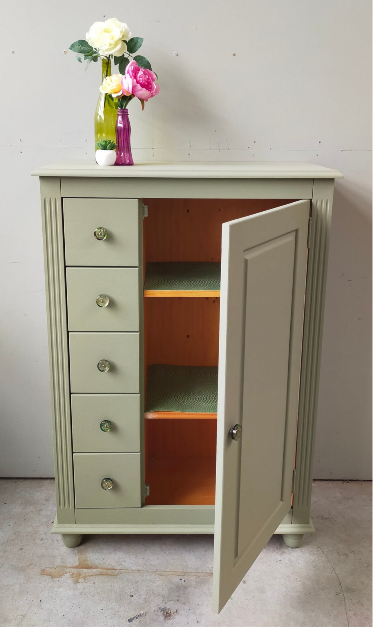 Een prettig model /maatje, deze zogenaamde spekkast. Met zowel lekker wat lades, als een deur met daar achter legplanken. Deze zijn tevens voorzien van een mooie design. De kleur Lichen is hier gebruikt van Fusion Mineral Paint. Deze kleur is een mooie vergrijsde groen tint, wat wat ons betreft erg goed werkt op deze kast. De knoppen die we hebben gebruikt combineren wat ons betreft uitstekend en wat zijn ze tof! Maakt het geheel helemaal af! Uiteraard kan het niet anders dan dat de tijd zijn sporen heeft achter gelaten, maar dit is zeker niet storend. Functioneel is deze mooie dame zeker nog!