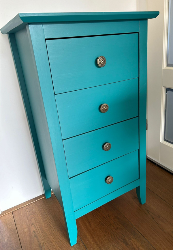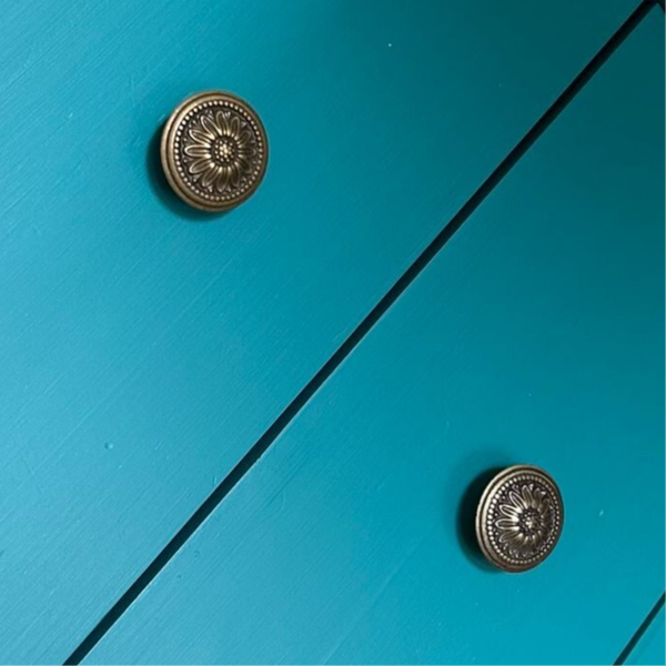Een lekker formaatje, redelijk strakke vormgeving, maar ooooh de kleur en de authentieke knoppen maken dit toch weer helemaal leuk! De kleur Renfrew Blue van Fusion Mineral Paint is hier gebruikt, wat zich als een lagune blauw het beste laat omschrijven. Uiteraard kan het niet anders dan dat de tijd zijn sporen heeft achter gelaten, maar dit is zeker niet storend. Functioneel is deze kanjer zeker nog!