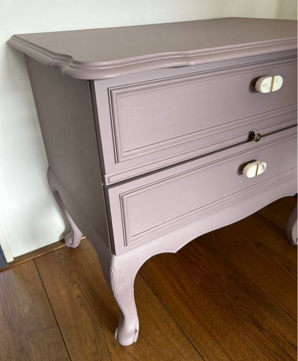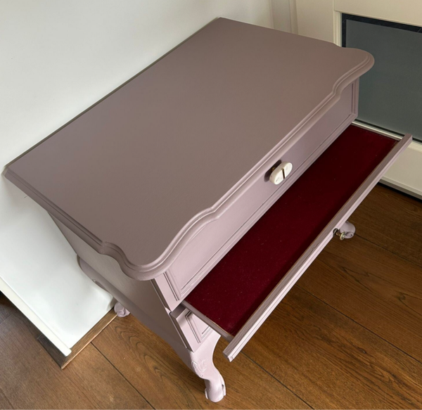 Zoet, zoeter, zoetst! Dat is wat er boven komt drijven als we naar dit kastje kijken. Wauw, wat staat de kleur haar goed en wat dacht je van die waanzinnig toffe knoppen!! De kleur is Lavender Haze van Fusion Mineral Paint, een mooi lila kleur. De vormgeving, de kleur, het extra uitschuif plankje.....alles maakt dat dit een tof ladenkastje is. Uiteraard kan het niet anders dan dat de tijd zijn sporen heeft achter gelaten, maar dit is zeker niet storend. Functioneel is deze mooie dame zeker nog!