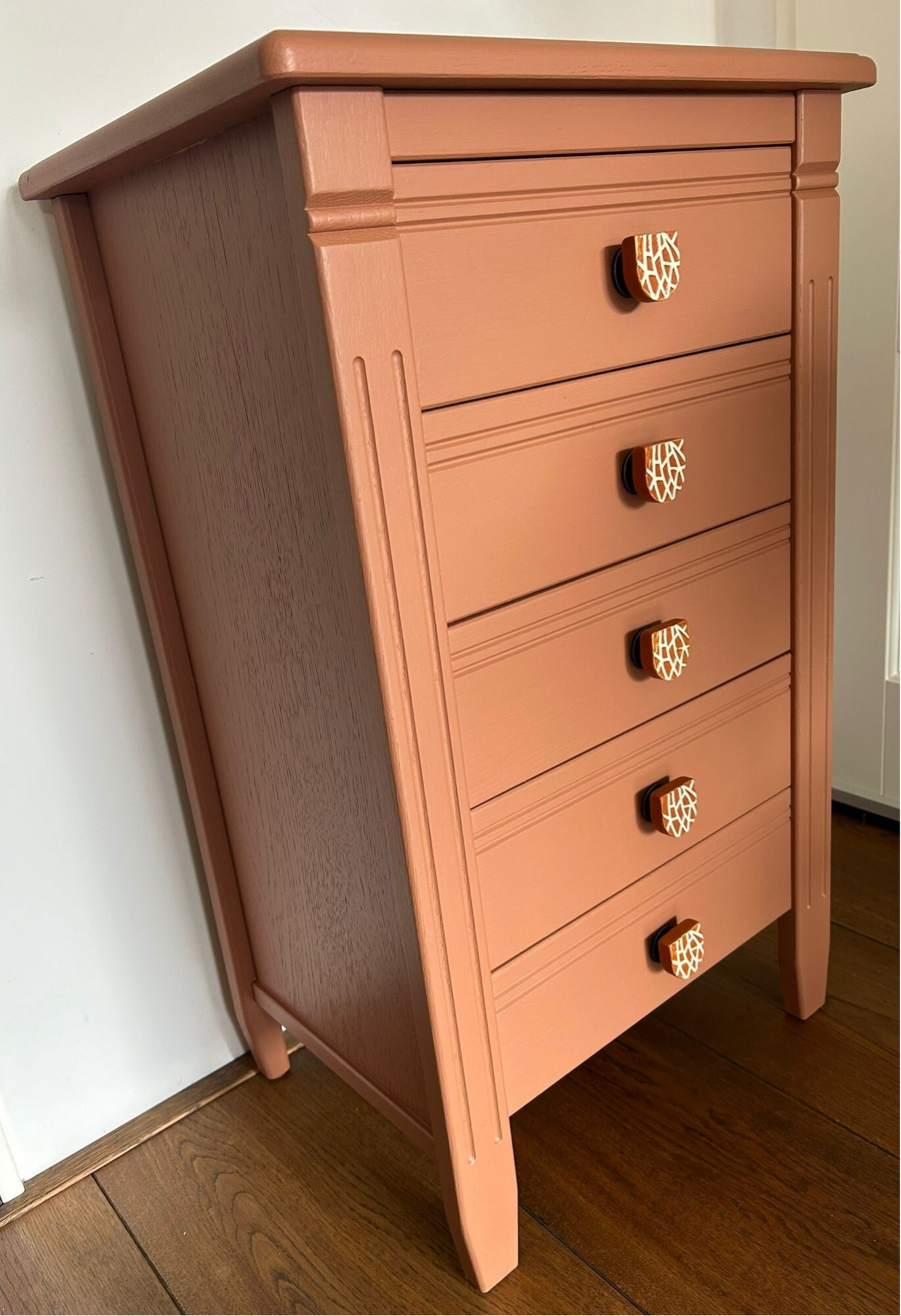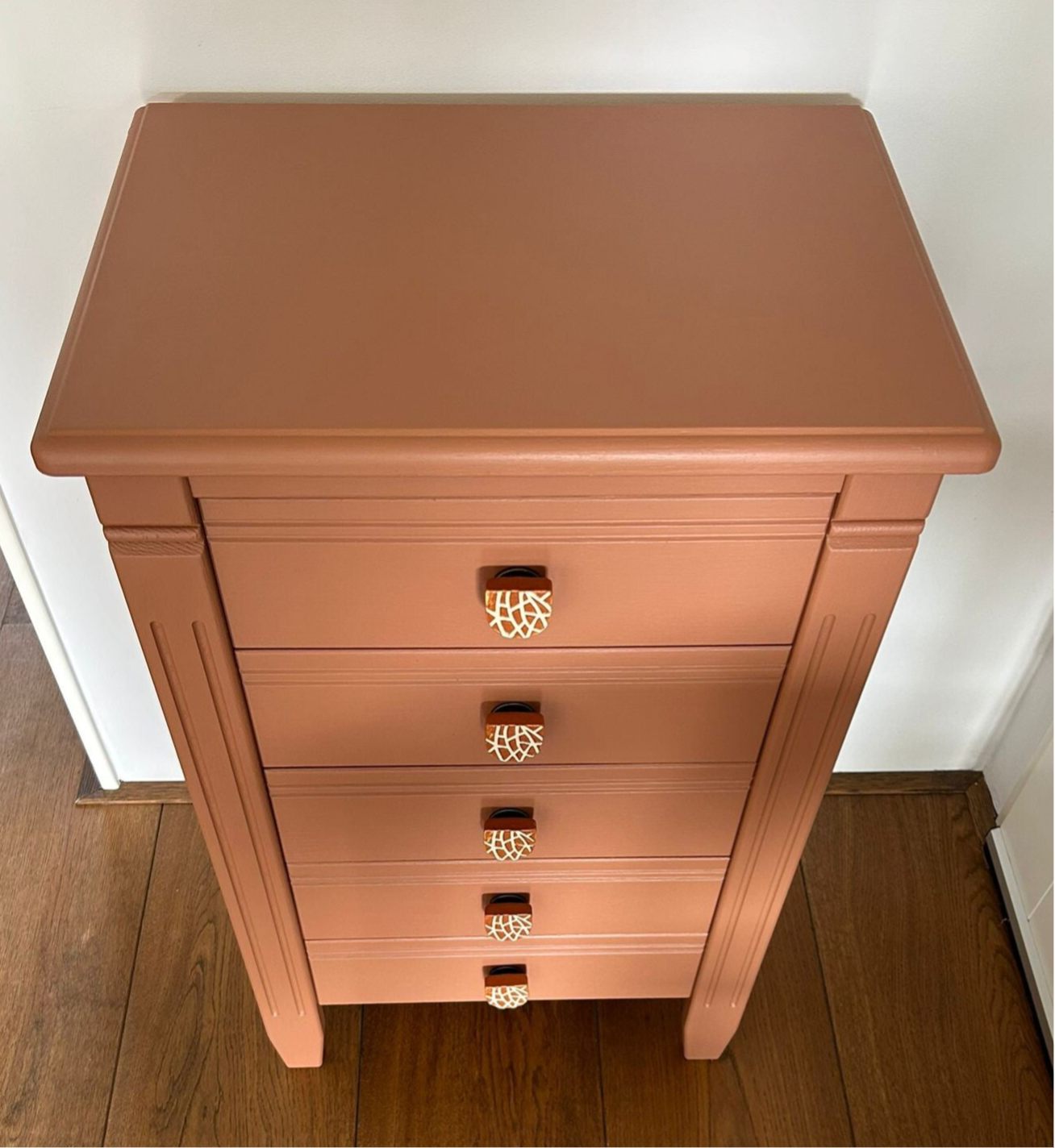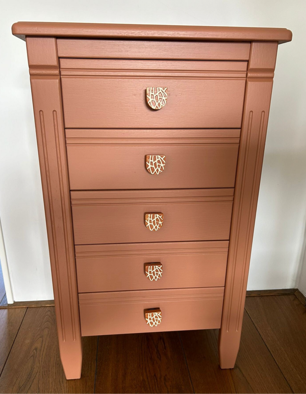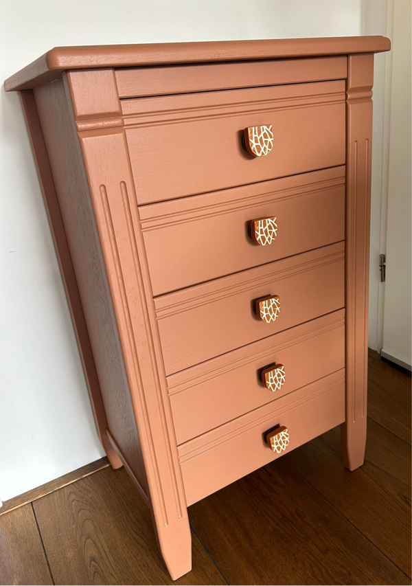 Een heerlijk ladekastje in een van de nieuwe kleuren van Fusion Mineral Paint, te weten Iron Clay. Het laat zich goed omschrijven als een warm terra. De combinatie met de knoppen is hier helemaal leuk wat ons betreft. De mooie vormgeving, het verfijnde houtsnij werk en de soepel lopende laatjes maken het een lust voor het oog. Uiteraard kan het niet anders dan dat de tijd zijn sporen heeft achter gelaten, maar dit is zeker niet storend. Functioneel is deze mooie dame zeker nog!
