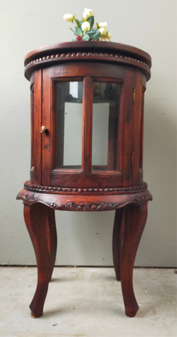 Waanzinnig mooi, zogenaamd, theekastje. Een ronde vorm, te gek houtsnijwerk en rondom glas. Het dienblad is afneembaar en aan beiden kanten een deurtje in het kastje zodat je er altijd overal bij kan. Uiteraard kan het niet anders dan dat de tijd zijn sporen heeft achter gelaten, maar dit is zeker niet storend. Functioneel is deze mooie dame zeker nog!