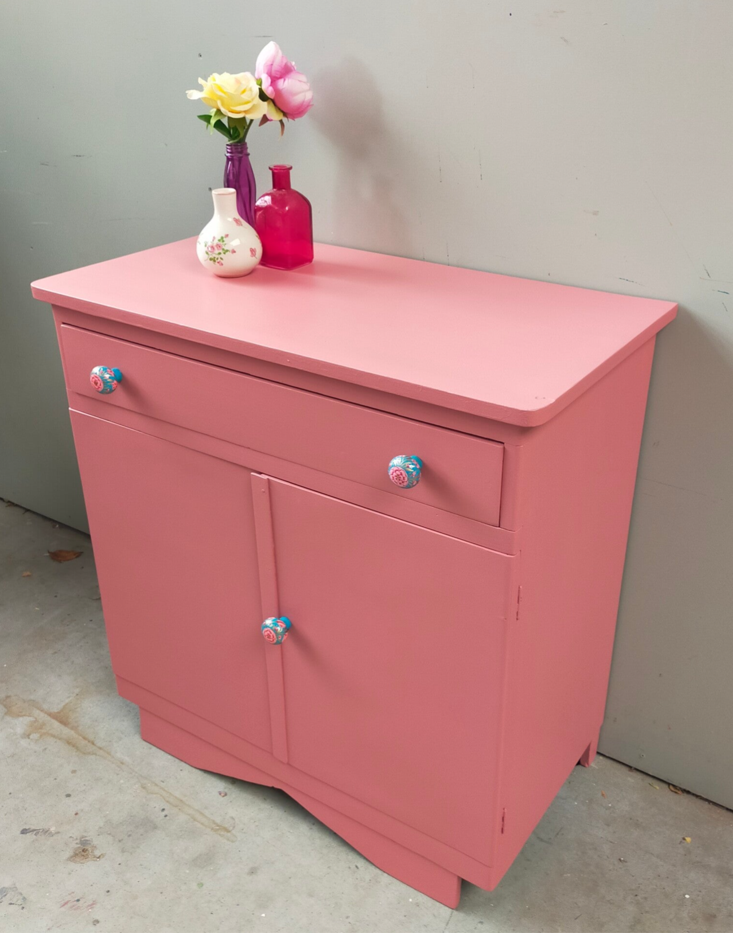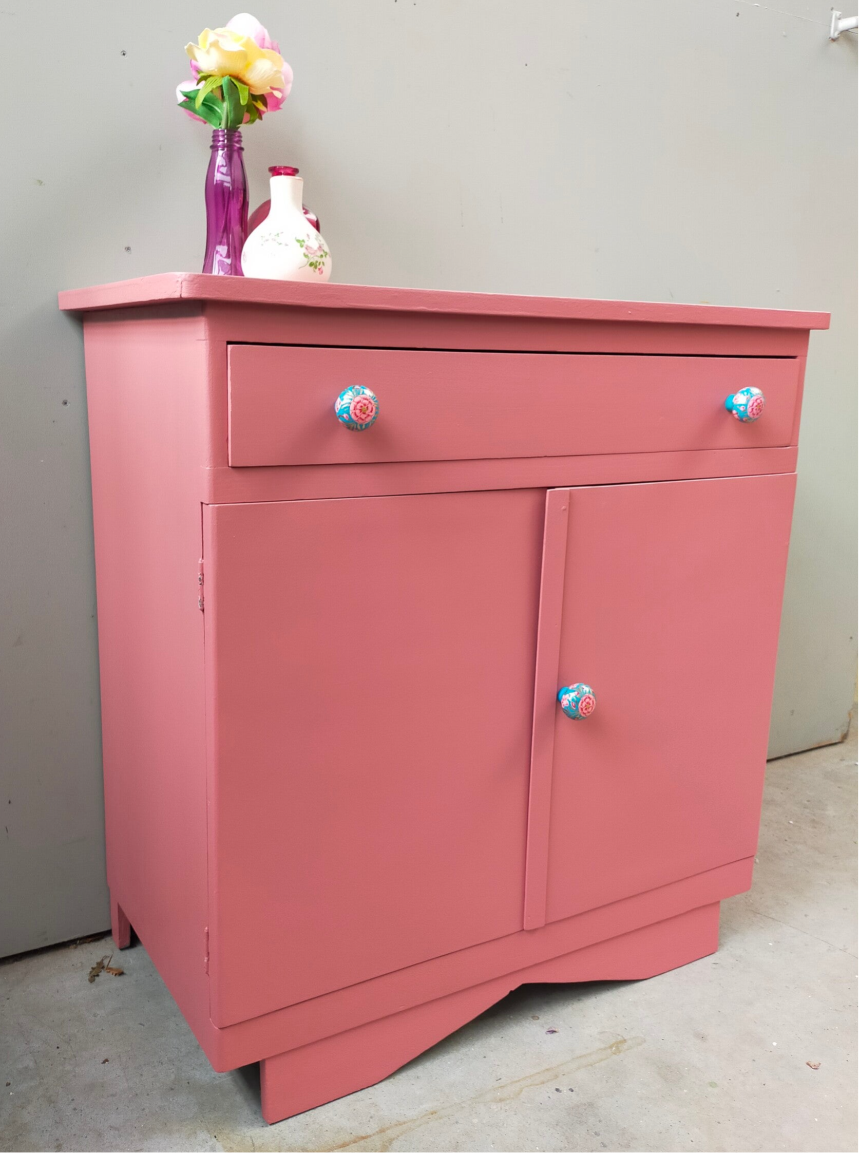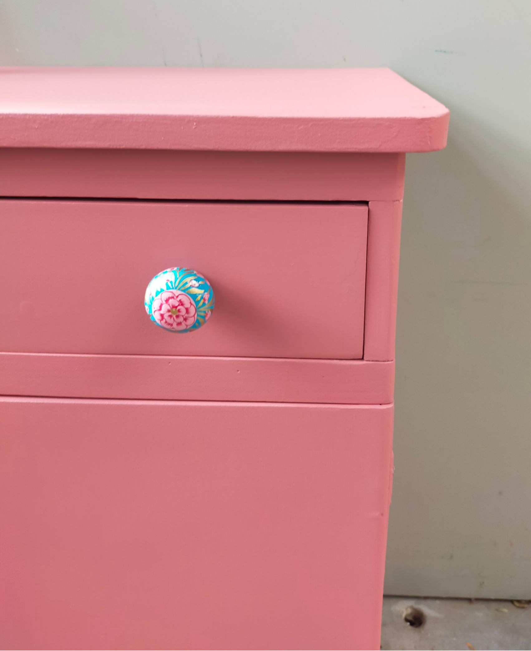 Voor z'n kastje heb je toch als snel plek? Een vrolijkerd, dat is ze zeker. Niet perse zwaar in gewicht, maar wel een statement in de (kinder) kamer, toch? Er is hier gewerkt met een mixkleur van Fusion Mineral Paint en de bijpassende knopjes mogen hier natuurlijk niet ontbreken. Uiteraard kan het niet anders dan dat de tijd zijn sporen heeft achter gelaten, maar dit is zeker niet storend. Functioneel is deze knapperd zeker nog!