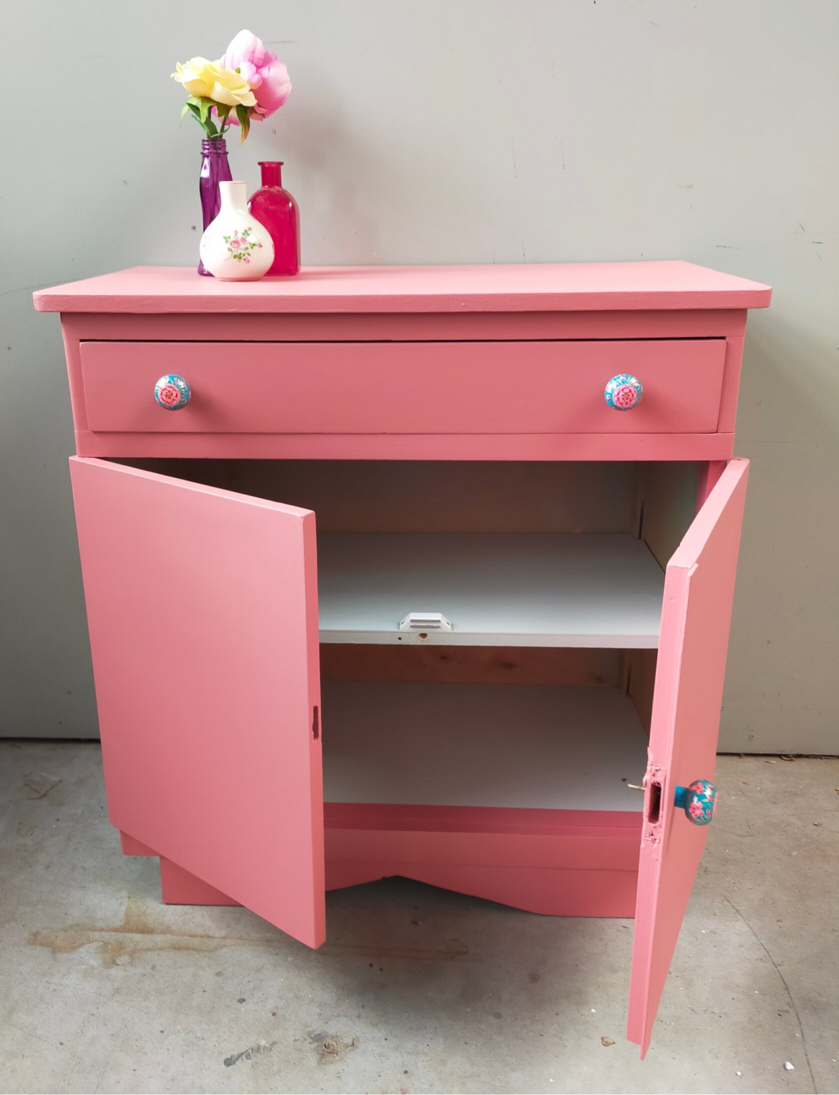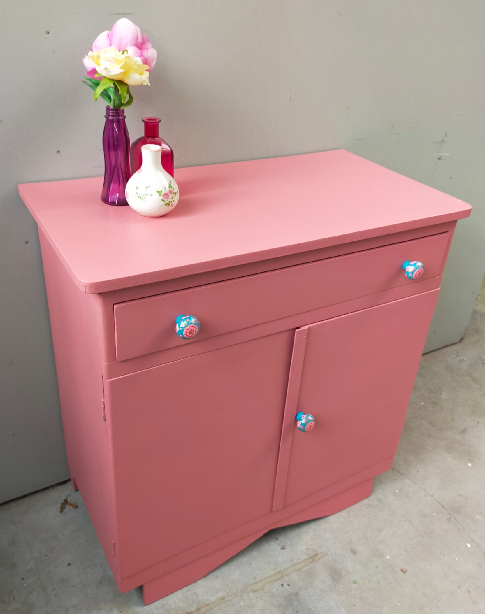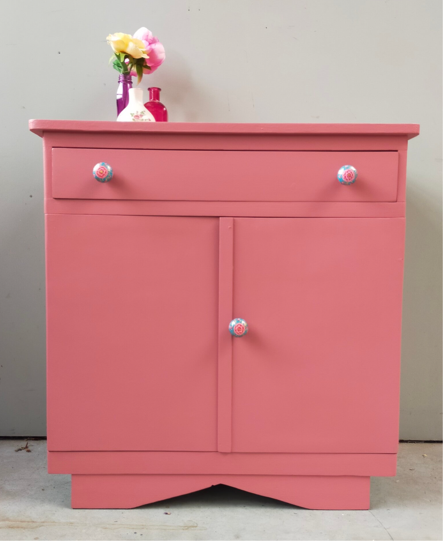 Voor z'n kastje heb je toch als snel plek? Een vrolijkerd, dat is ze zeker. Niet perse zwaar in gewicht, maar wel een statement in de (kinder) kamer, toch? Er is hier gewerkt met een mixkleur van Fusion Mineral Paint en de bijpassende knopjes mogen hier natuurlijk niet ontbreken. Uiteraard kan het niet anders dan dat de tijd zijn sporen heeft achter gelaten, maar dit is zeker niet storend. Functioneel is deze knapperd zeker nog!