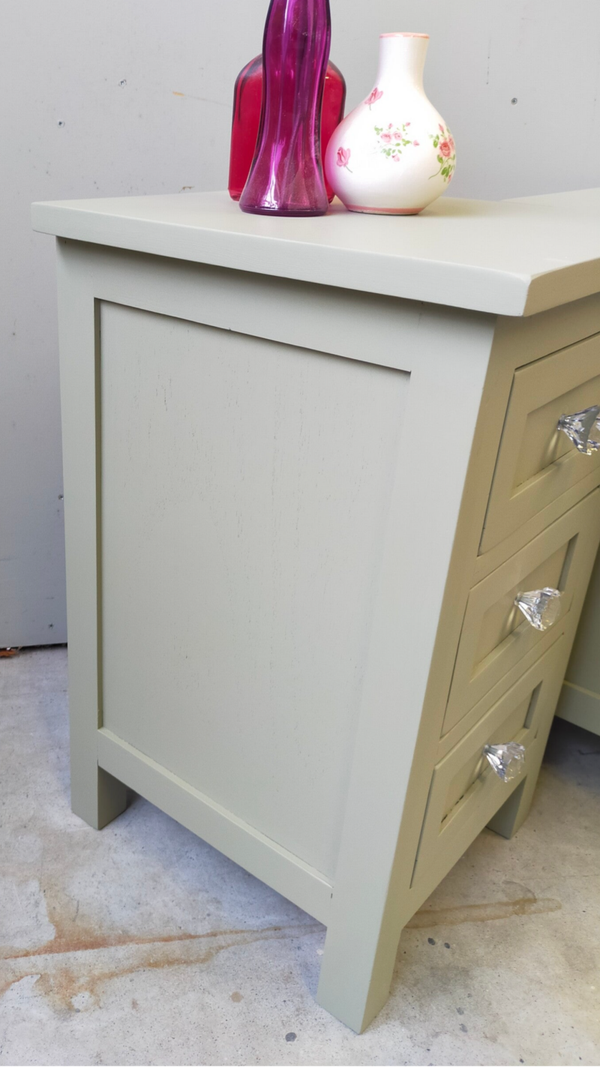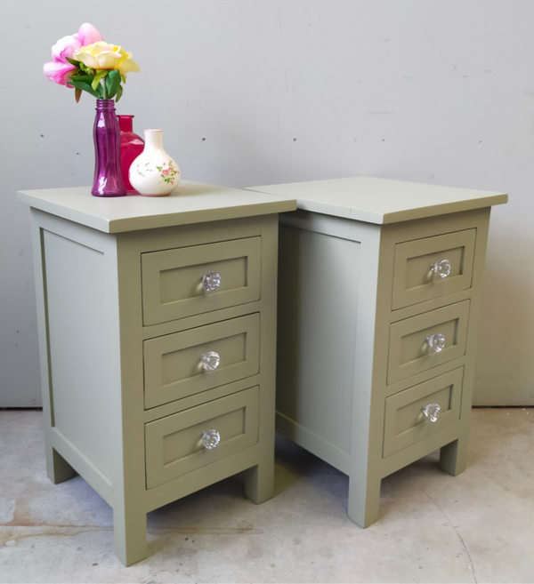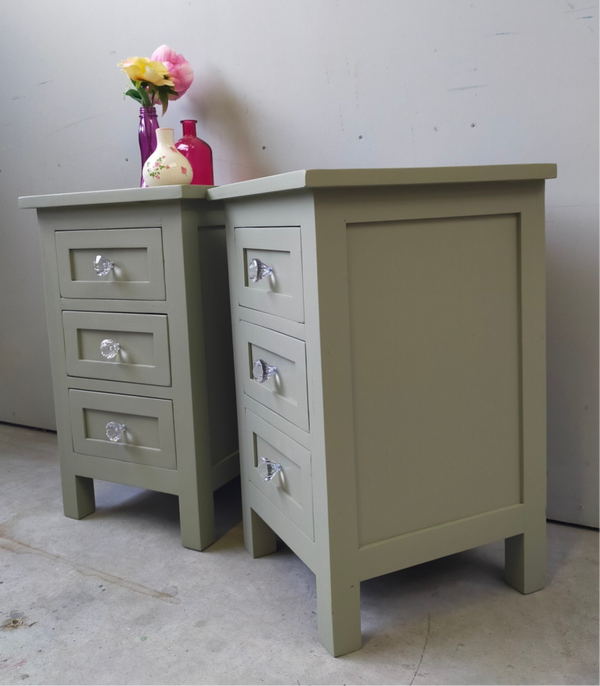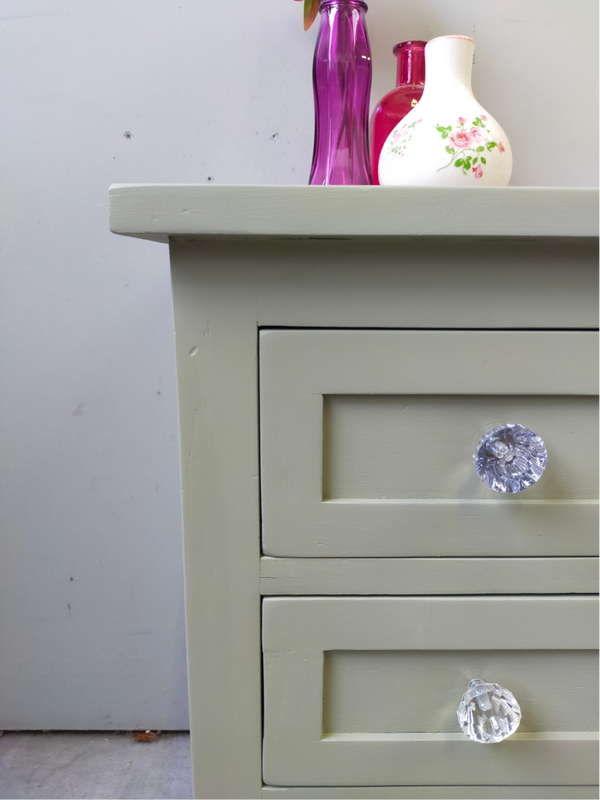 Deze set nachtkastjes, met hun subtiele houtsnijwerk/belijning, staan in de kleur Lichen van Fusion Mineral Paint. Deze kleur laat zich het best omschrijven als een licht groene tint, met een enigszins grijze ondertoon. De laadjes sluiten goed en na behoren. De leuke knopjes maken het geheel helemaal af.