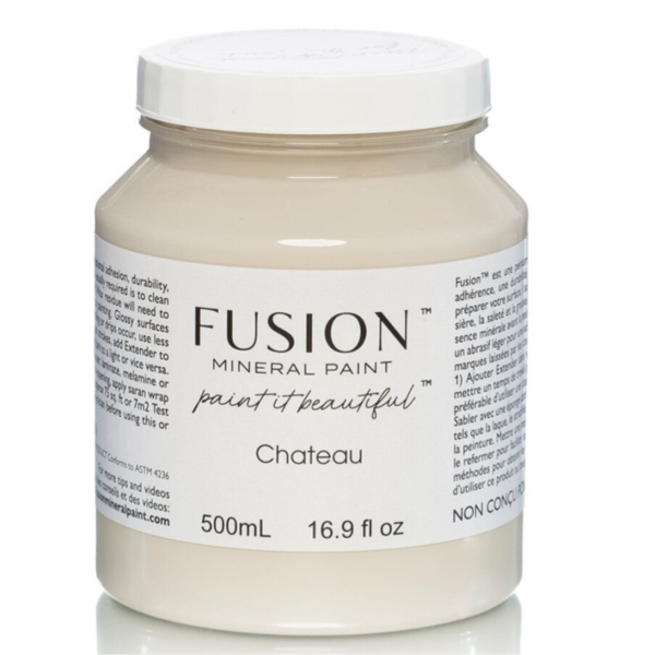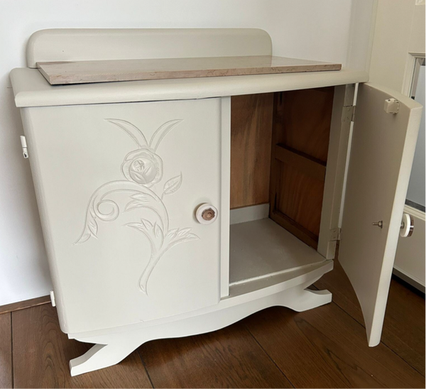 Een kasteelwaardig kastje, rechtstreek uit Frankrijk! Dus ook gekozen voor een kasteelwaardige kleur, te weten Chateau van Fusion Mineral Paint. De kleur laat zich omschrijven als een warme en lichte beige tint, wat weer uitstekend gaat met het marmer blad. De knopjes mochten natuurlijk niet ontbreken en passen er wat ons betreft ook weer uitstekend bij. Uiteraard kan het niet anders dan dat de tijd zijn sporen heeft achter gelaten, maar dit is zeker niet storend. Functioneel is deze mooie dame zeker nog!