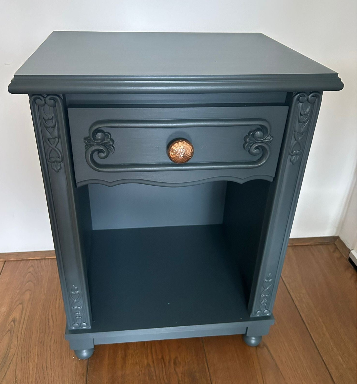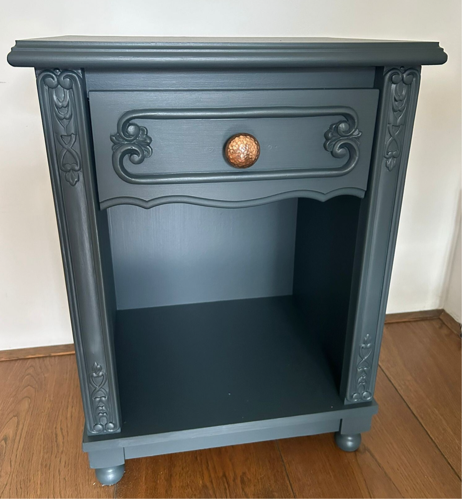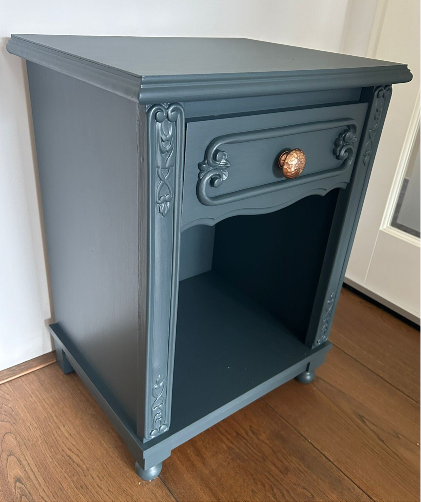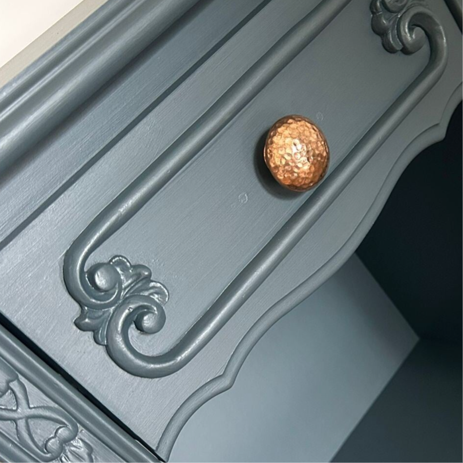 Bijzonder kastje, bijzondere vormgeving en een waanzinnig kleurtje! Chestler van Fusion Mineral Paint, is een mooi warm blauwe kleur met een enigszins lagune groen/blauwe ondertoon. Het vervijnde houtsnijwerk en het beslag komt hier op uitstekend tot hun recht. Uiteraard kan het niet anders dan dat de tijd zijn sporen heeft achter gelaten, maar dit is zeker niet storend. Functioneel is deze mooie dame zeker nog!