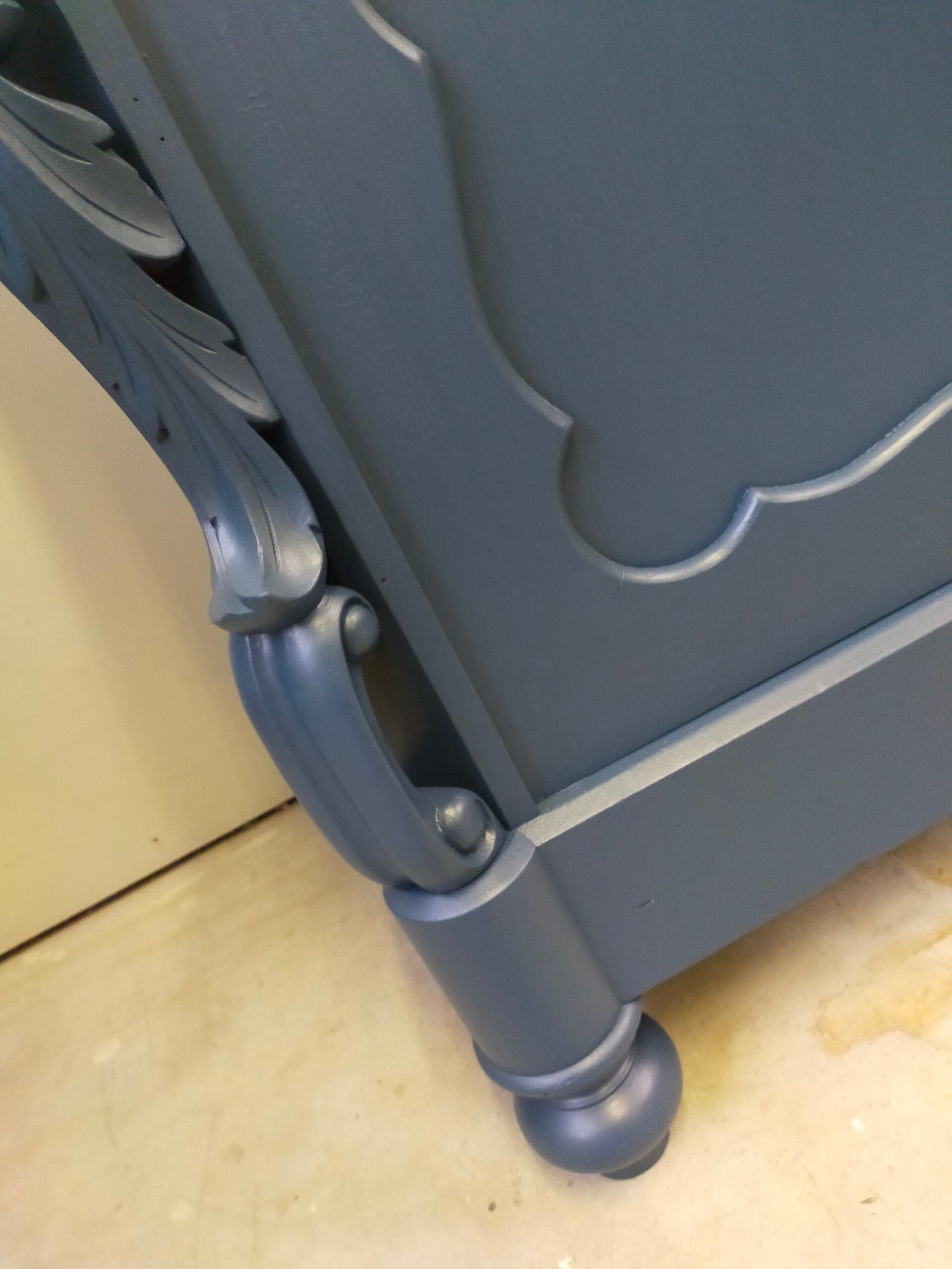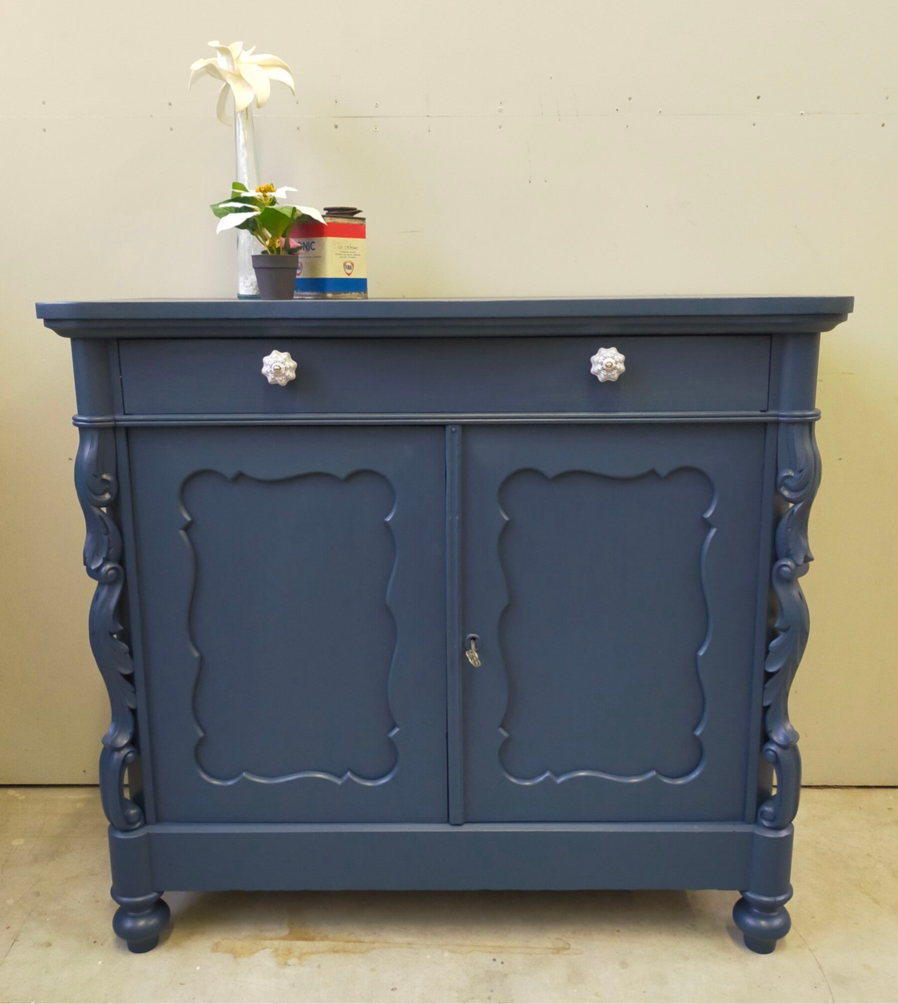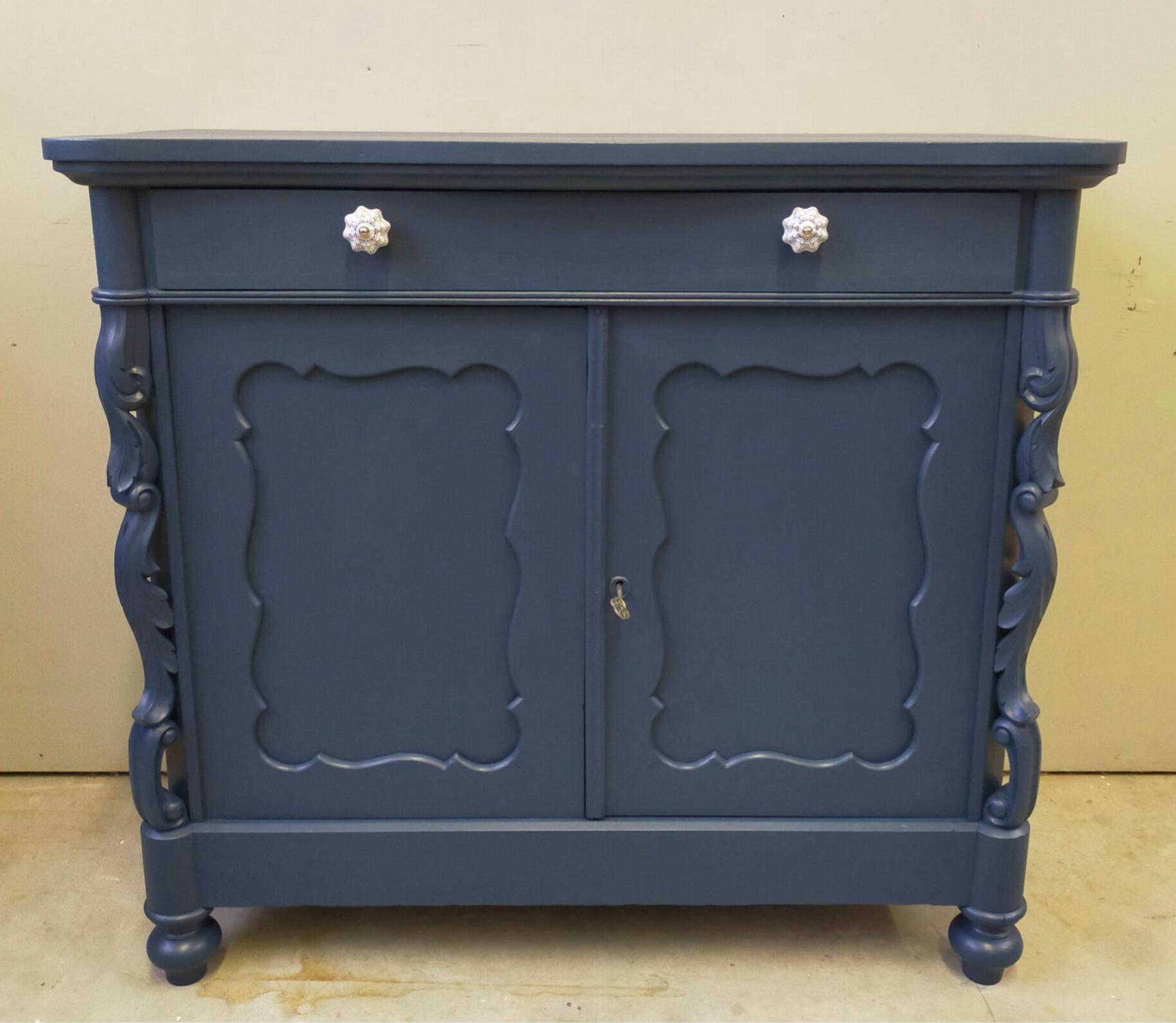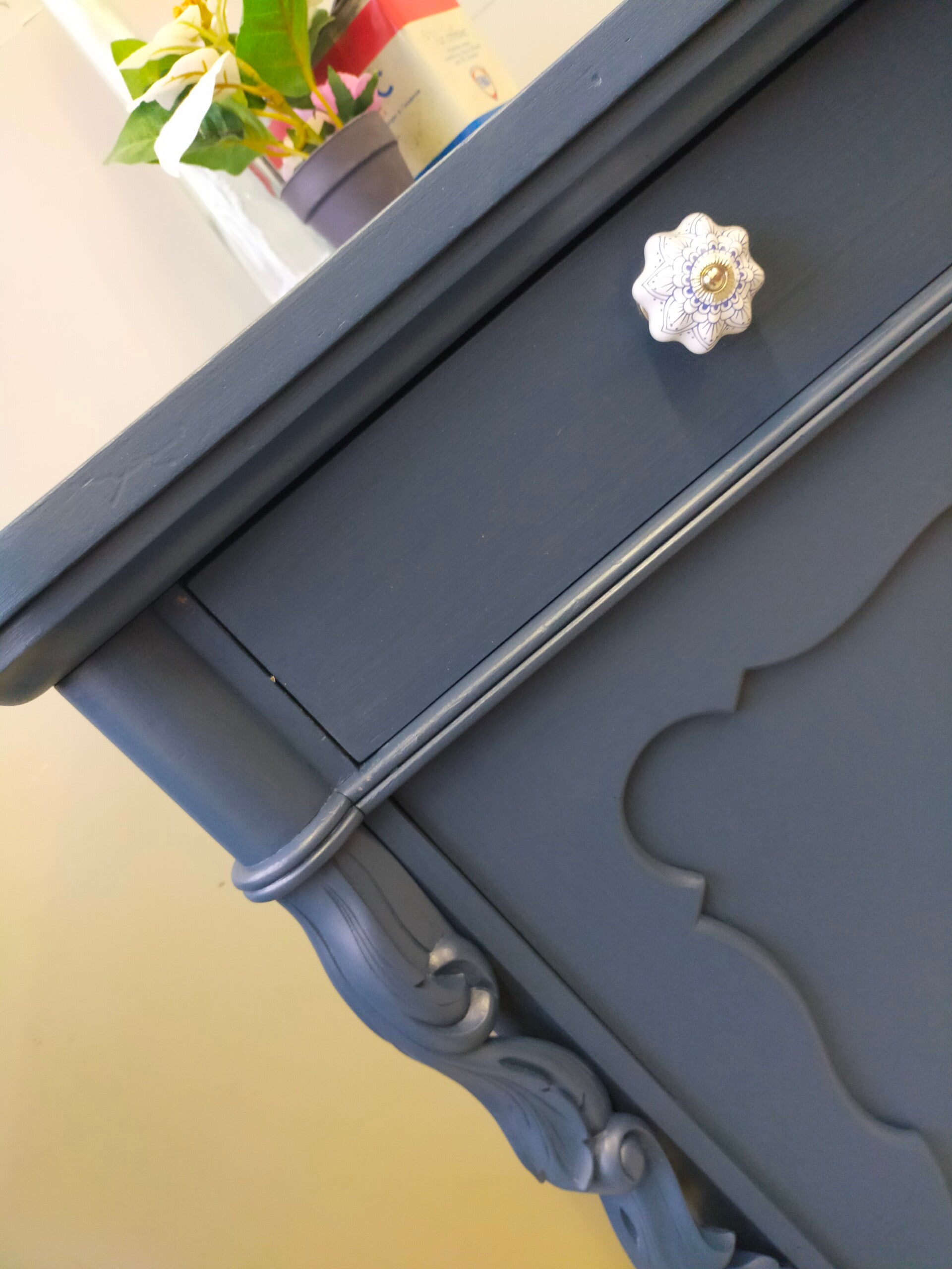 Wauw, wat een knapperd deze Biedermeijer Meidenkast. De vormgeving, het houtsnijwerk....echt met aandacht gemaakt! Ze staat in de mooie intense blauwe kleur Willowbank van Fusion Mineralpaint. Ook de binnenkant heeft een leuke design wat dan weer erg goed bij het geheel past. De kast kan goed dienen als dressoior, maar ook als commode. Achter de deurtjes nog een plank voor genoeg opbergruimte. Ook de lade werkt goed mee, dus ook daar is een hoop in op te ruimen. Hierop hebben we mooie bijpassende porseleinen knoppen gezet. De deurtjes sluite overiges ook goed en is middels de sleutel af te sluiten.