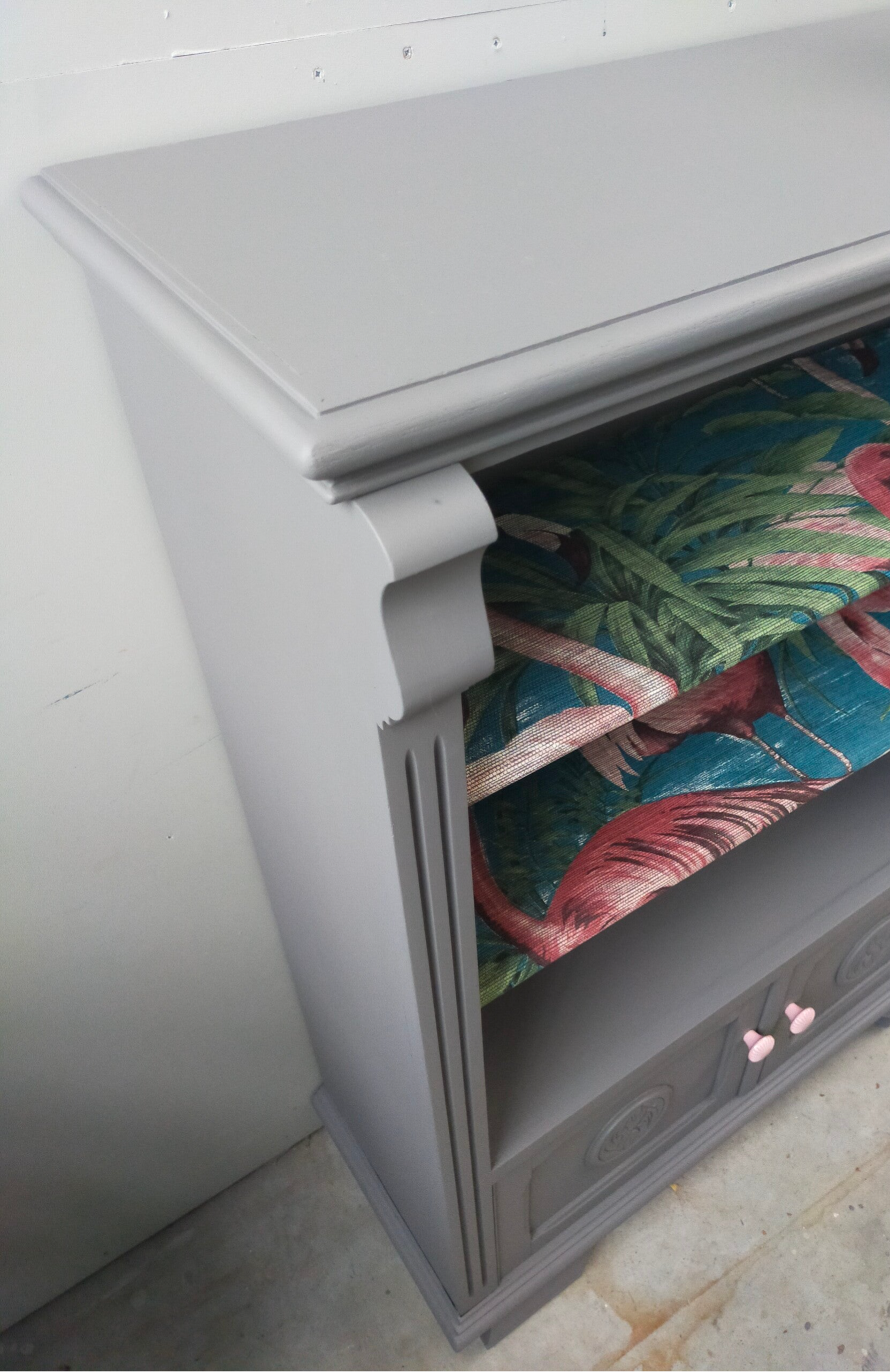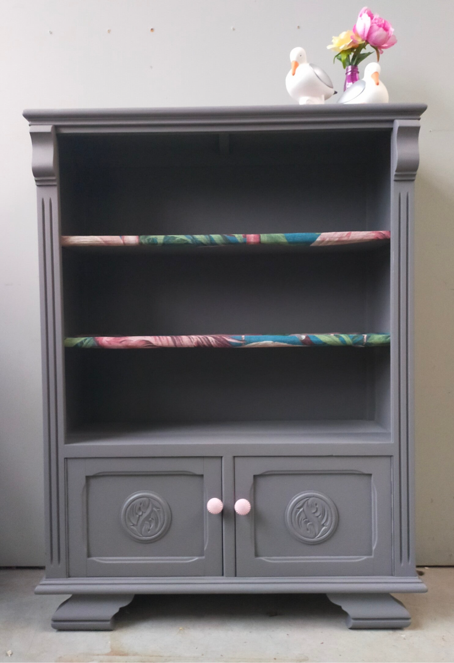 Een fantastisch open kastje, uitstekend te gebruiken als boekenkast, maar sluit natuurlijk niet uit dat het voor andere doeleinde geschikt is. Tevens ook een goede opberger, gezien de deurtjes onderop. Hier valt een hoop achter weg te stoppen. Deze kast staat in de kleur Hazelwood van Fusion Mineral Paint. Dit laat zich omschrijven als een warm grijs. De planken hebben een heerlijk tropische uitstraling gekregen wat in combinatie met de knopjes het helemaal leuk doet! Het geheel samen maakt dat deze kast een eigentijdse uitstraling krijgt. Verder kent de kast wat verfijnde details zoals het houtsnijwerk in de omlijsting alsmede op de deurtjes.