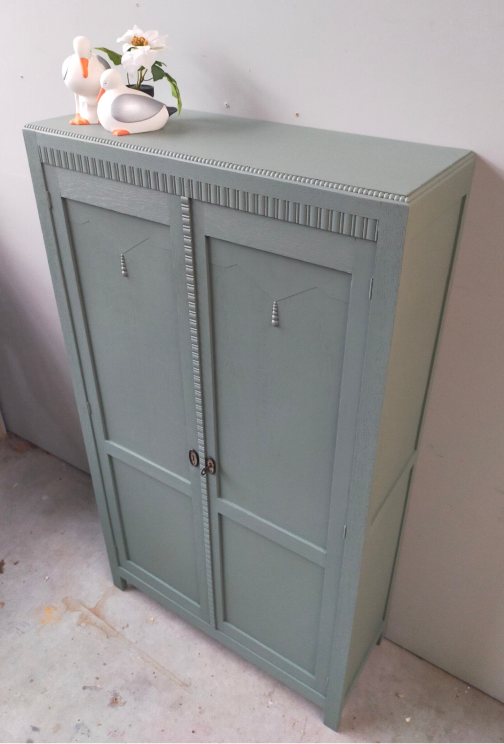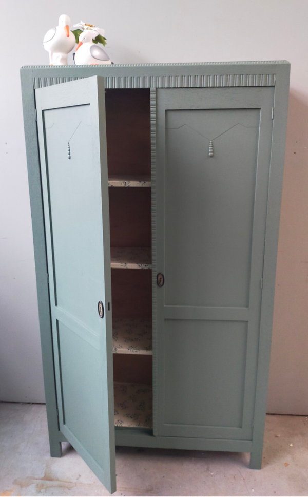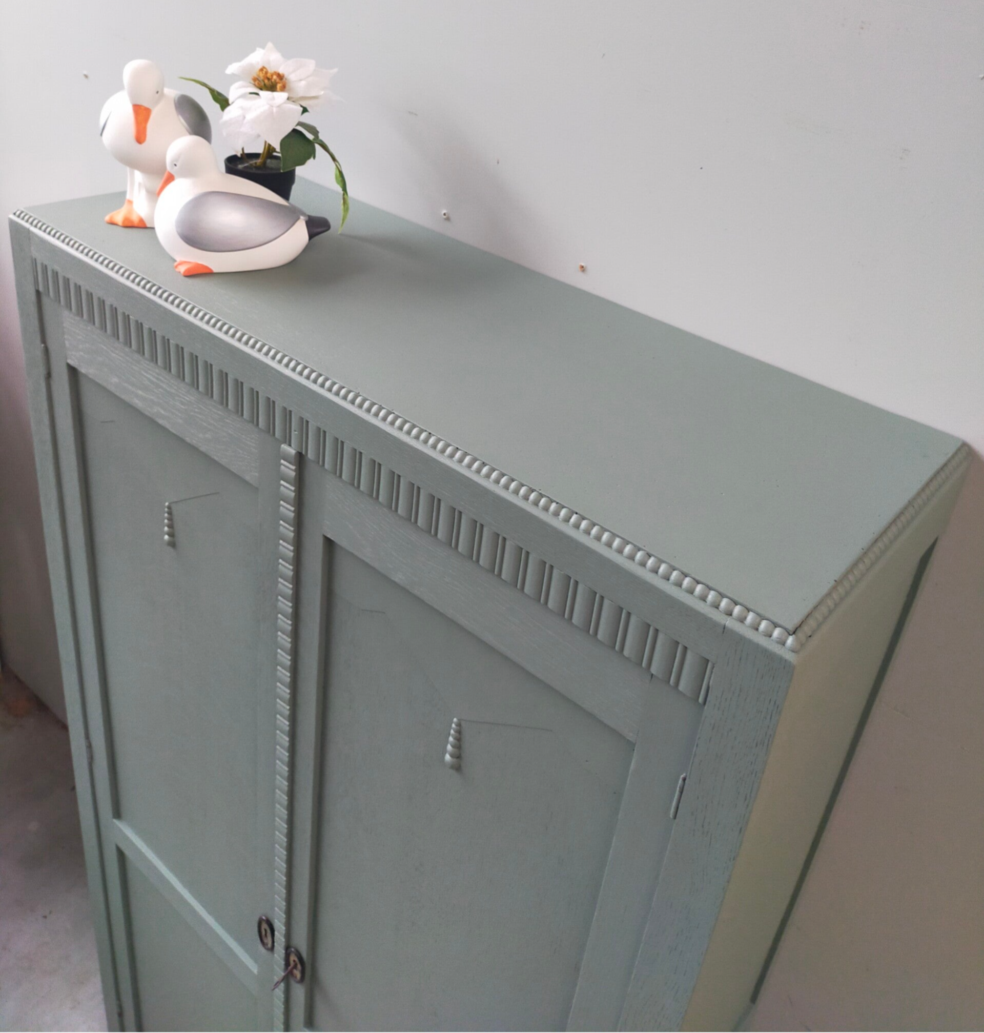De kleur Carriage House van Fusion Mineral Paint is hier gebruikt, wat zich goed laat omschrijven als een lagune groene kleur. De kastdeurtjes sluiten goed, wel is het belangrijk dat de kast "goed" staat. Mocht ze onverhoopt wat uit het lood staan dan gaat het iestje stroever. Maar neemt niet weg dat het een fantische leuke en tegelijkertijd pracktische kast is.