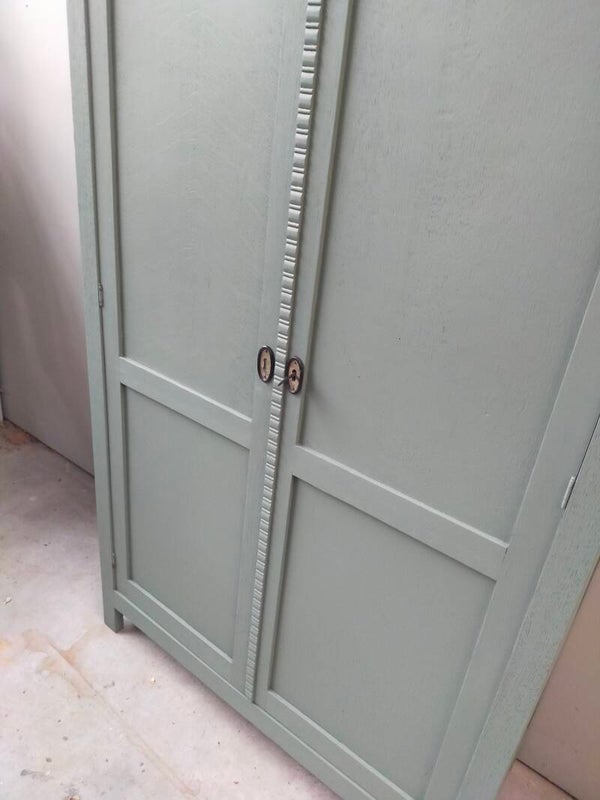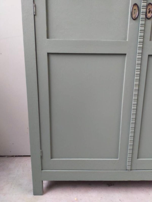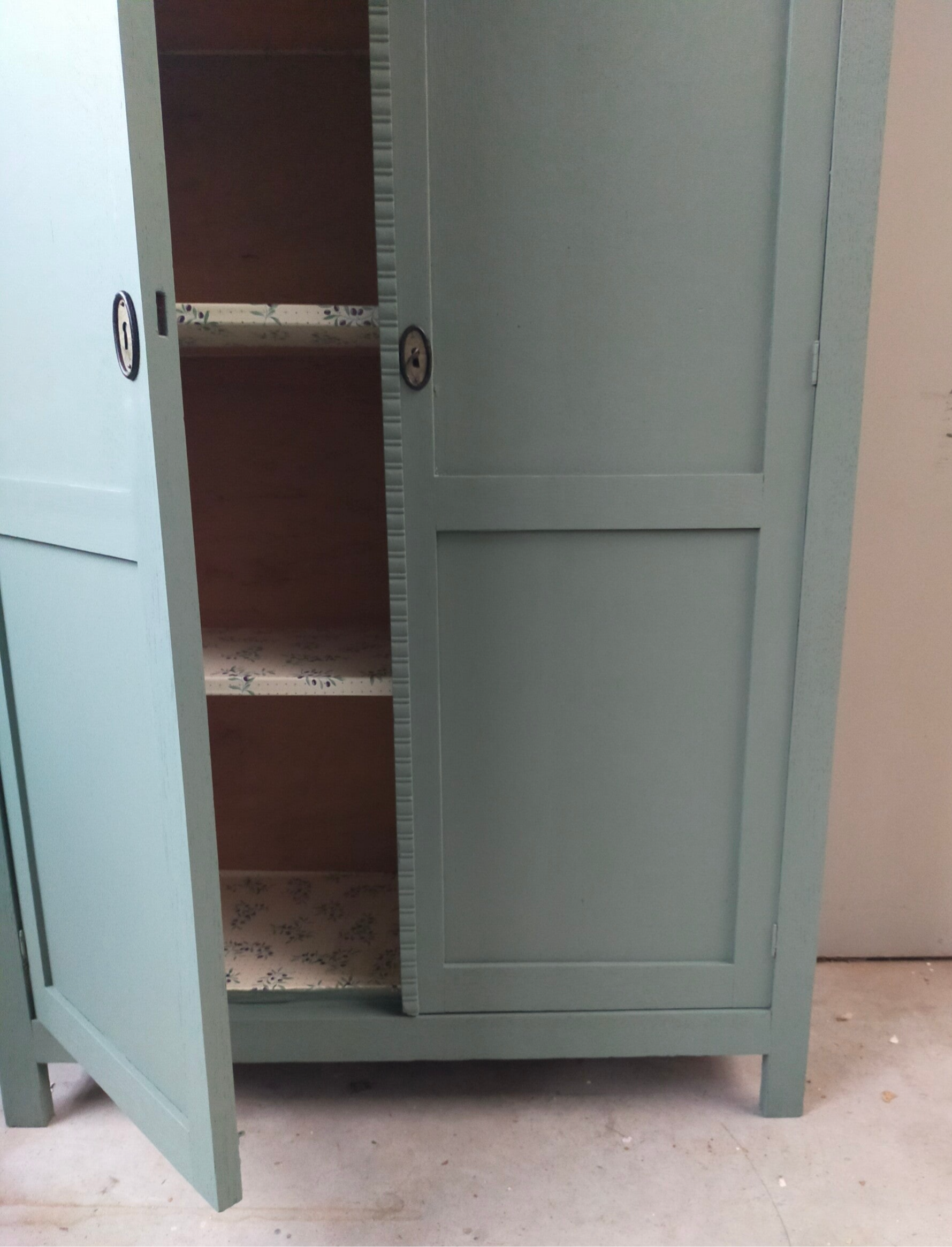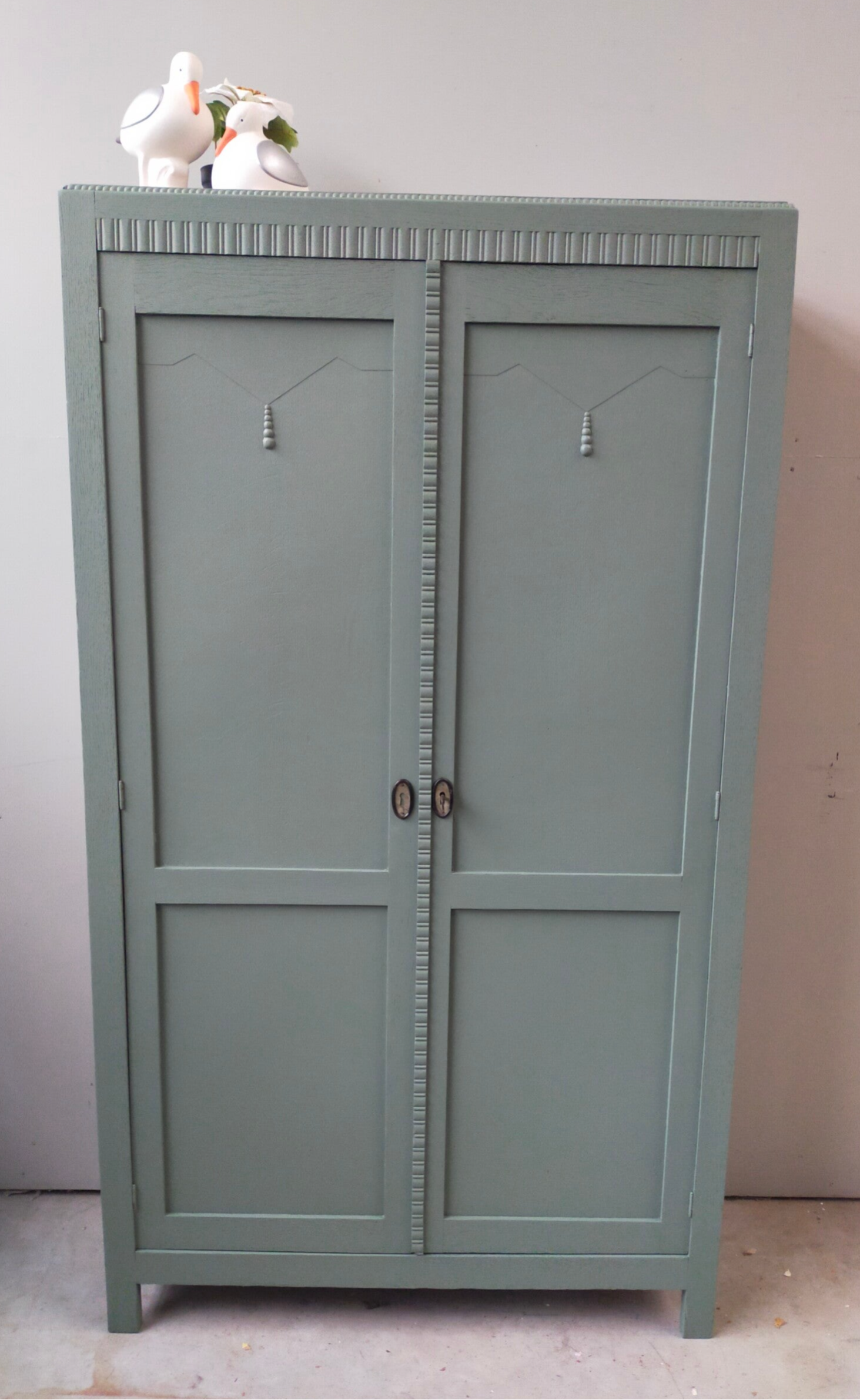 De kleur Carriage House van Fusion Mineral Paint is hier gebruikt, wat zich goed laat omschrijven als een lagune groene kleur. De kastdeurtjes sluiten goed, wel is het belangrijk dat de kast "goed" staat. Mocht ze onverhoopt wat uit het lood staan dan gaat het iestje stroever. Maar neemt niet weg dat het een fantische leuke en tegelijkertijd pracktische kast is.