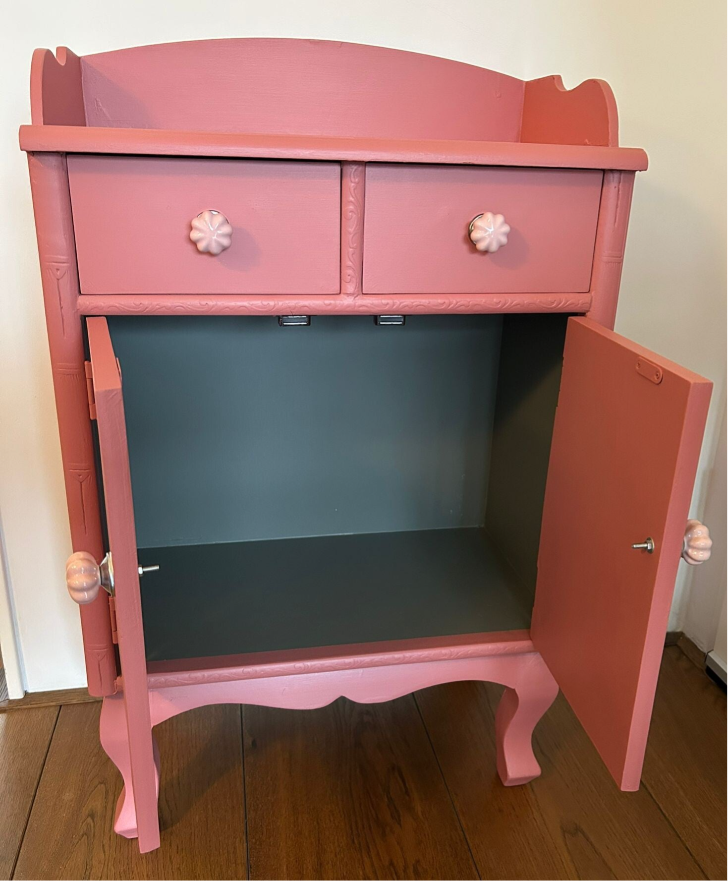 Een dot van een kastje, lekker speels qua vormgeving, maar de kleur is natuurlijk ook helemaal vrolijk. Hier is gekozen om 2 kleuren van Fusion in de mix te doen, met dit als super fijn resultaat. De laatjes en deurtjes zijn voorzien van mooie bijpassende knopjes. Niet perse een zwaar kastje, maar gewoon een solide kastje met heerlijk wat opbergruimte.