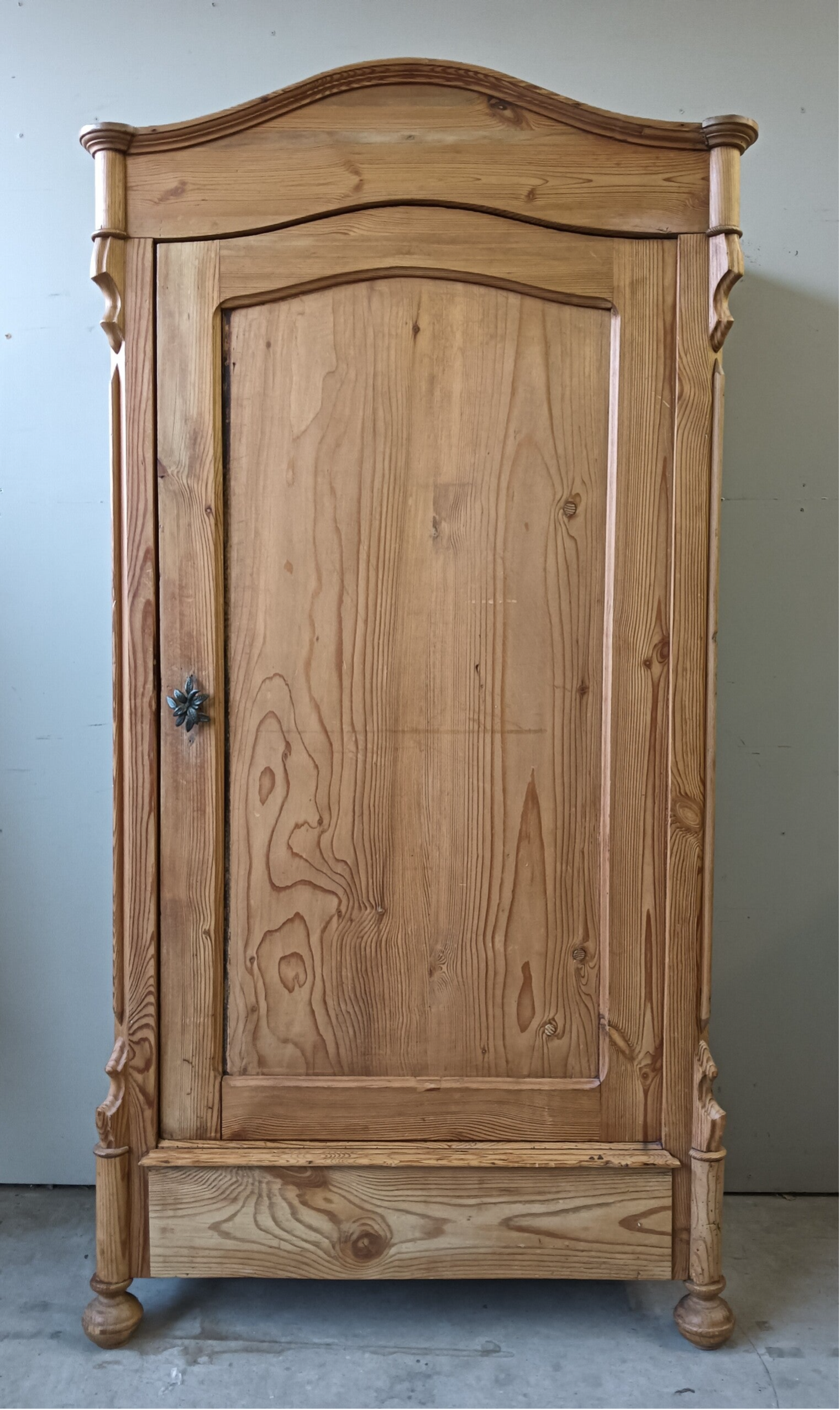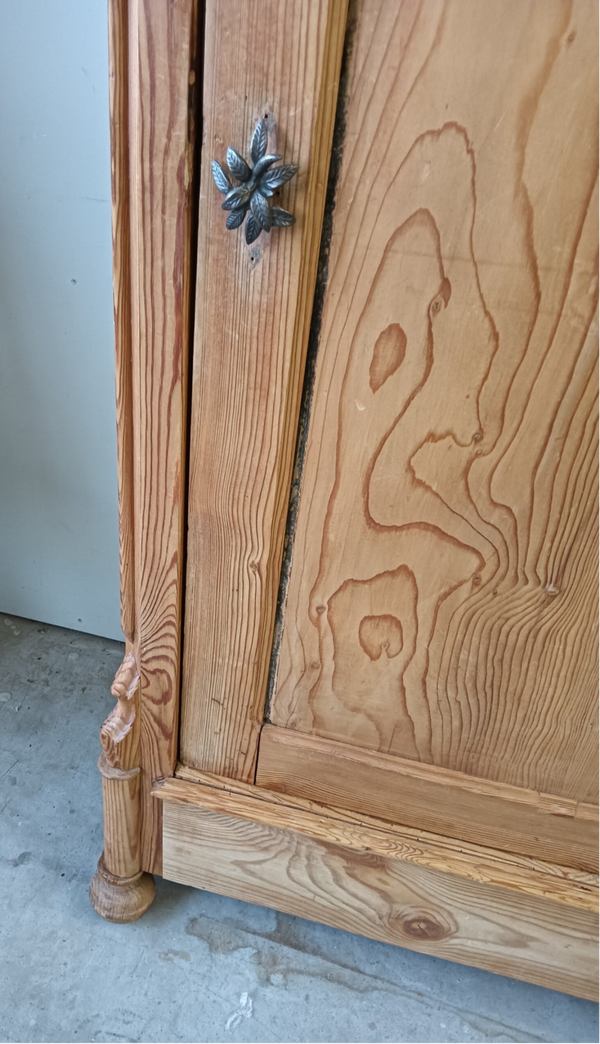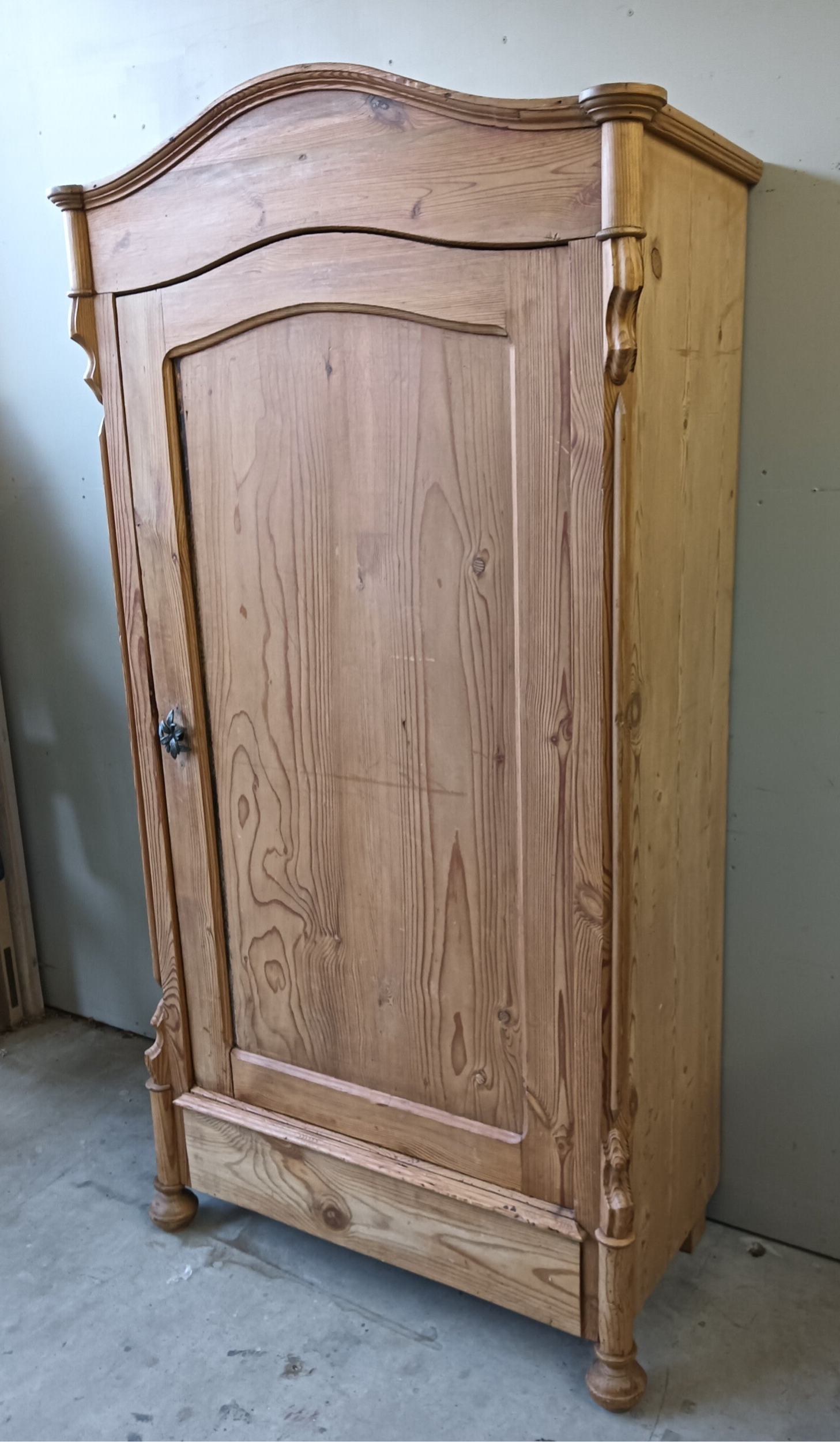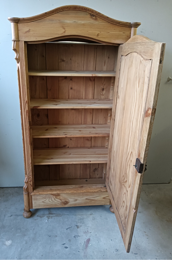 Oude dame, maar gezien haar leeftijd nog in goede conditie! Waanzinnig mooie vormgeving, prachtige subtiele ornamentjes aan weerzijde en een geleefde uitstraling. Achter de deur een aantal planken, maar ook een hangstang voor de liefhebber. En....voor de oplettende kijker zie je boven in de kast ook nog de oude hangstructuur zitten, prettig detail en geeft gelijk de leeftijd vd kast aan :-) Oud, bejaard, maar ooooooh zo mooi nog!