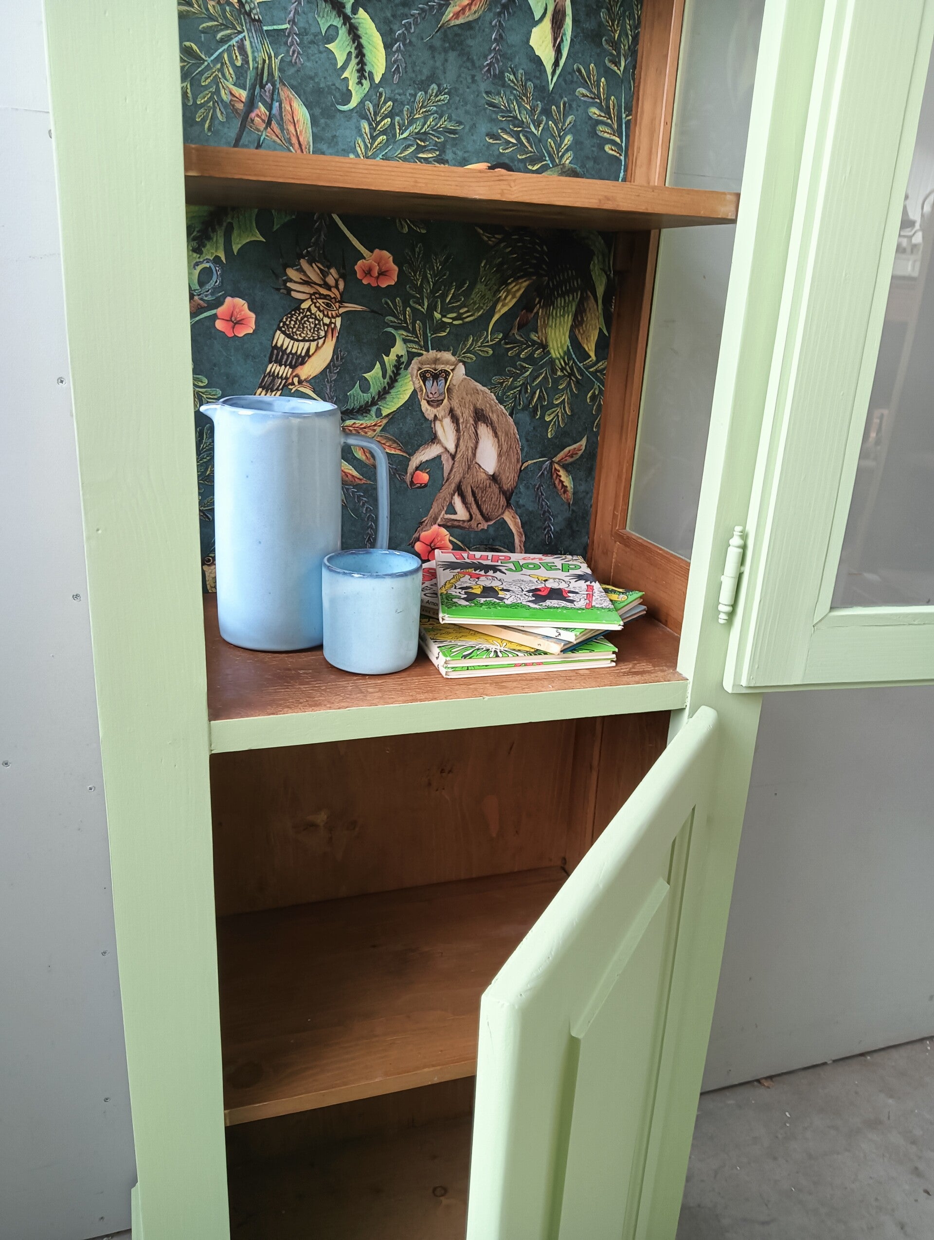 Wat een vrolijk en frissigheid geeft deze kast de ruimte. Een prettig model vitrinekast, met heerlijk wat planken achter de deurtjes. Hier komt de combinatie pronken en opbergen goed samen. De kleur is Upper Cananada van Fusion Mineral Paint, hetgeen zich goed laat omschrijven als een fris groen. Op de achterwand is een leuk bijpassend tropisch behang aangebracht, wat de kast een geheel eigentijdse uitstraling geeft en werkelijk een uniek item is geworden. Het hang en sluit werkt functioneert naar behoren.