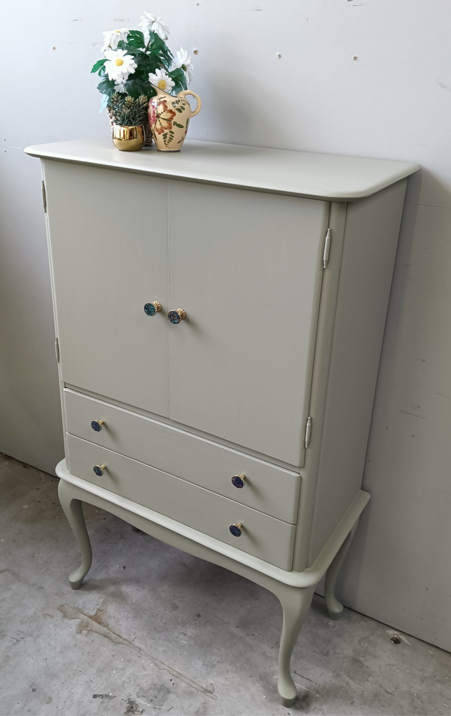 Kijk deze kast een stralen!! Een super mooi model kast. Mooi vormgeven, sierlijke pootjes en een berg aan op ruimte om van alles in op te ruimen/bergen. Achter de deurtjes 1 glazen plank, die is voorzien van een leuk desing, wat het geheel helemaal af maakt. Uiteraard hebben we op de lades en deurtjes bijpassende knoppen geplaatst. De kleur die de kast heeft gekregen is Lichen van Fusion Mineral Paint. De kleur laat zich het beste omschrijven als een groen tint, maar met enigszins vergrijsde ondertoon. Al met al past het allemaal goed bij elkaar en is ze uniek in haar soort !