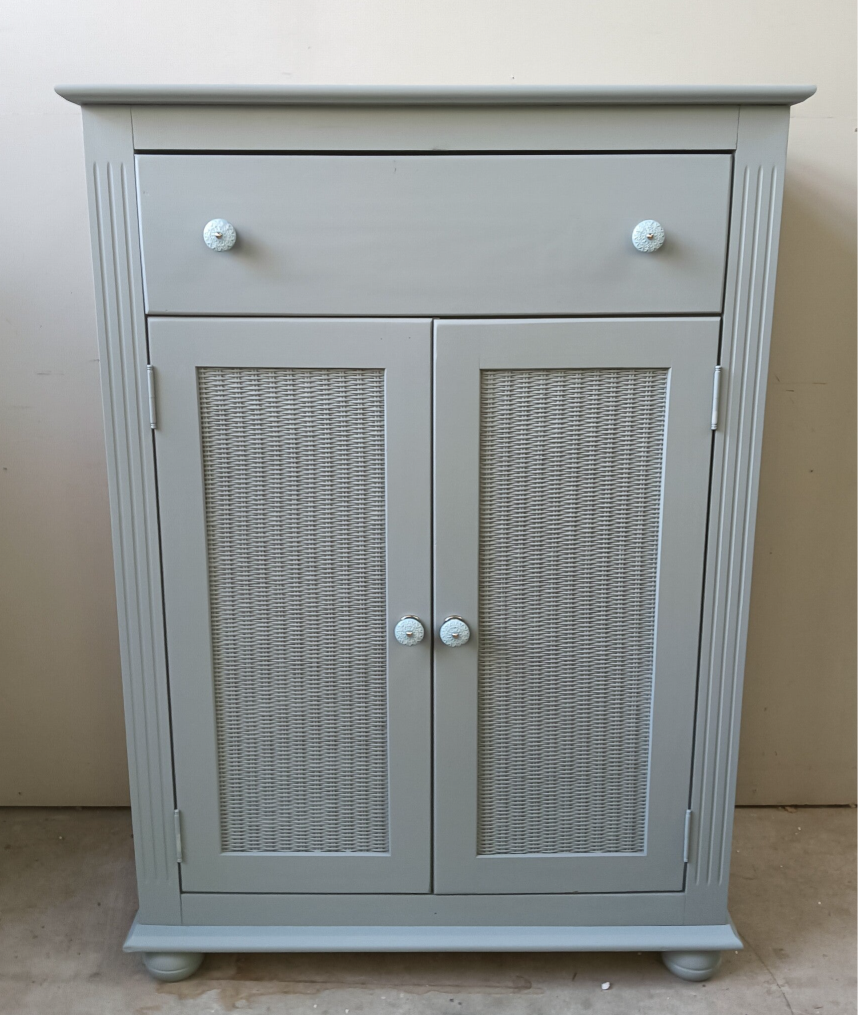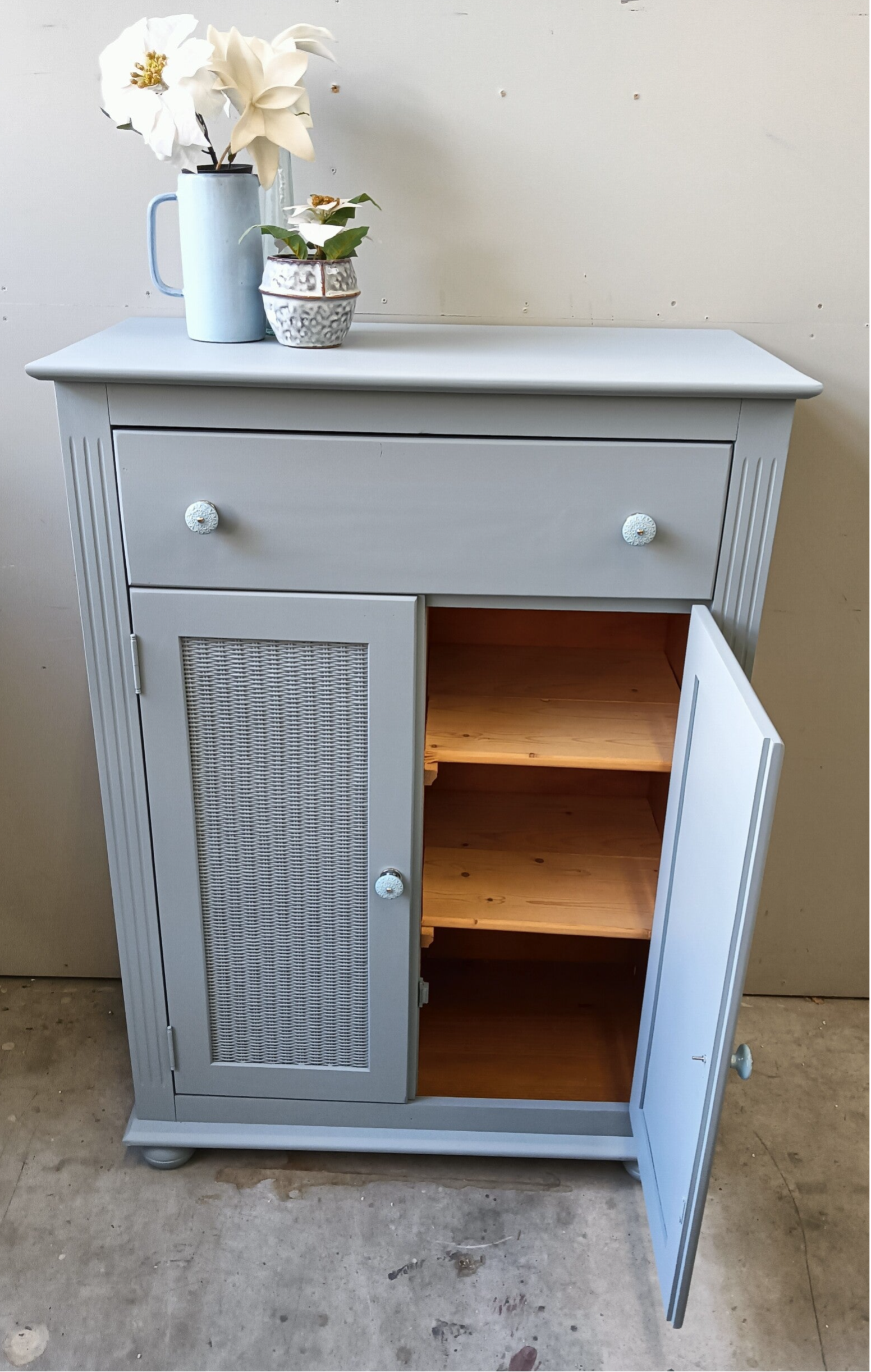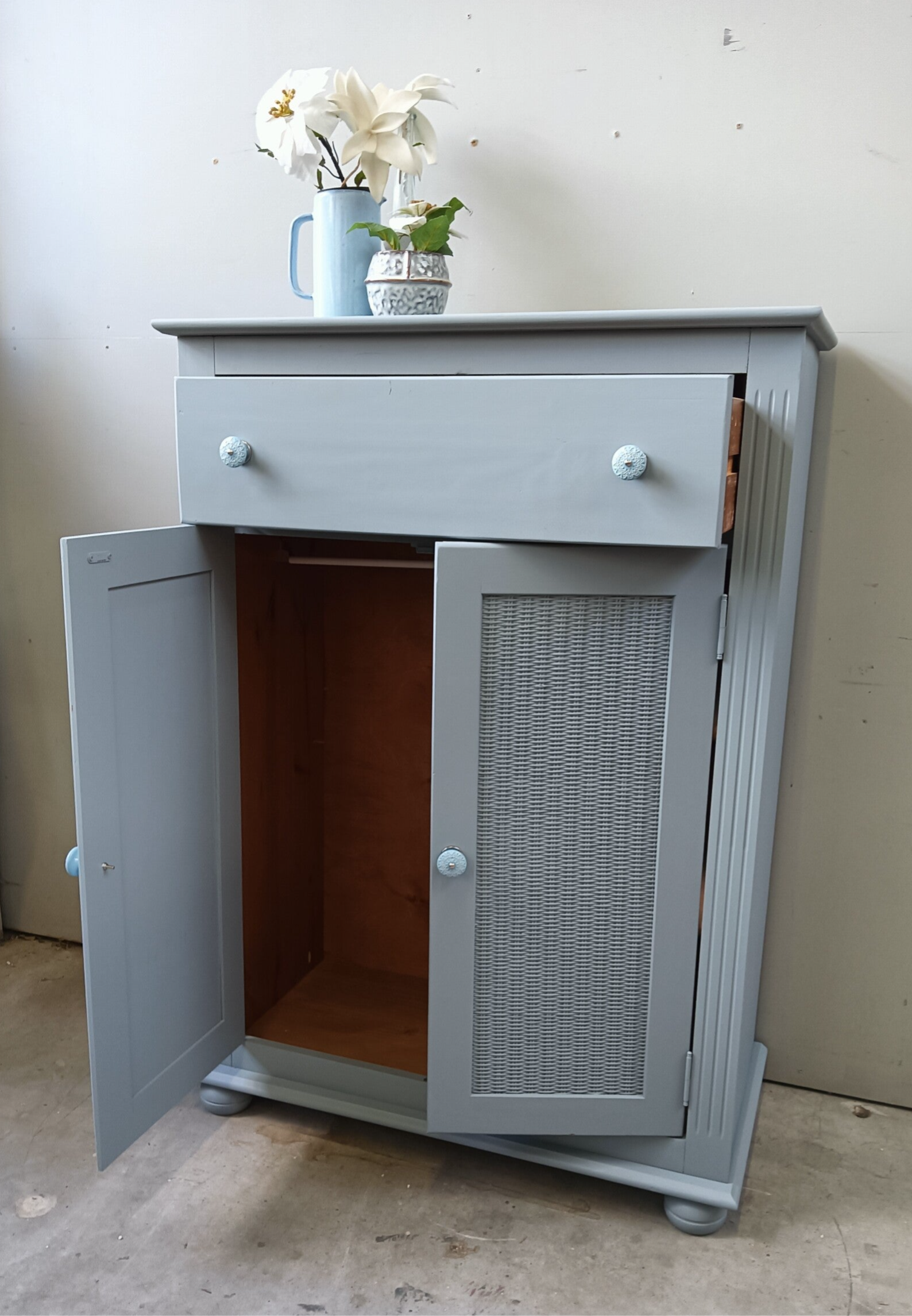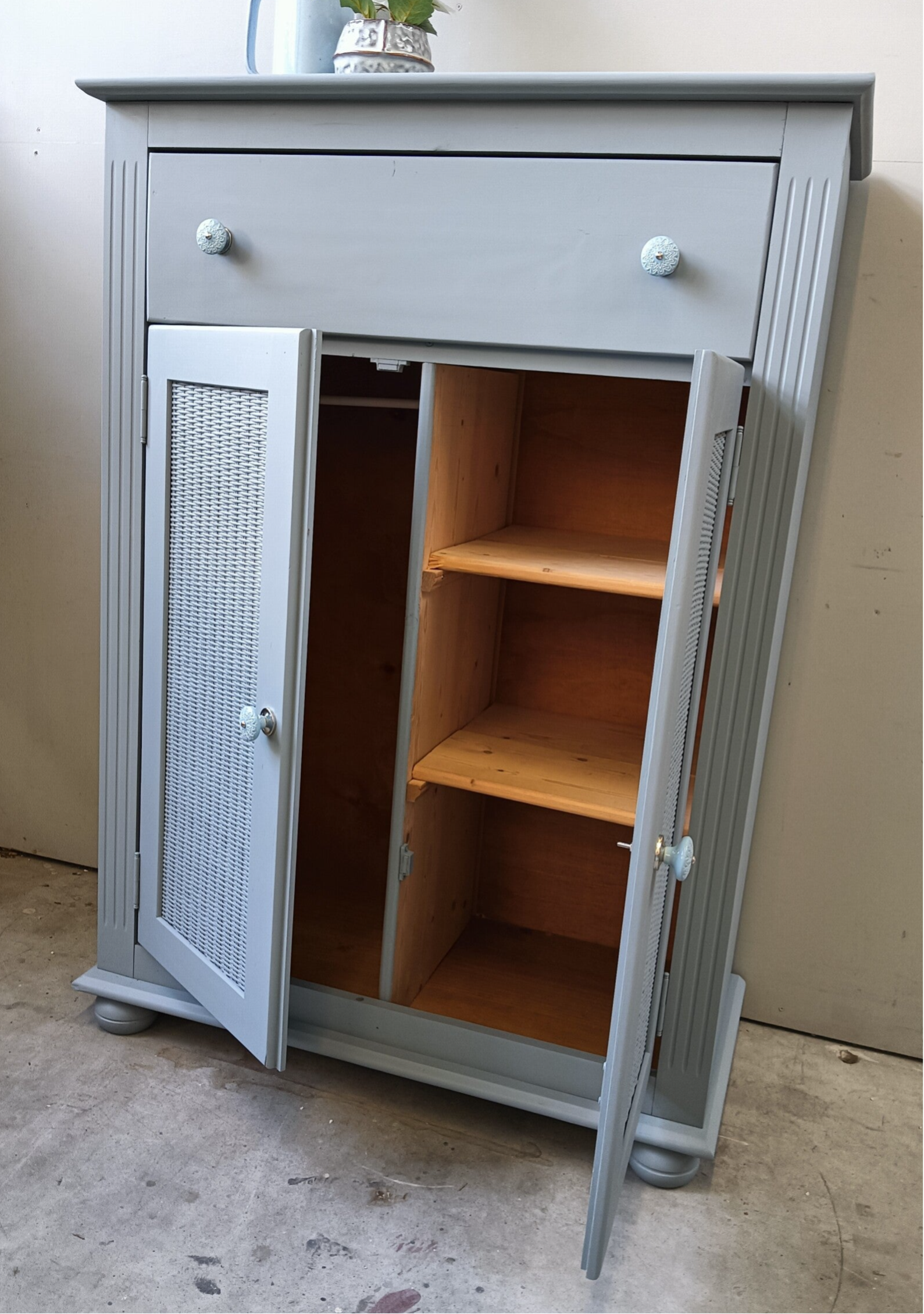 Wow, hoe leuk is deze kast geworden en die kleur !!! Toffe garderobe kast met lade en achter de deurtjes heerlijk wat planken en een hang gedeelte. Toffe bijpassende knoppen mochten op deze kanjer natuurlijk niet ontbreken! Wij zien deze natuurlijk alweer helemaal shinen op een vrolijke kinderkamer, maar in een kleurrijk interieur past deze knapperd natuurlijk ook!