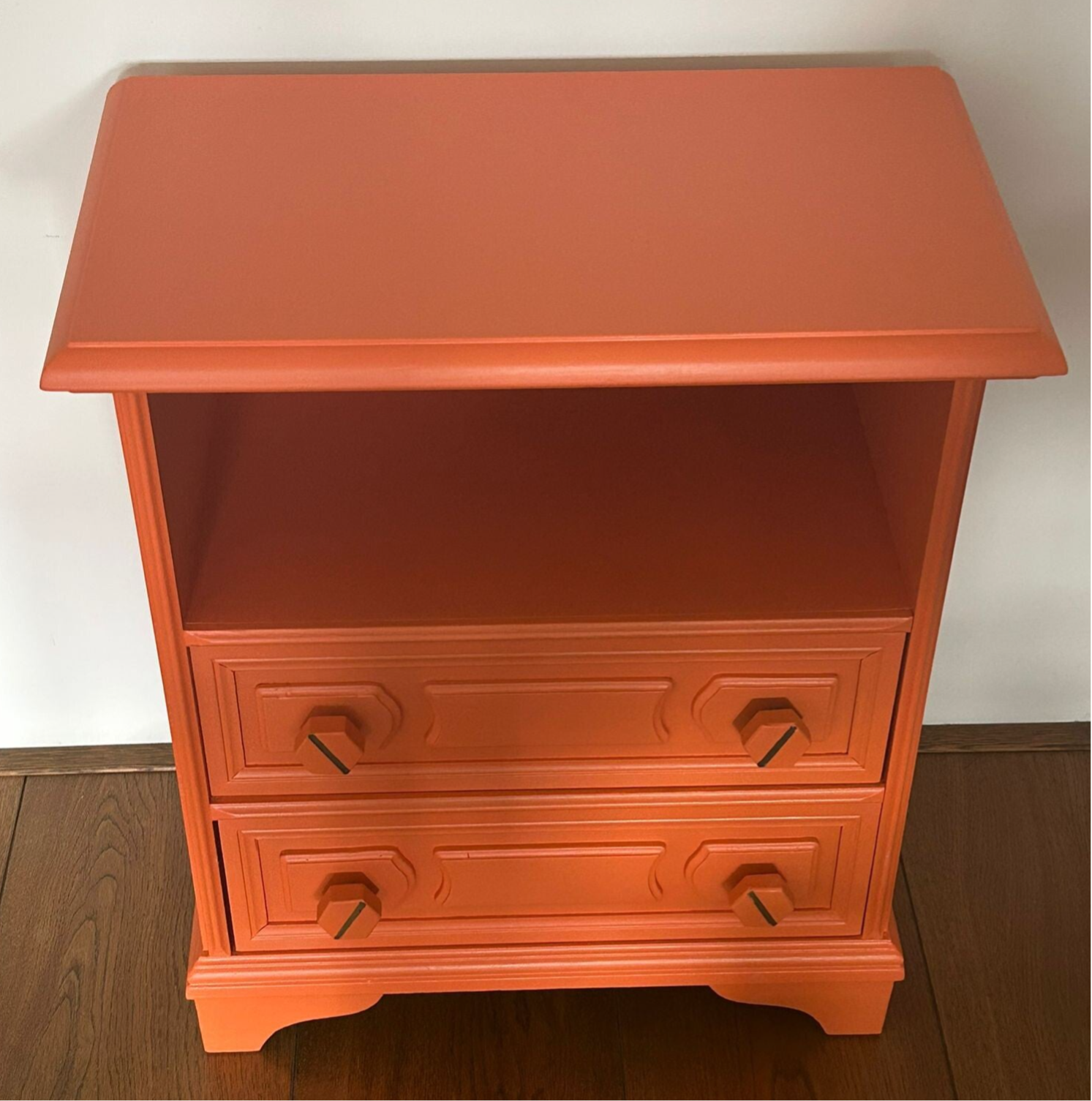 Heerlijk en vrolijk Oranje, oftewel Tuscan Orange van Fusion Mineral Paint. En wat dacht je van de perfect bijpassende knopjes op de lades, helemaal leuk toch. De laatjes geven een hoop opbergruimte en lopen prima. Het vak geeft ook weer ruimte om eea neer te leggen of te tonen, multifuctioneel als je het ons vraagt! Uiteraard kan het niet anders dan dat de tijd zijn sporen heeft achter gelaten, maar dit is zeker niet storend. Functioneel is deze mooie dame zeker nog!