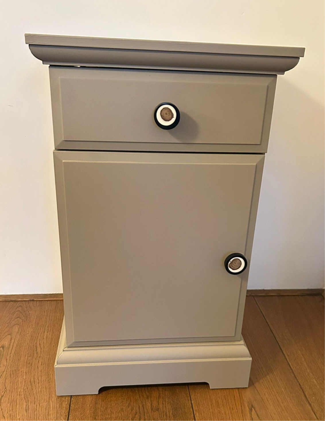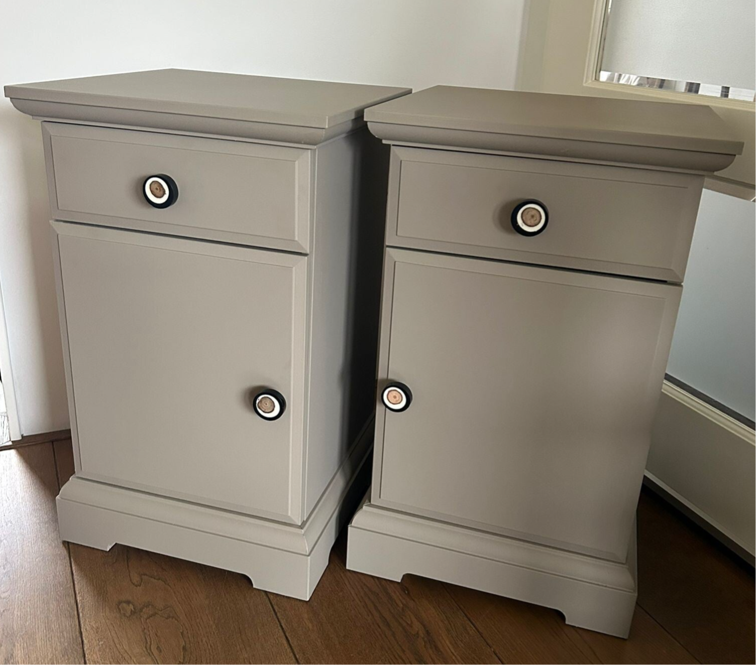 Een prachtige kleur deze warme taupe tint van Fusion Mineral Paint. Deze set nachtkastjes zijn in uitstekende staat en afgewerkt met een super leuke bijpassende knop op zowel deurtje als lade.