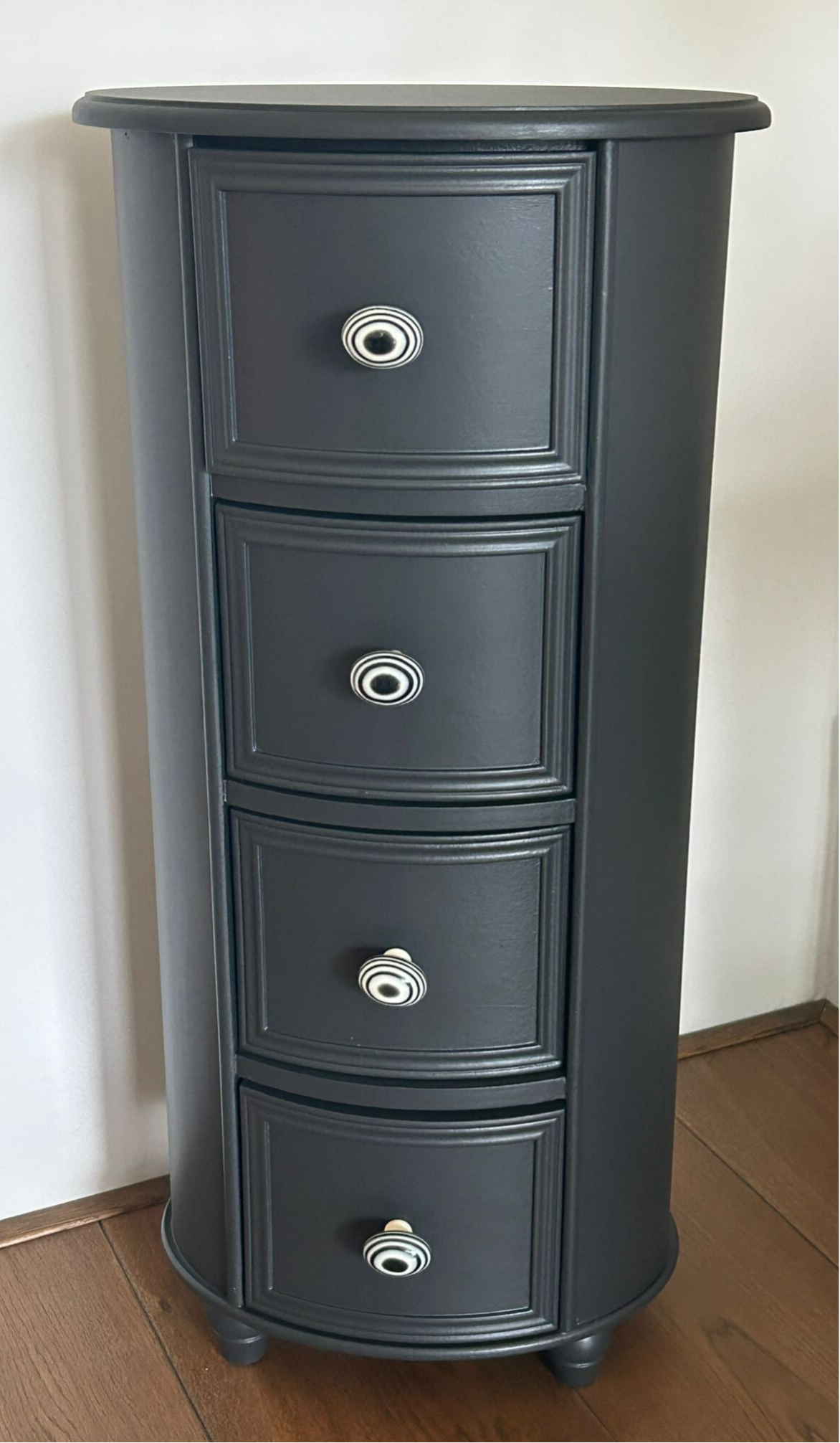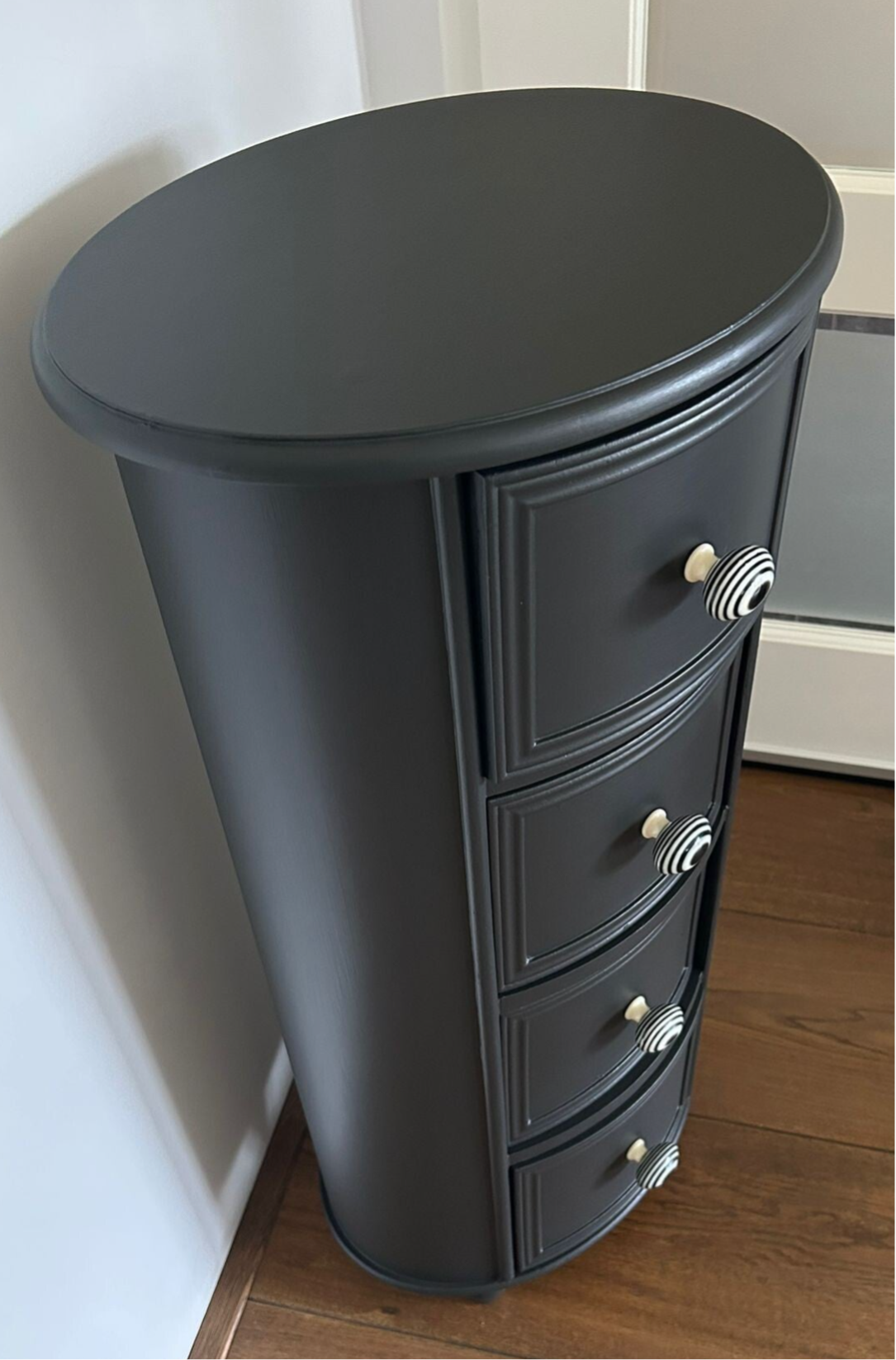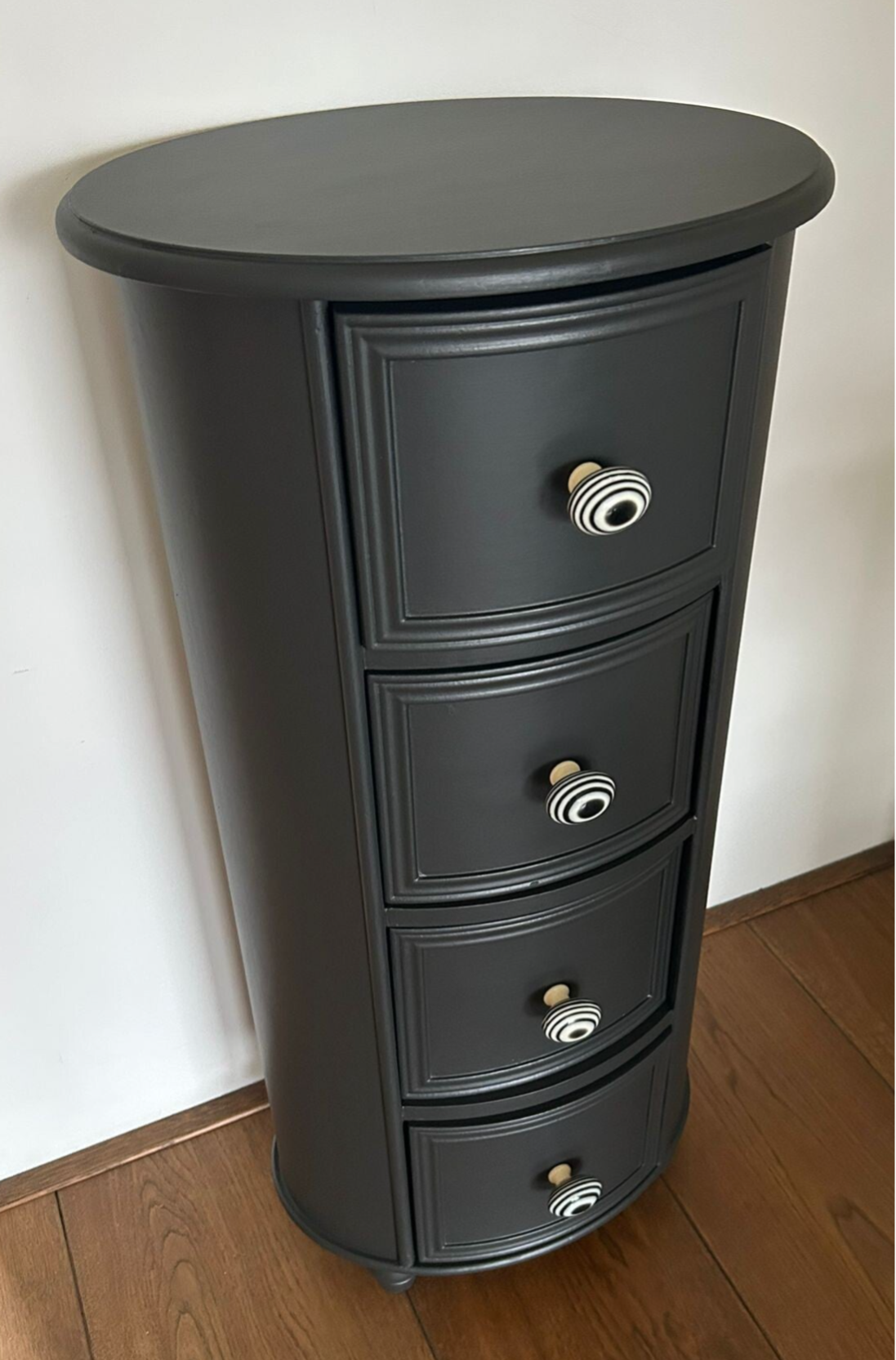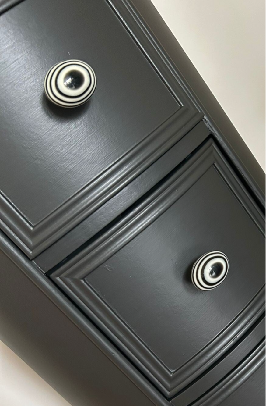 Ovaal, hoe leuk! Net even anders als anders en zeker in de mooie kleur Cast Iron van Fusion Mineral Paint. Het laat zich goed omschrijven als warm zwart. Mooi, intens en toch vriendelijk. Daarbij hebben we bijpassende knoppen op de lades gezet wat het geheel helemaal af maakt.