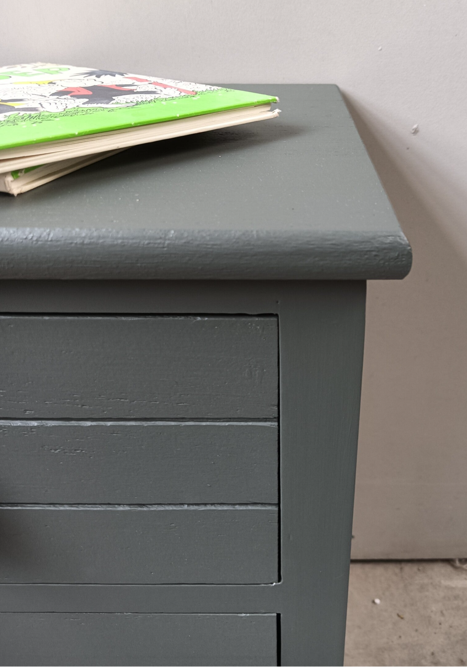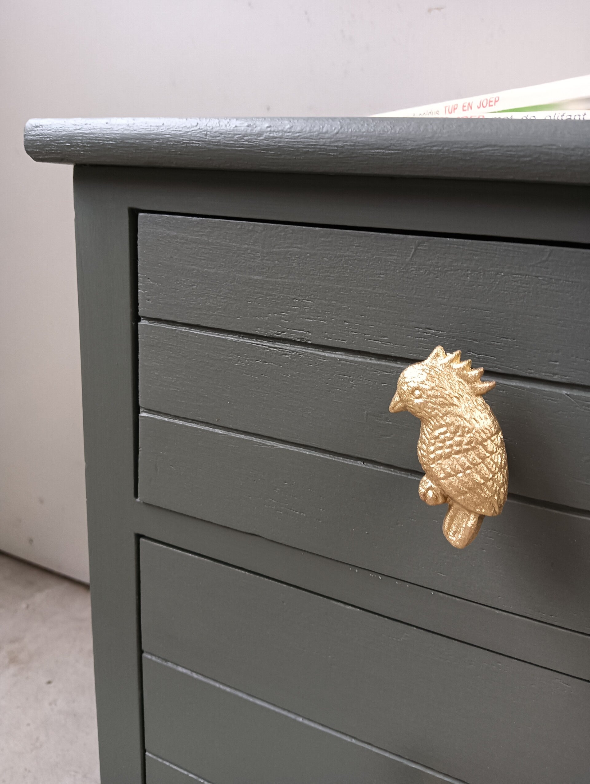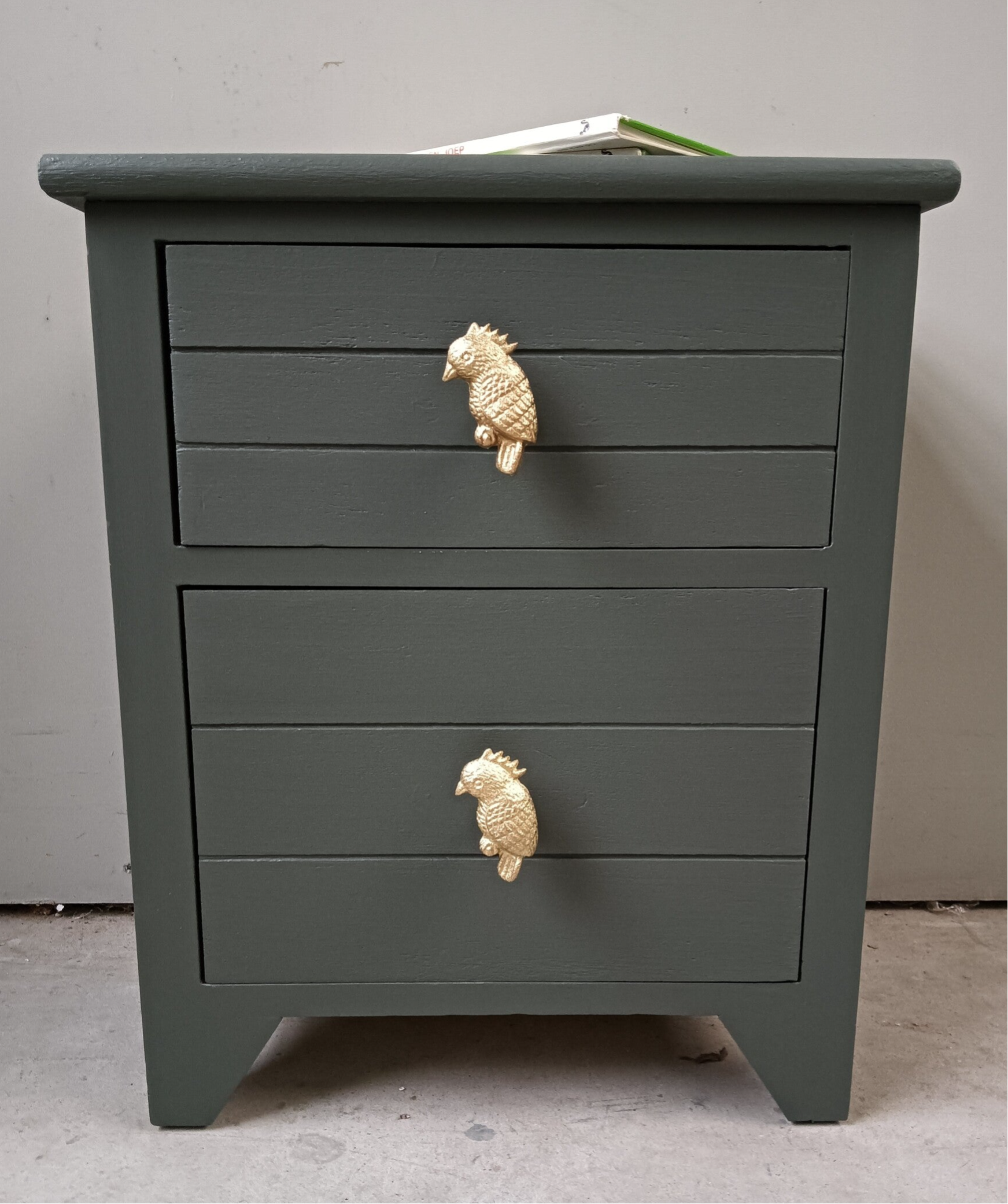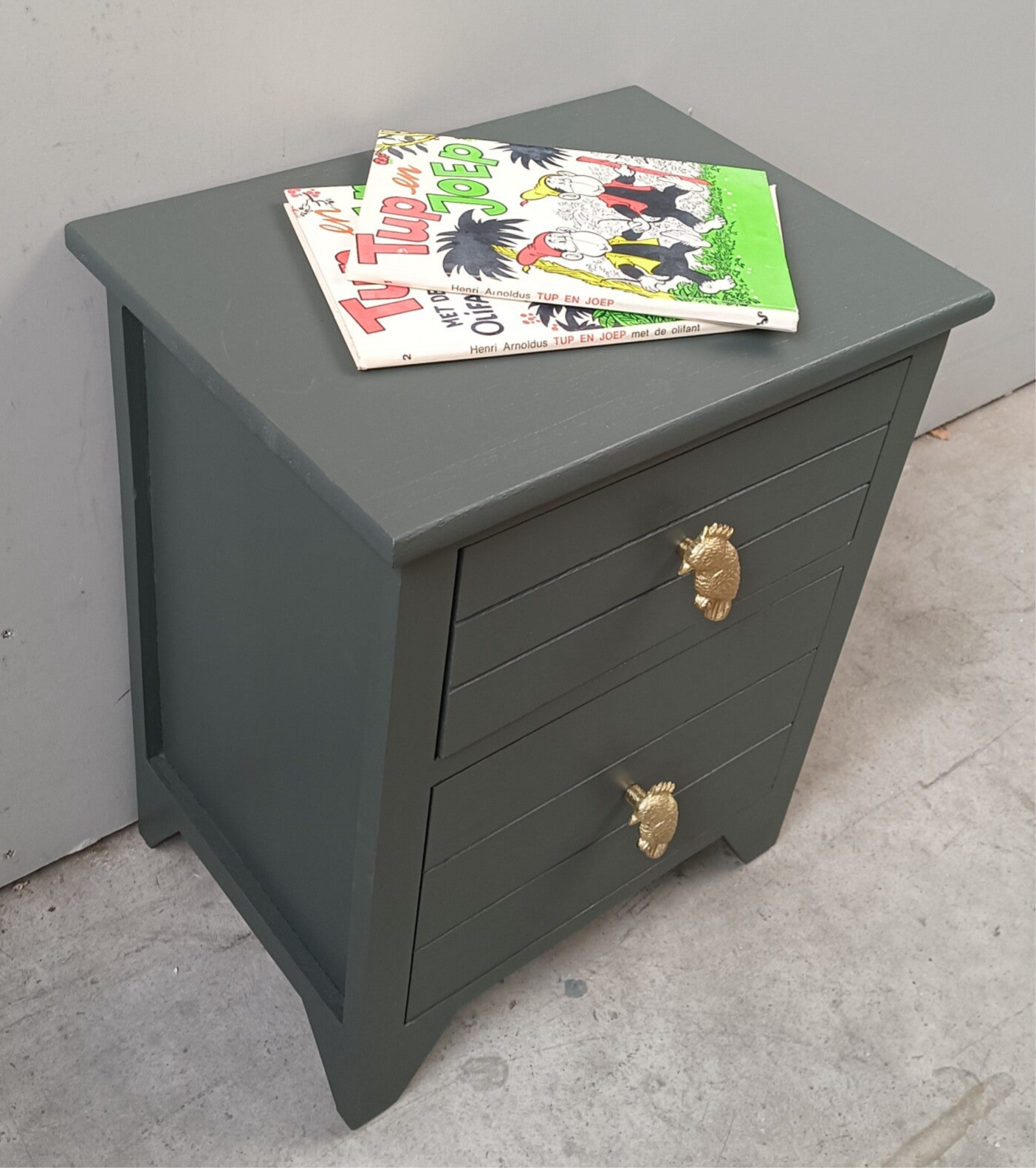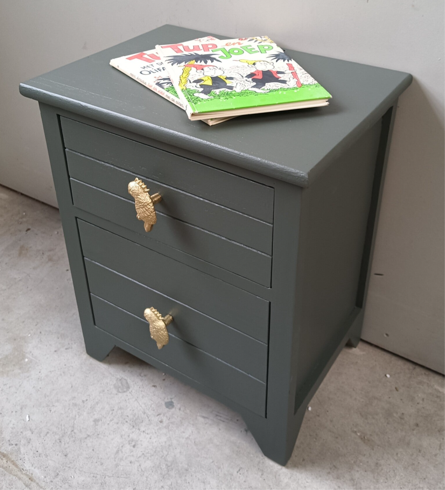 Een niet perse oud licht gewicht ladenkastje, maar dat maakt hem of haar niet minder leuk en mooi. Een echte blikvanger zo in de donker (legerachtig) groene kleur Everret, van Fusion Mineral Paint. Op de laatjes hebben we te gekke knoppen gezet, wat goed samen gaat met de kleur van het kastje. Nou zeg nou zelf, helemaal leuk toch?! Uiteraard kan het niet anders dan dat de tijd zijn sporen heeft achter gelaten, maar dit is zeker niet storend. Functioneel is deze leukerd zeker nog!