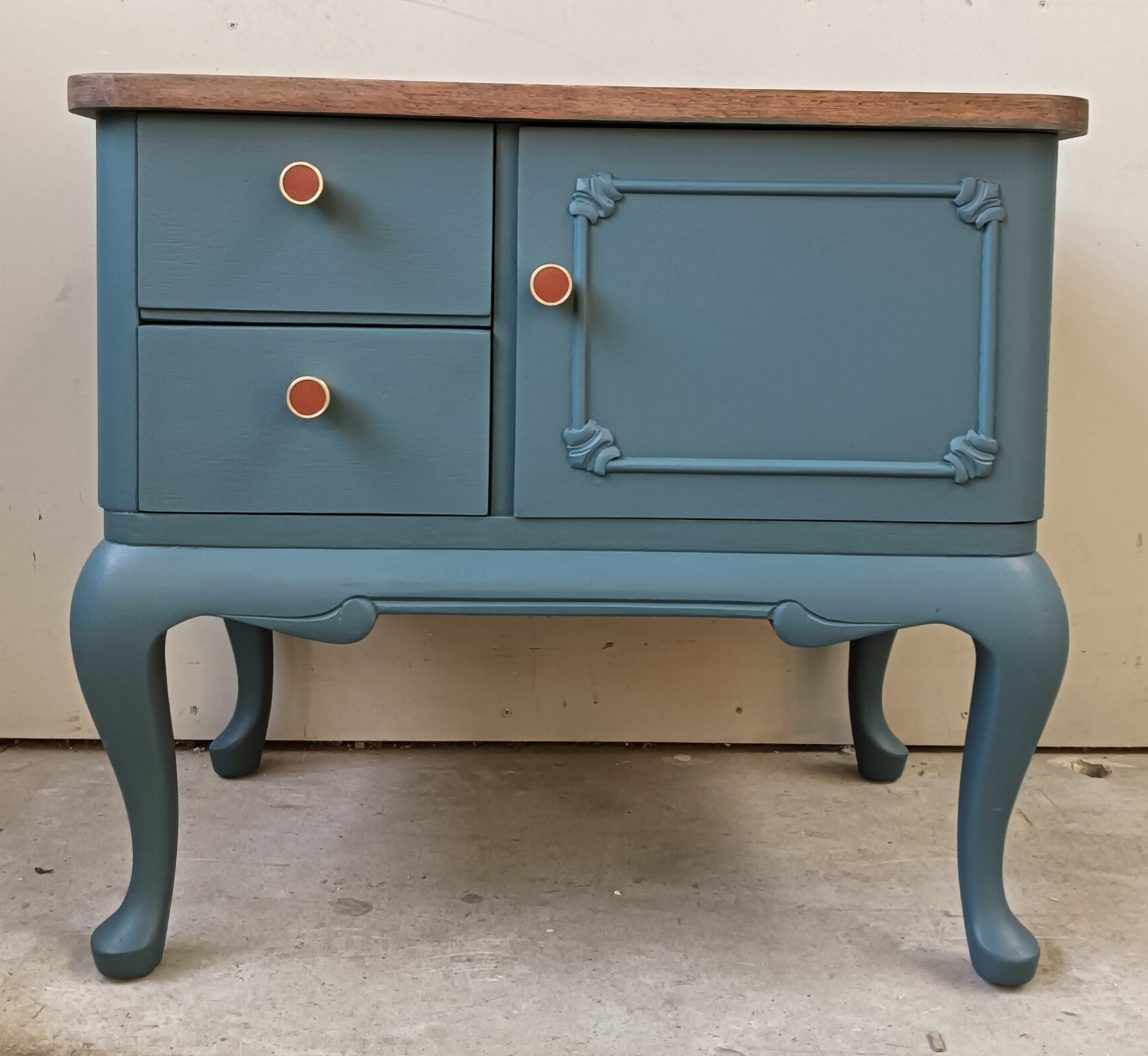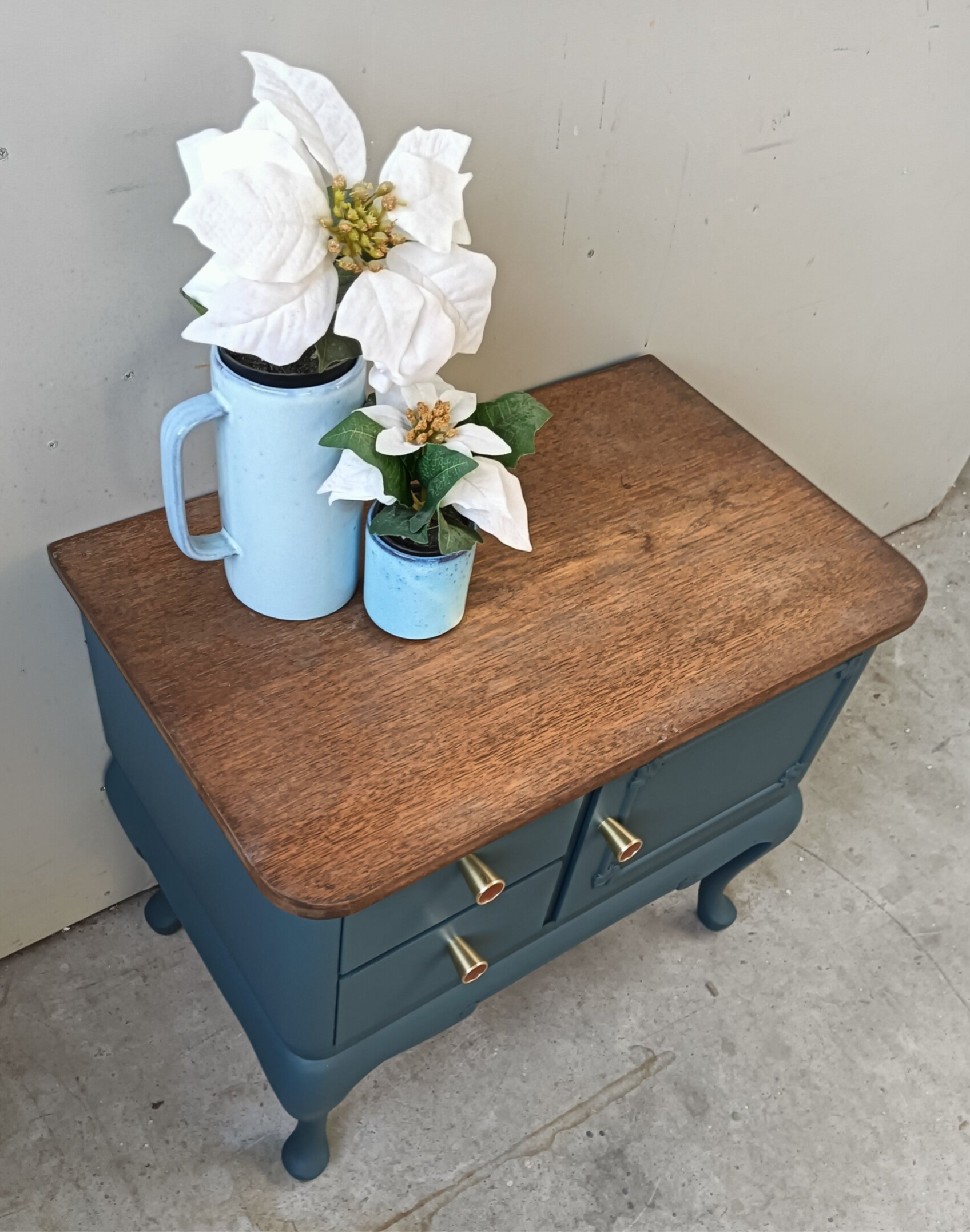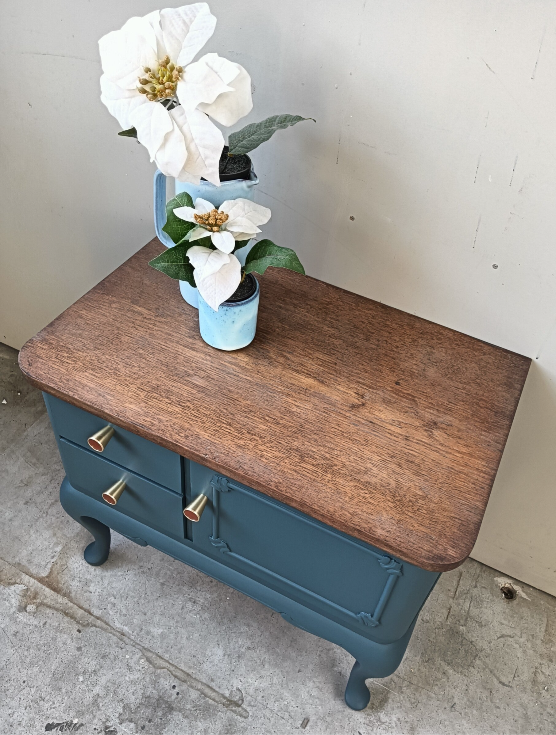 Een mooi en subtiel vormgegeven wandkastje / nachtkastje. De kleur Homestead Blue van Fusion Mineral Paint, wat zich als een mooi petrol blauw laat omschrijven, past goed bij het in cappuccino tint bewerkte bovenblad. Het mooie houtsnijwerk, de sierlijke pootjes en de toffe knoppen maken het geheel tot iets unieks.