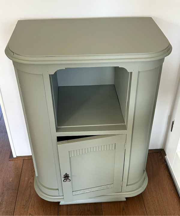 Werkelijk een oude dame, maar ooooh wat is ze nog leuk! Een mooi wand meubel, wat goed te gebruiken is als bijvoorbeeld drankkastje, maar ook prima kan dienen als een bescheiden dressoir. Zo kunnen we nog wel een aantal fucnties op noemen, dus mogelijkheden zat ! De kleur is Acadia Pear van Fusion Mineral Paint. Deze kleur laat zich het beste omschrijven als een licht groen tint met een enigszins grijze ondertoon. Maar in bepaald licht ook een zweem zilver in zich heeft. Prachtig wat ons betreft. Het orginele beslag met sleutel is hier behouden en fucntioneert ook naar behoren.