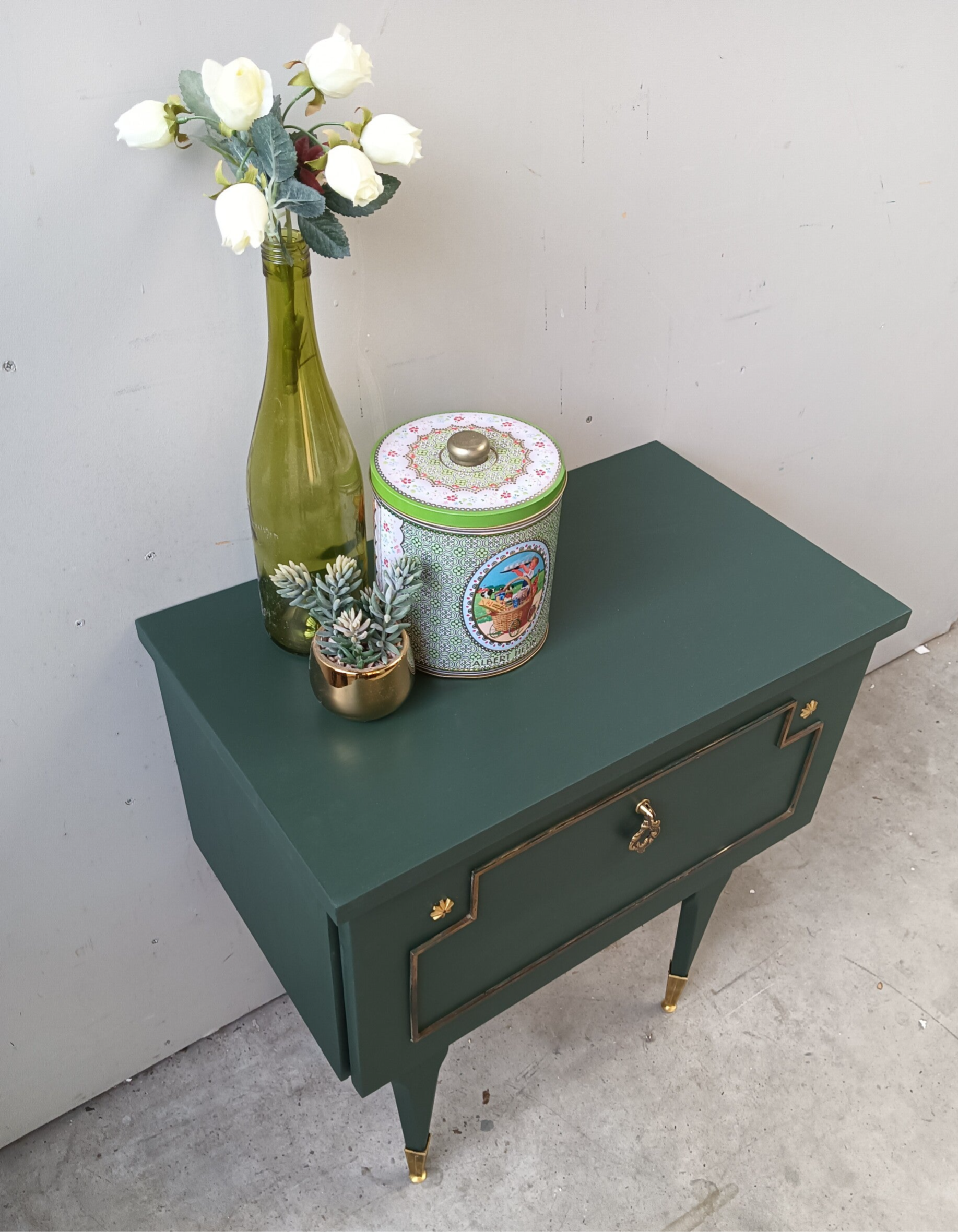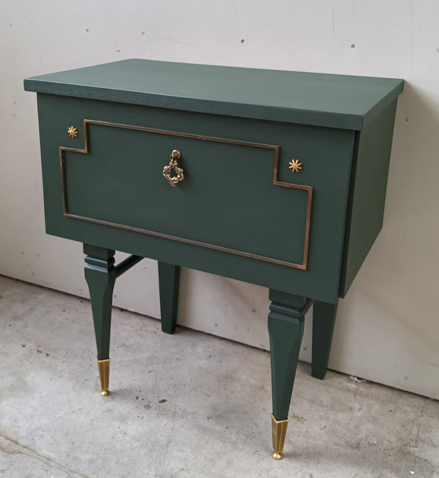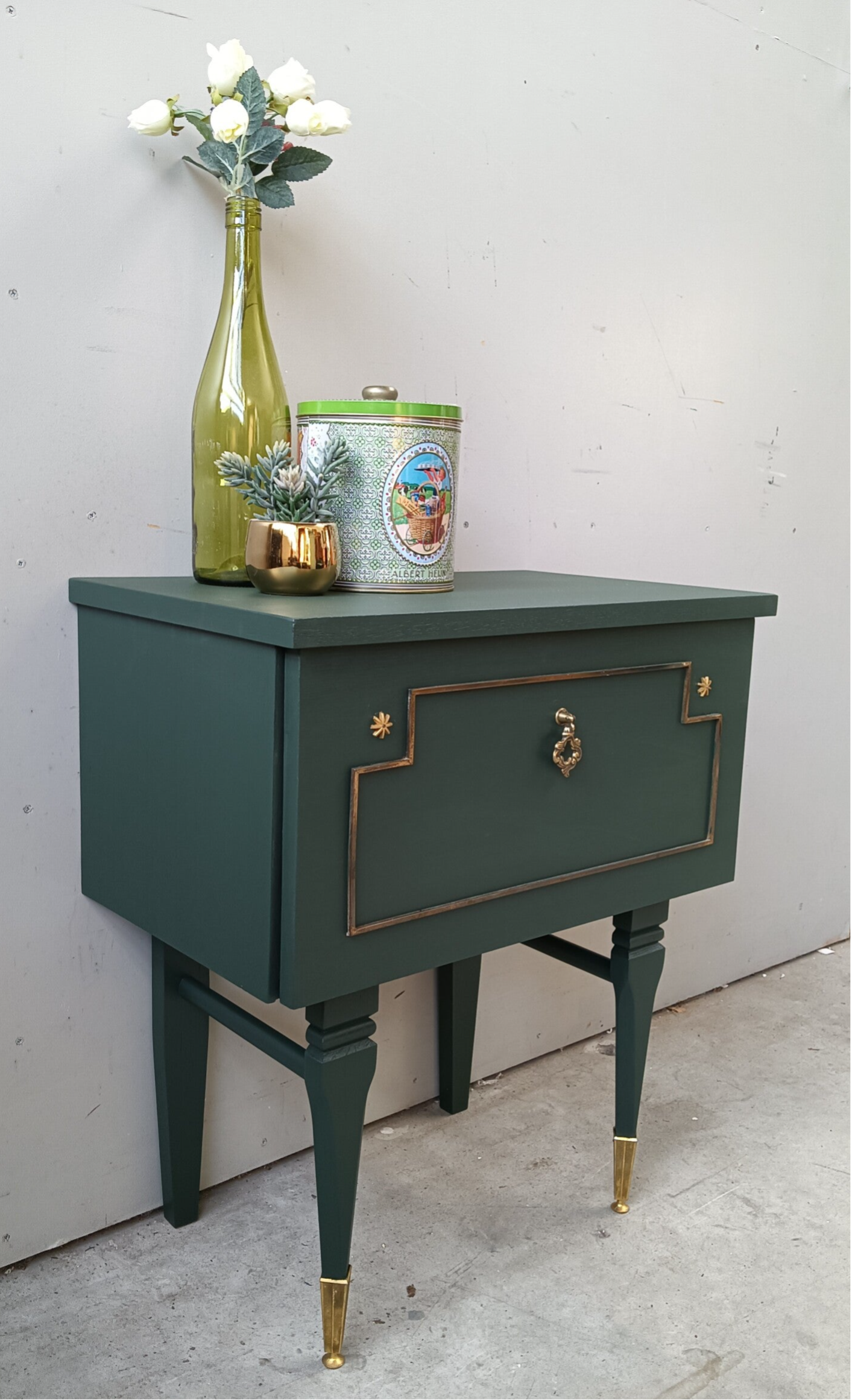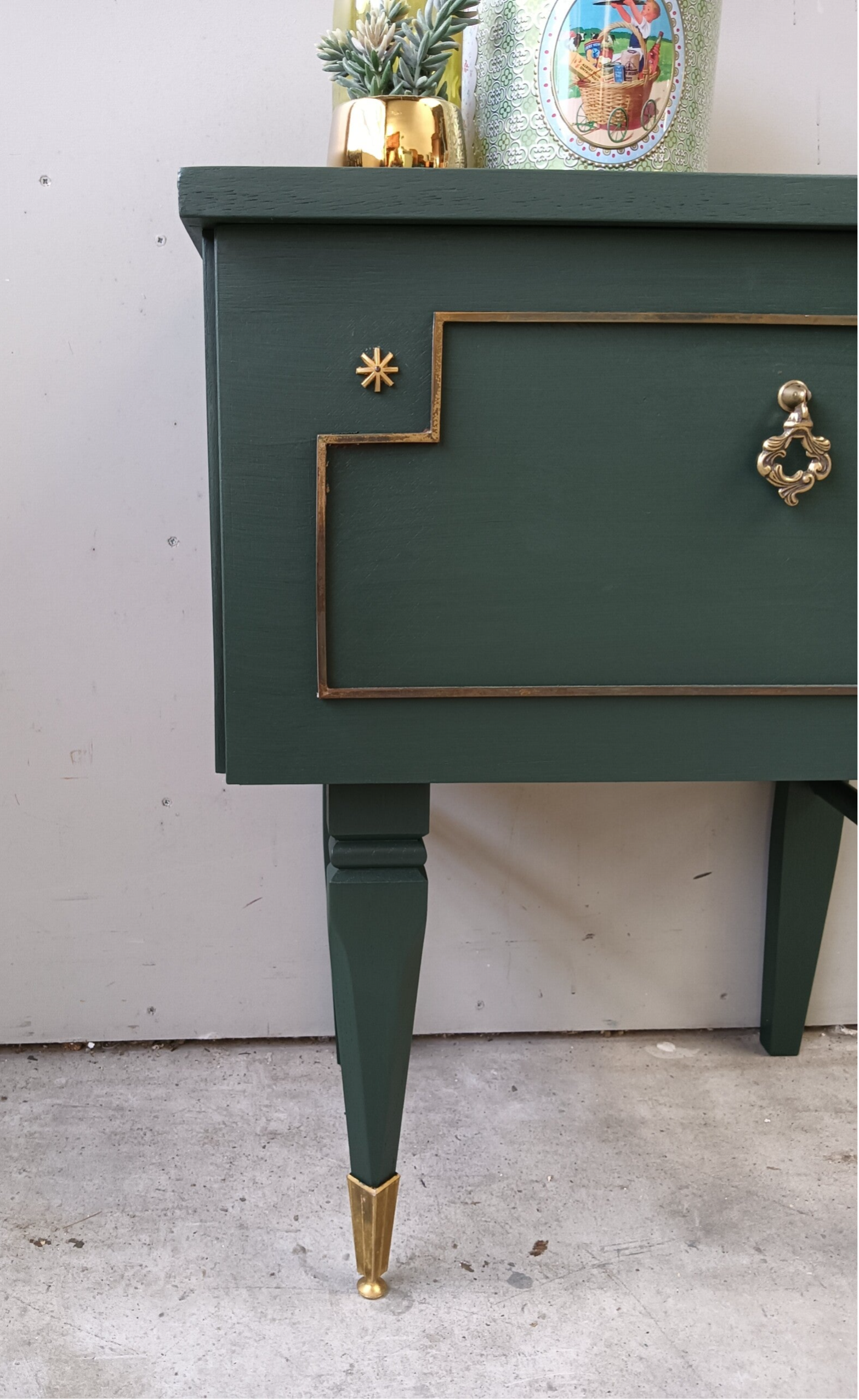 Een waanzinnig leuk en autenthiek klep kastje. Ze kent haar oorsprong in Frankrijk. De mooi vormgeving, de messing details en haar "nieuwe" jas maken haar een lust voor het oog. De kleur Manor Green van Fusion Mineral Paint is hier gebruikt, wat wat ons betreft erg goed past bij de messing details van het kastje. Het is een mooi en diep groene tint. Ook de binnenzijde heeft onze aandacht gehad, wat dan weer goed samen gaat met de buitenkant.