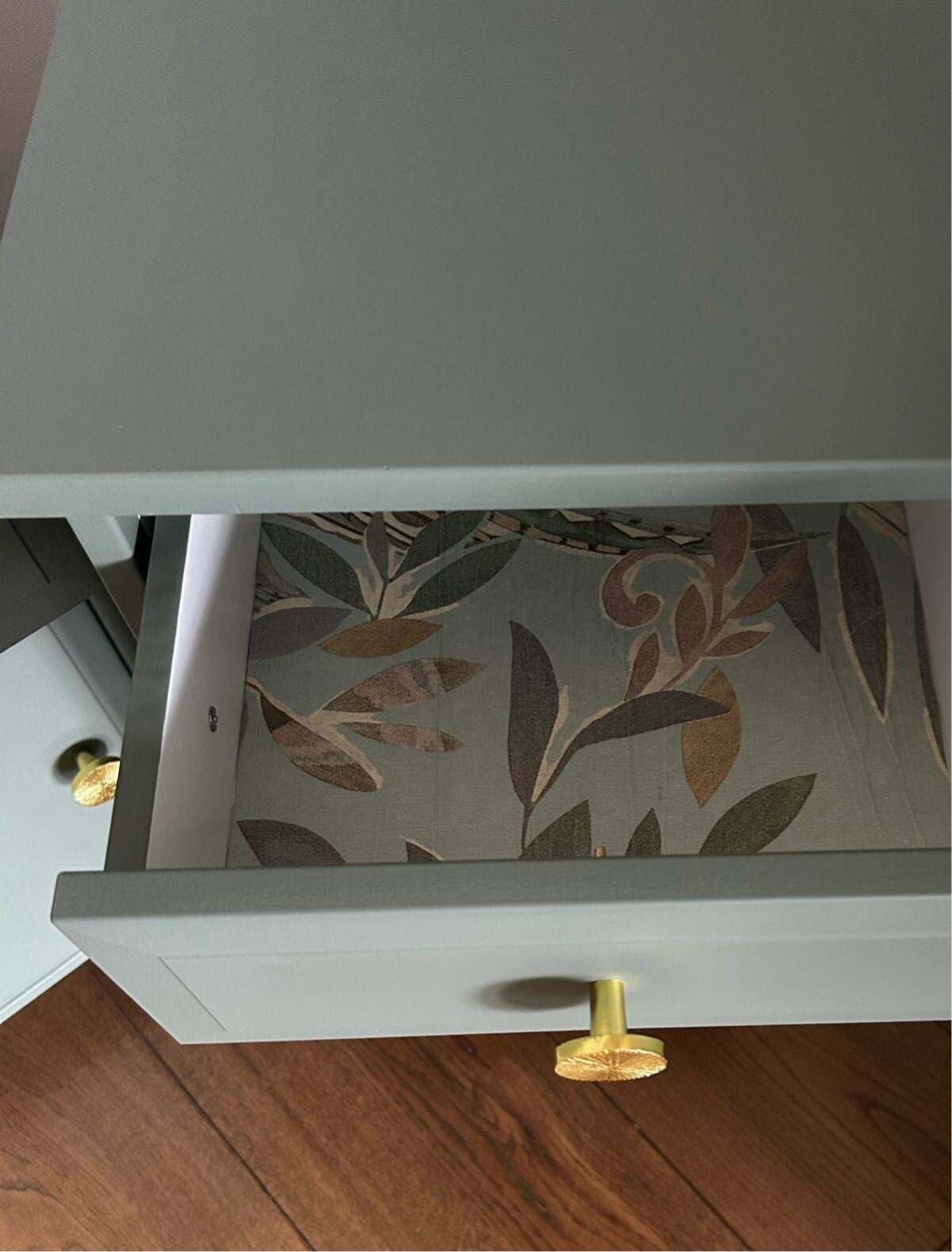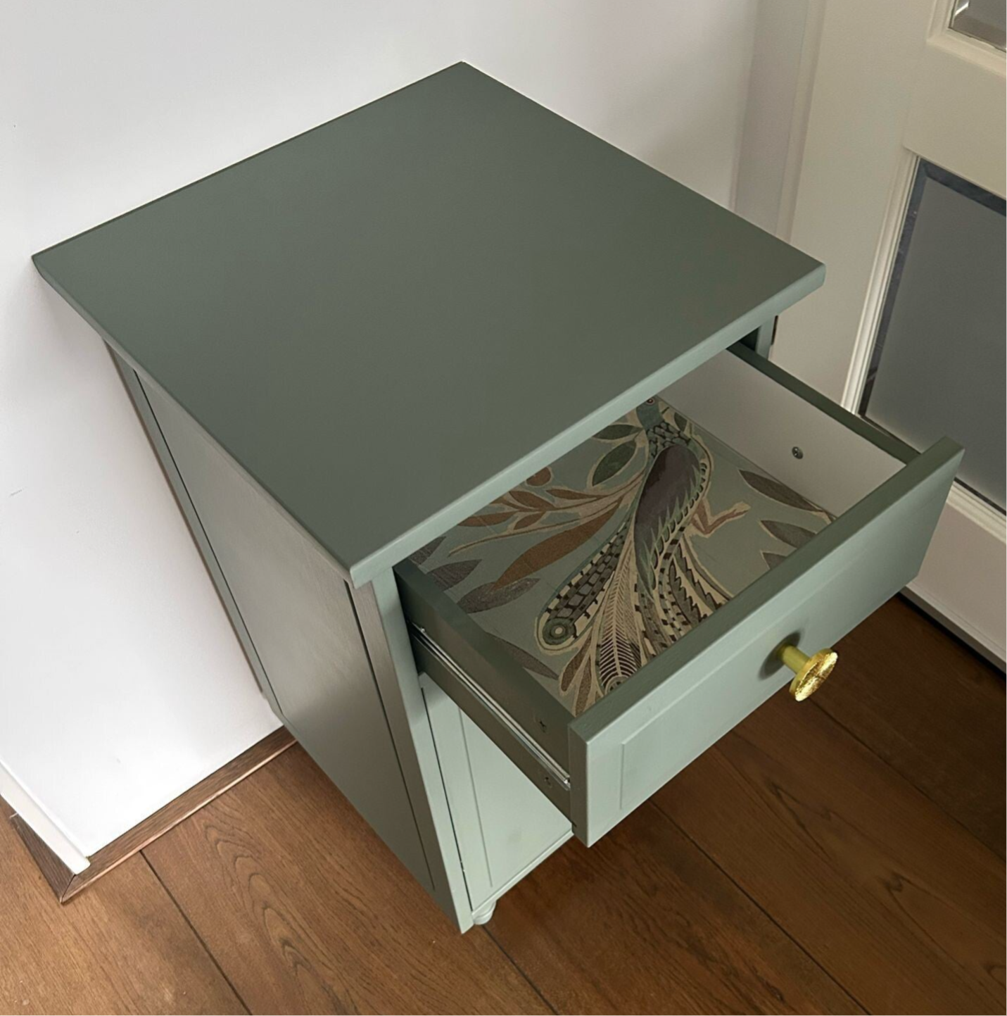 Deze set nachtkastjes, met hun strakke belijning, staan in de kleur Carriage House van Fusion Mineral Paint. Deze kleur laat zich het best omschrijven als een lagune groene tint. De deurtjes & laadjes sluiten goed en na behoren. Ze zijn afgewerkt met mooie bijpassende knoppen op zowel het laatje als deurtje. En in het laatje ook nog een fijn bijpassend design aangebracht !