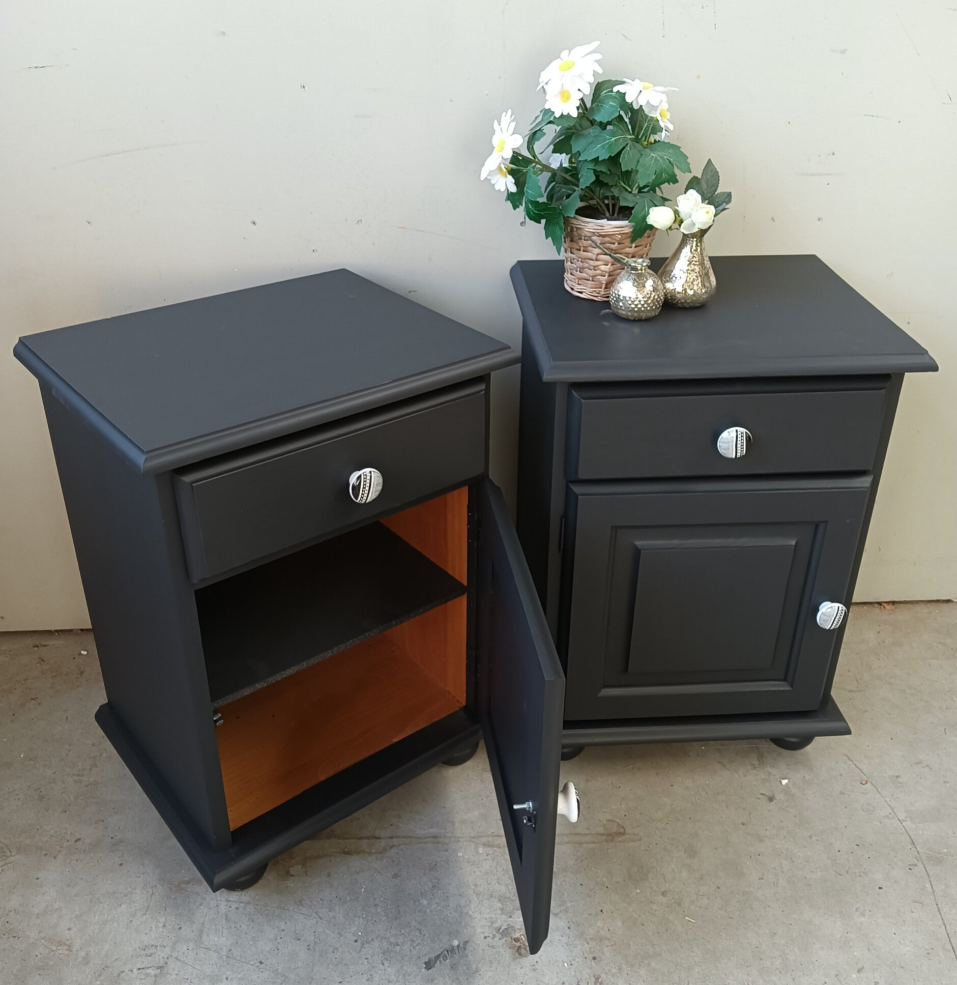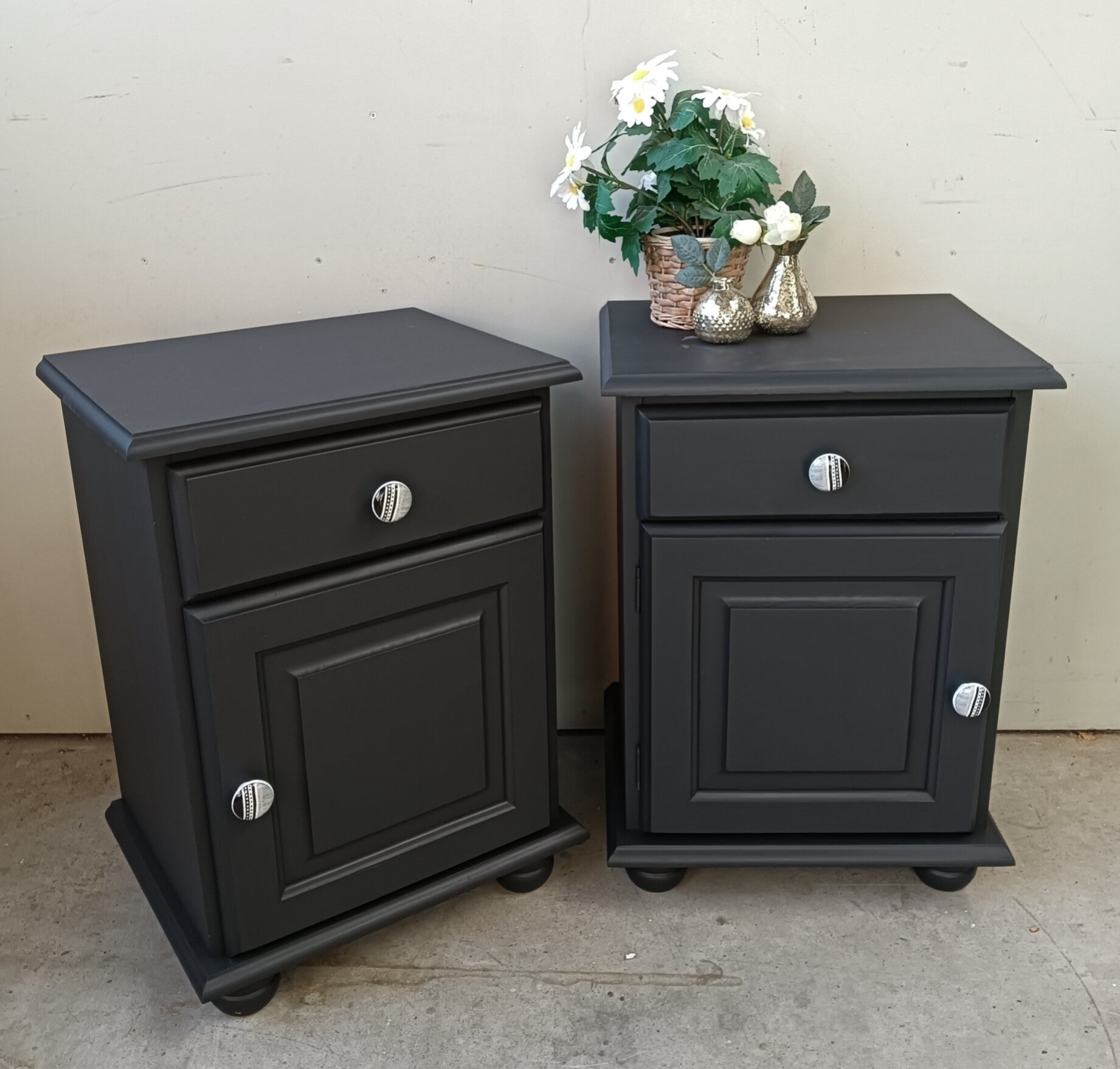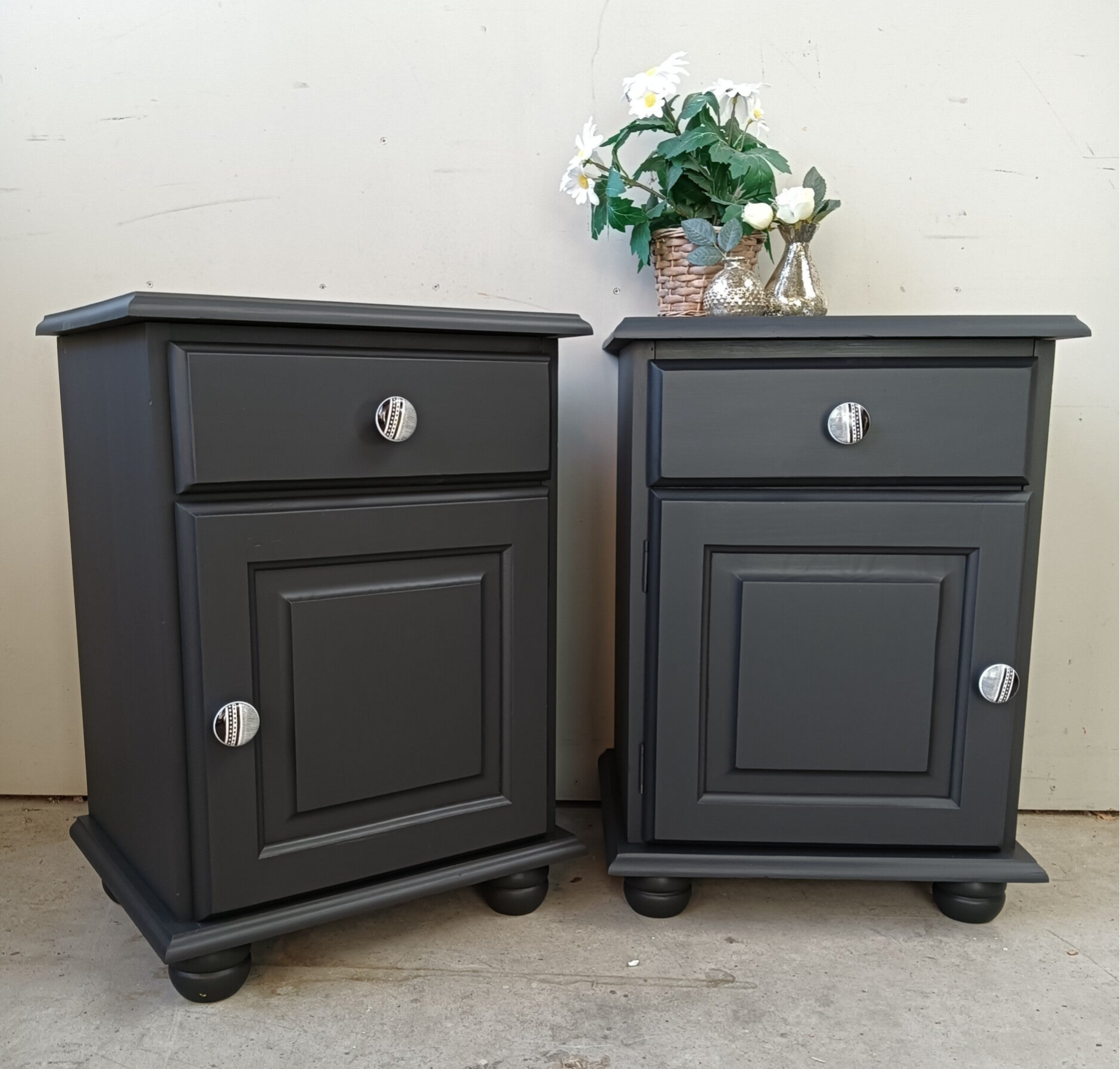 Een prachtige set deze nachtkastjes in de kleur Ash van Fusion Mineral Paint, we noemen het ook diep antraciet. Laadjes en deurtjes sluiten goed en zijn voorzien van een leuke bijpassende knop. Een mooi geheel zo samen.