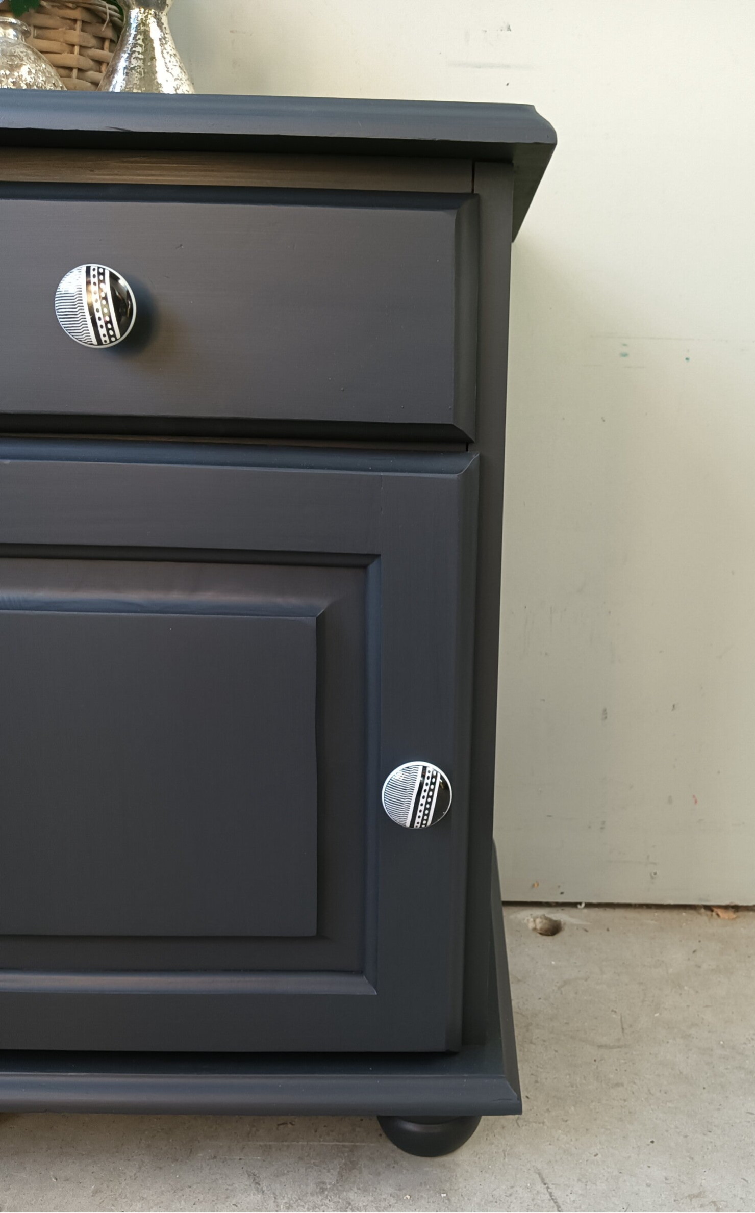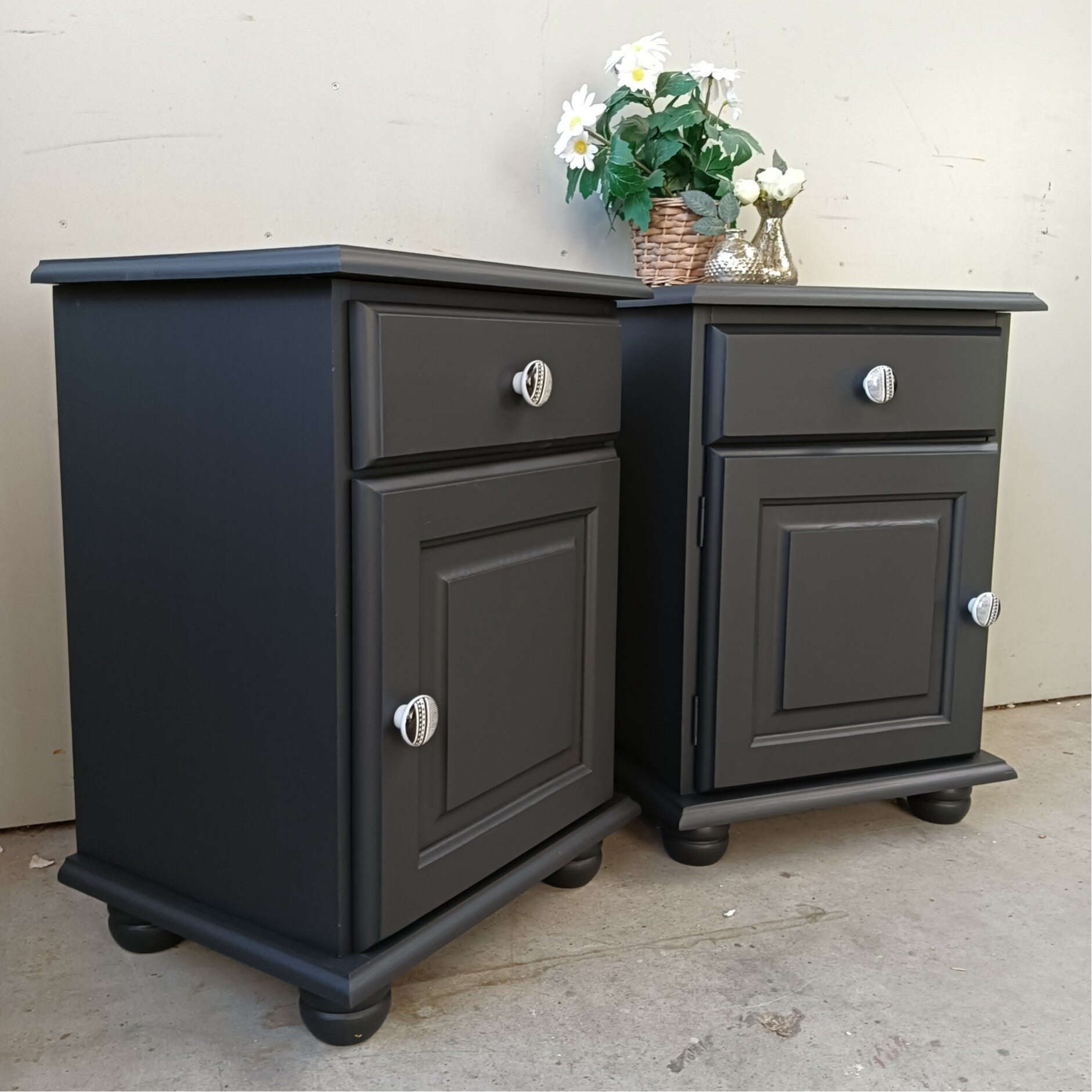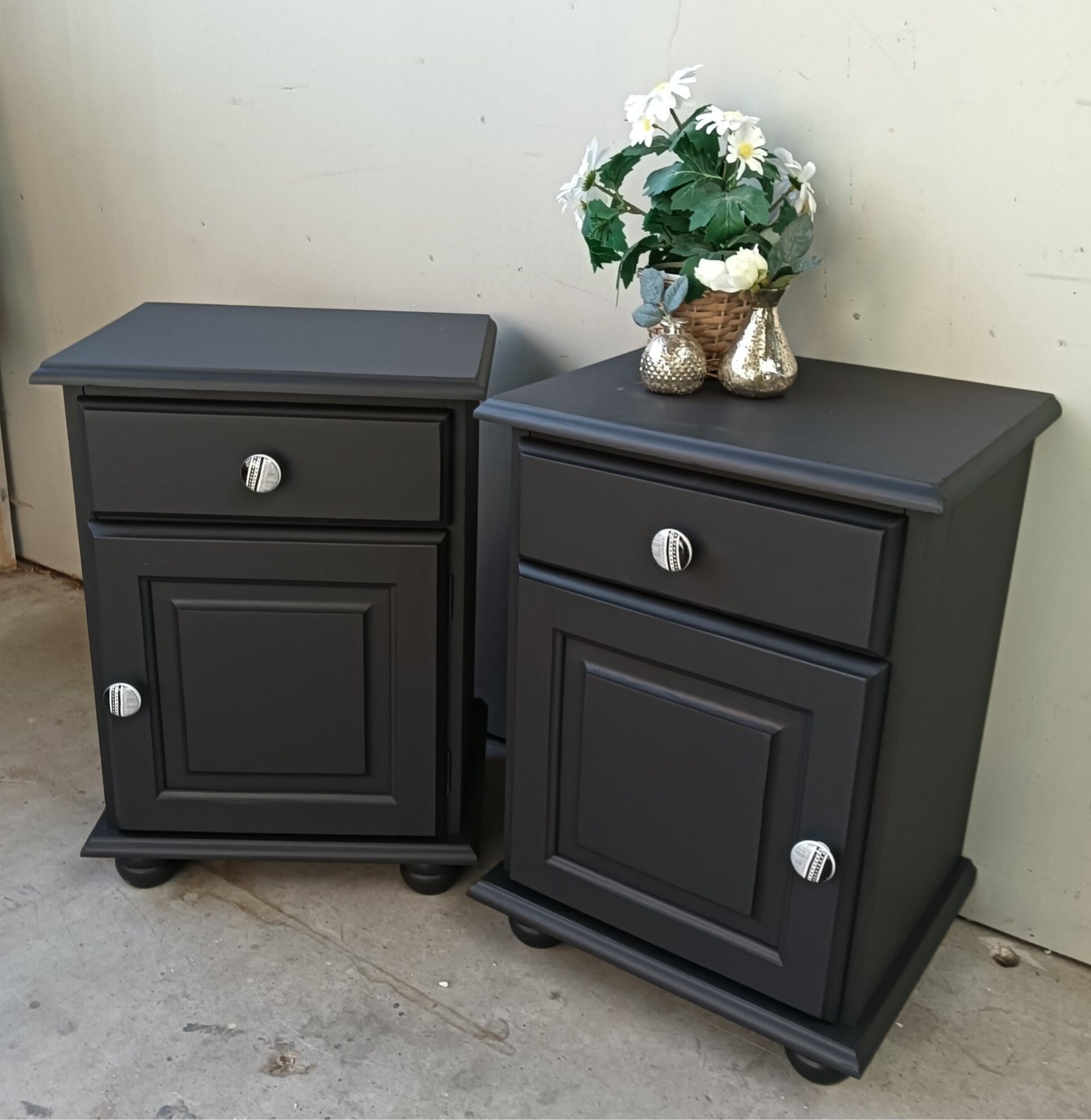 Een prachtige set deze nachtkastjes in de kleur Ash van Fusion Mineral Paint, we noemen het ook diep antraciet. Laadjes en deurtjes sluiten goed en zijn voorzien van een leuke bijpassende knop. Een mooi geheel zo samen.