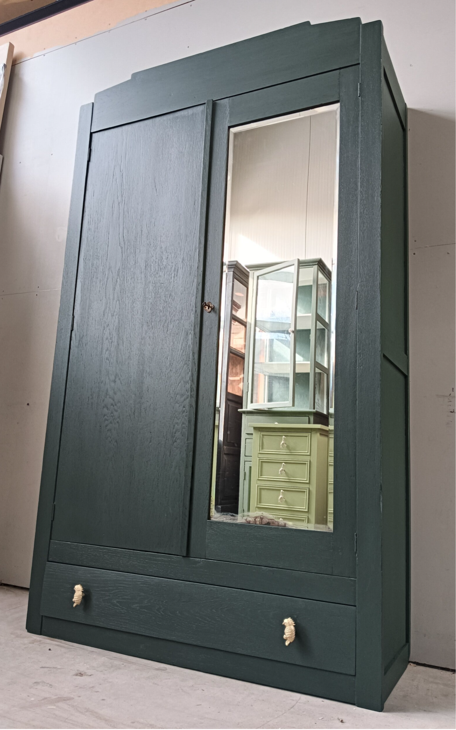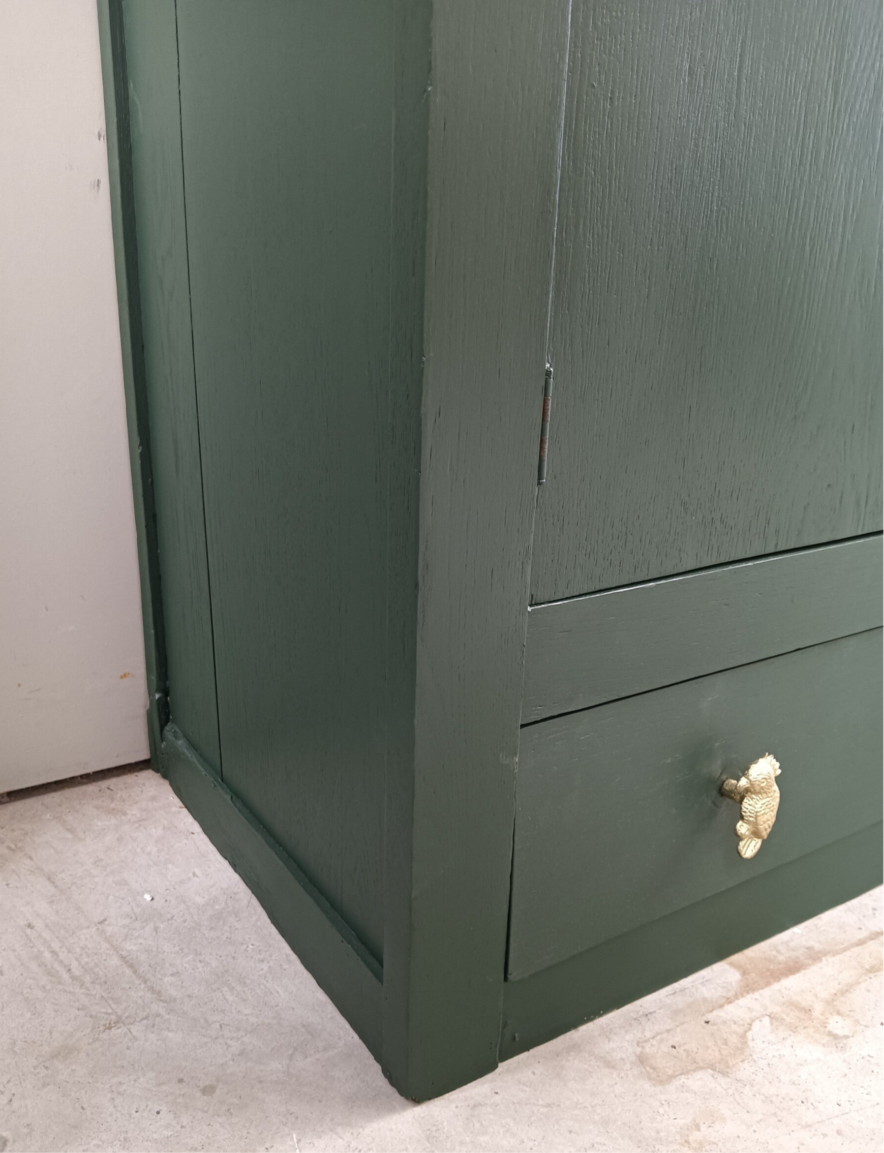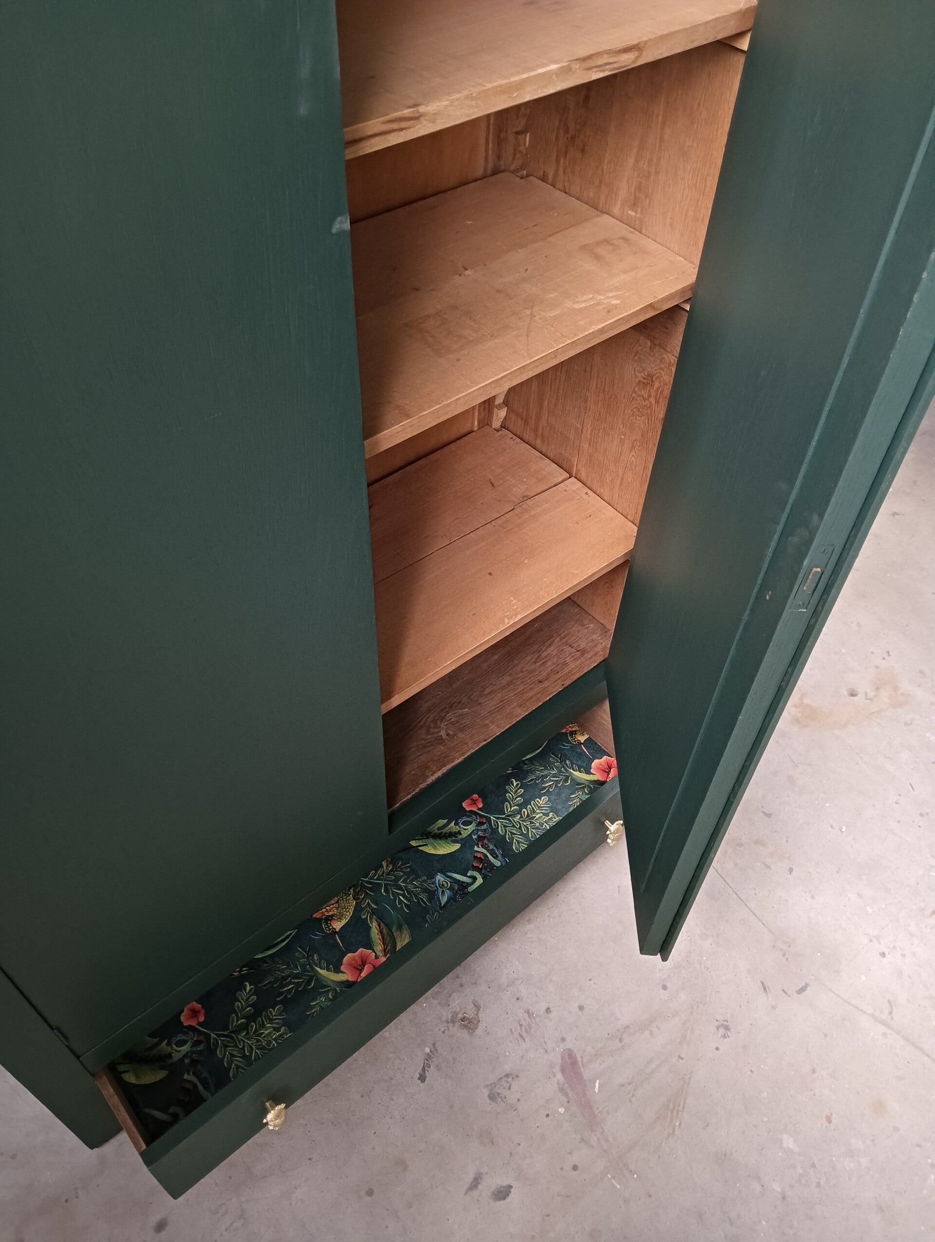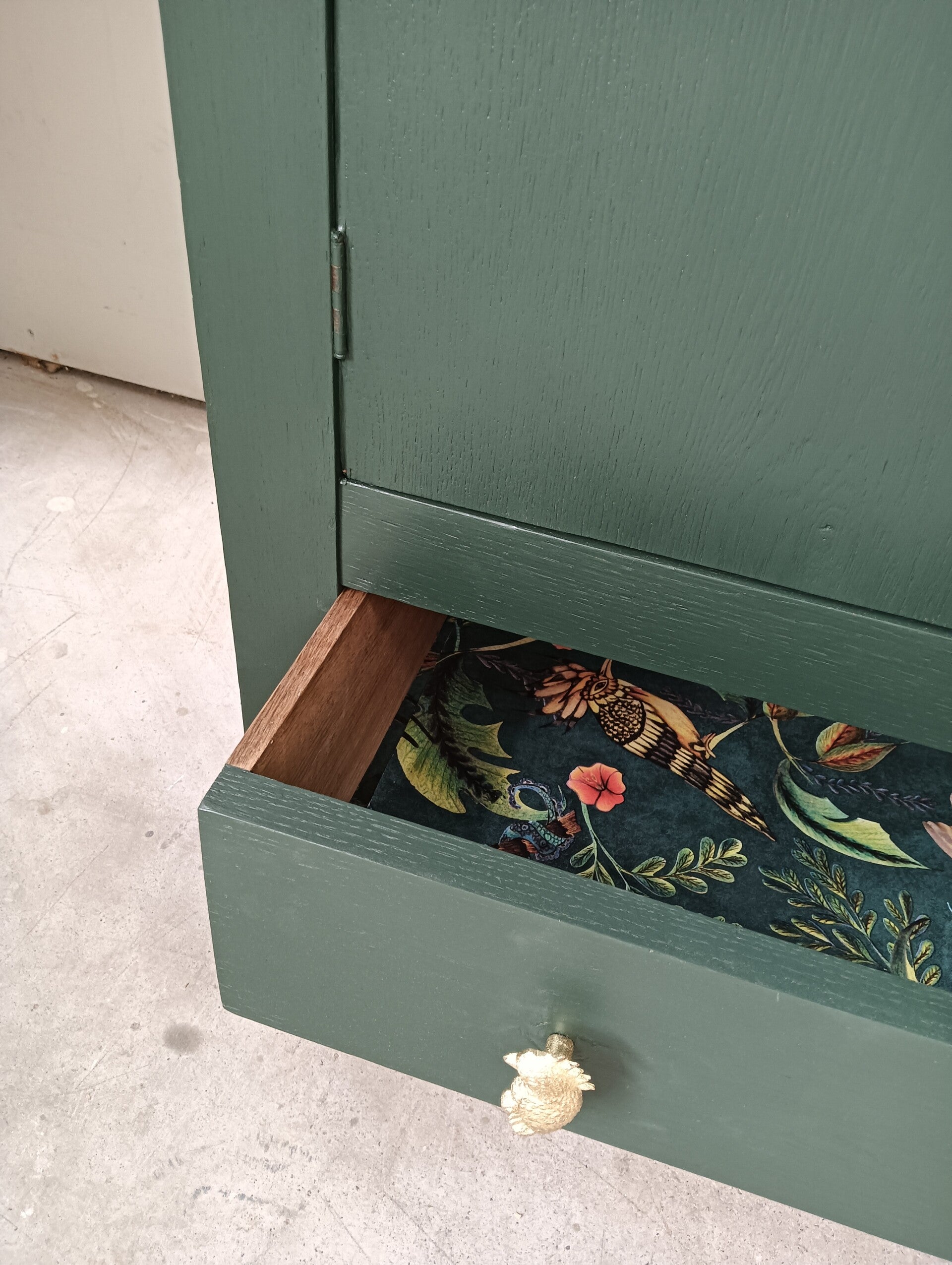 Ouwe bes in een nieuwe jas! De kleur Manor Green, een mooie diep groene tint van Fusion Mineral Paint is hier gebruikt en dat in combinatie met het tropische desing in de deur en de lade maakt het een leuke en mooi geheel. En wat dacht je van de knoppen op de lade?? Helemaal in stijl toch. Deze kast heeft stevige planken aan de binnenzijde en een handige lade onder op.