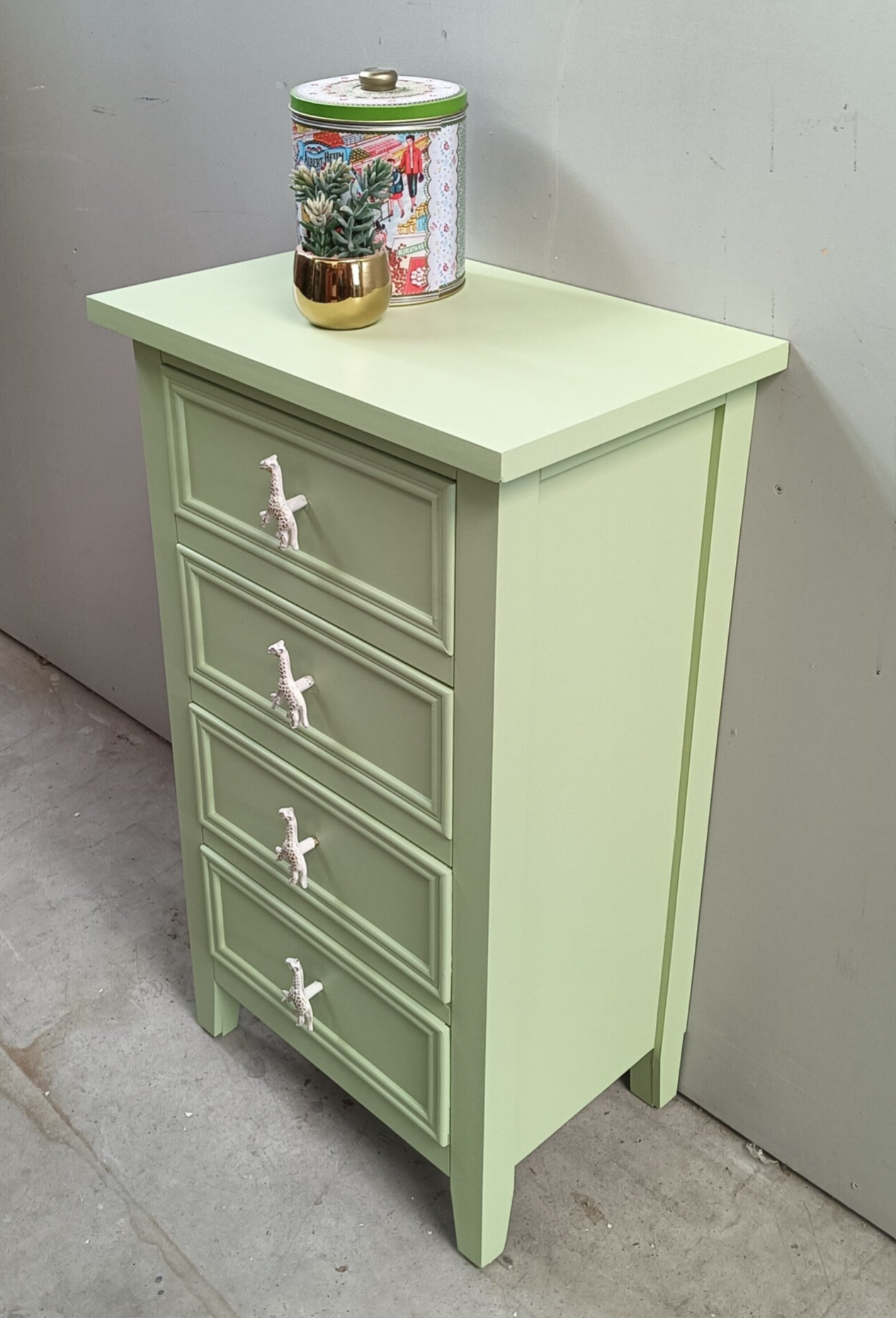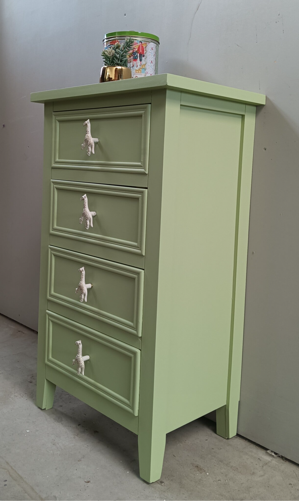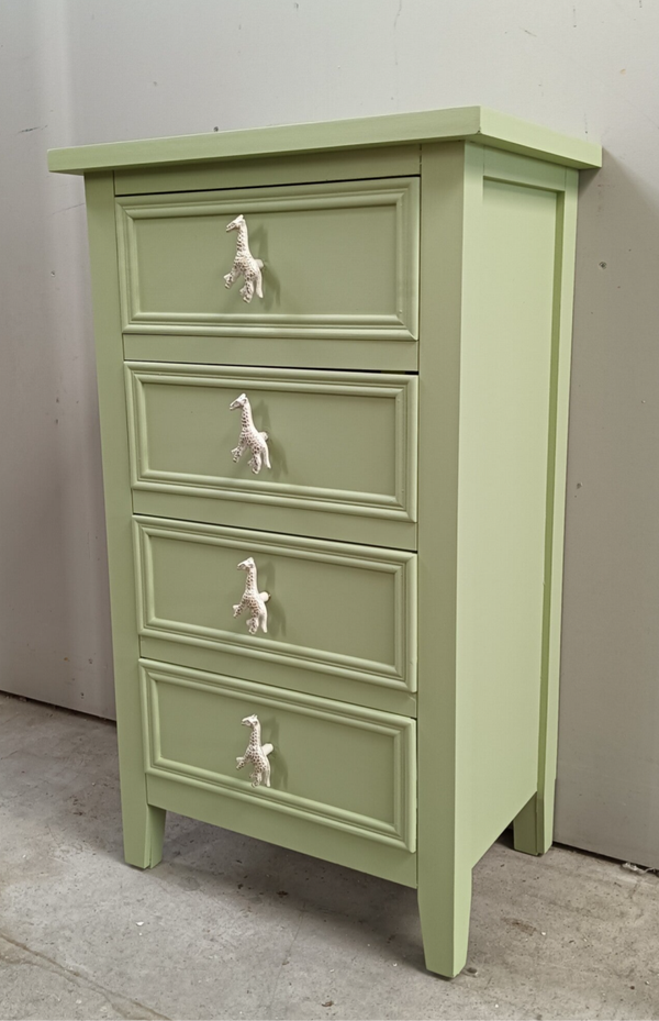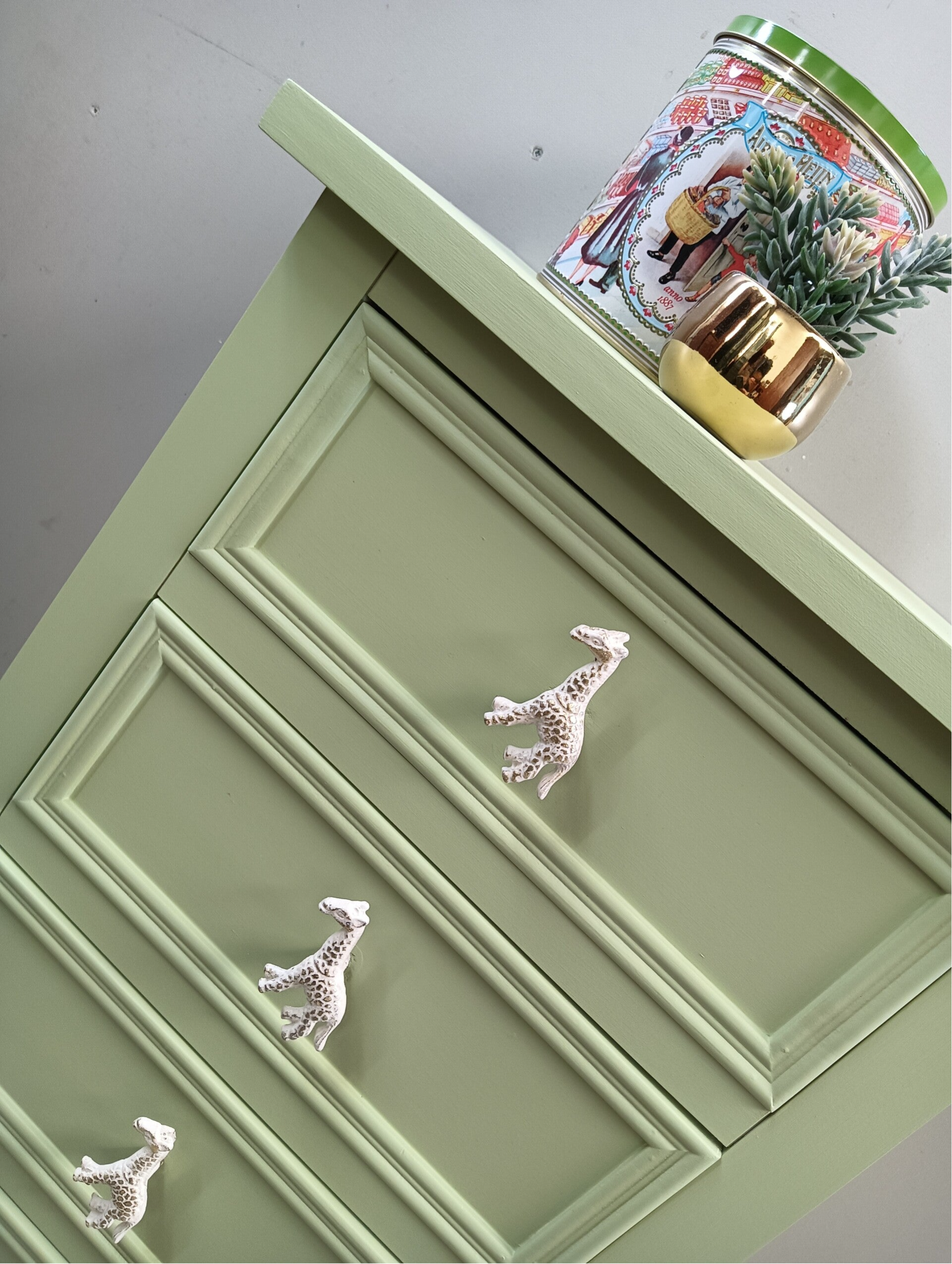 Niet perse oud, maar wel erg leuk! Dit ladenkastje heeft de kleur Upper Canada gekregen van Fusion Mineral Paint, een heerlijke frisse kleur groen. De knopjes van de laatjes, heb je die al gespot, helemaal leuk toch?!
