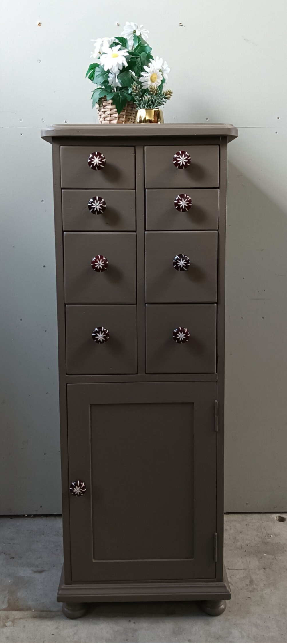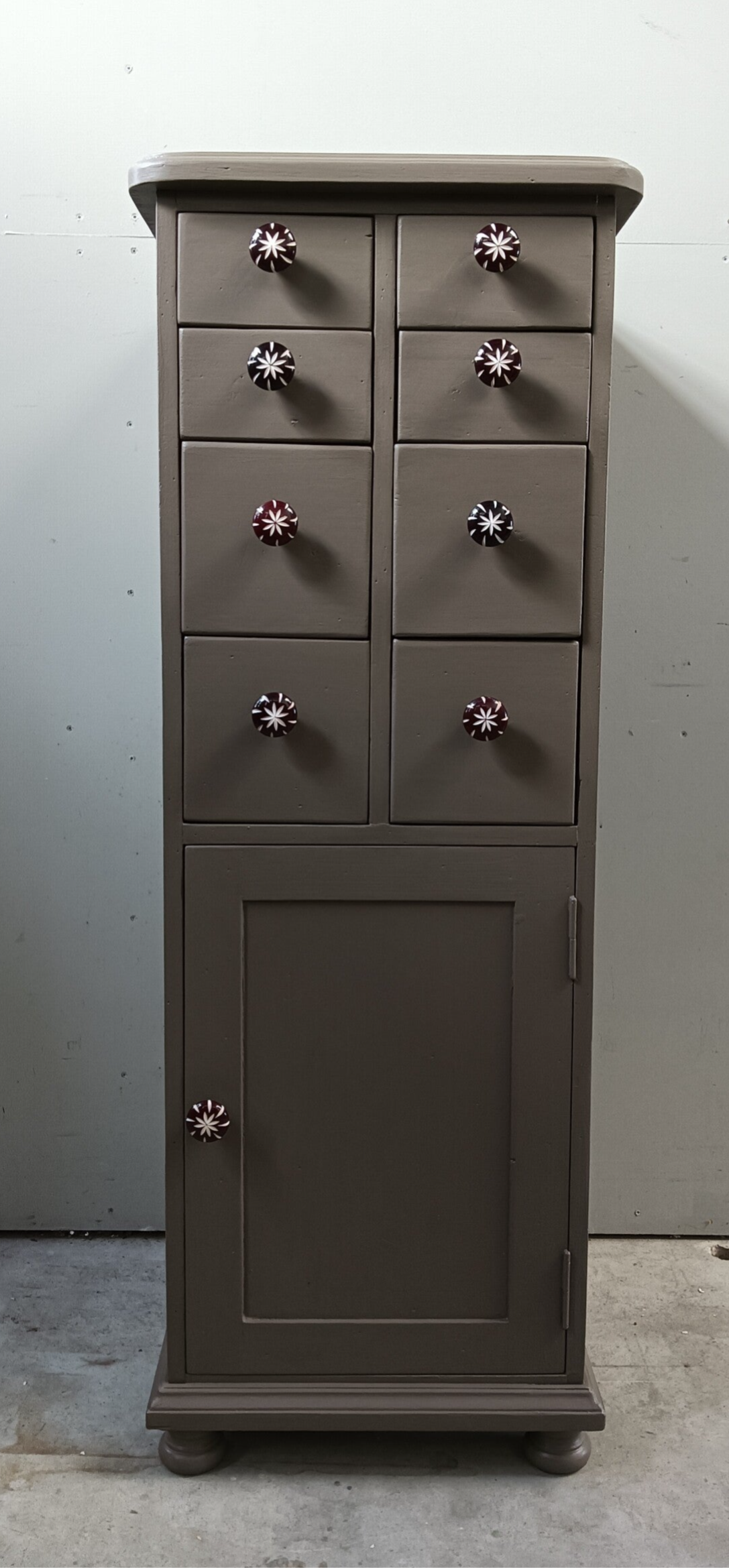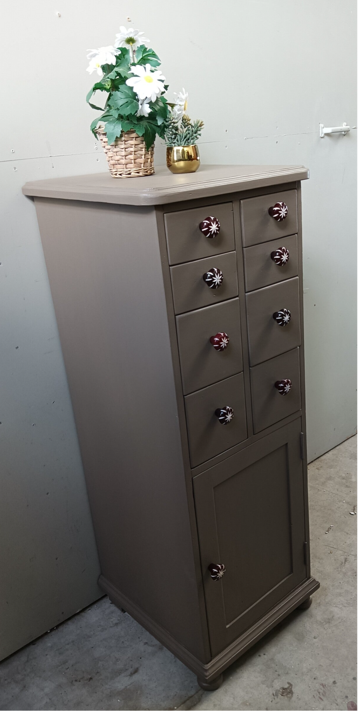 Een toffe ladenkast, vervaardigd uit goede kwaliteit hout, dus deze kast loop je niet zomaar omver ;-). De kleur is Woodwick en komt uit het assortiment van Fusion Mineral Paint. De kleur is een warm en enigszins caramel/bronsachtige tint. Deze kleur geeft sfeer en past eigenlijk overal bij. De knoppen maken het een echte eycather, een kast die niemand anders heeft. Leuk voor in de hal, maar ook in de woonkamer, met een mooie plant er op. Ach....genoeg kansen voor deze kanjer toch?