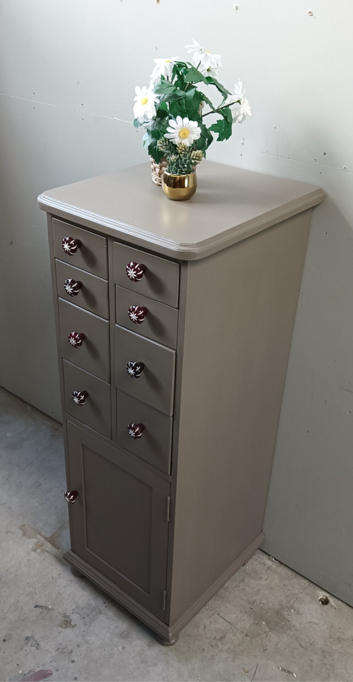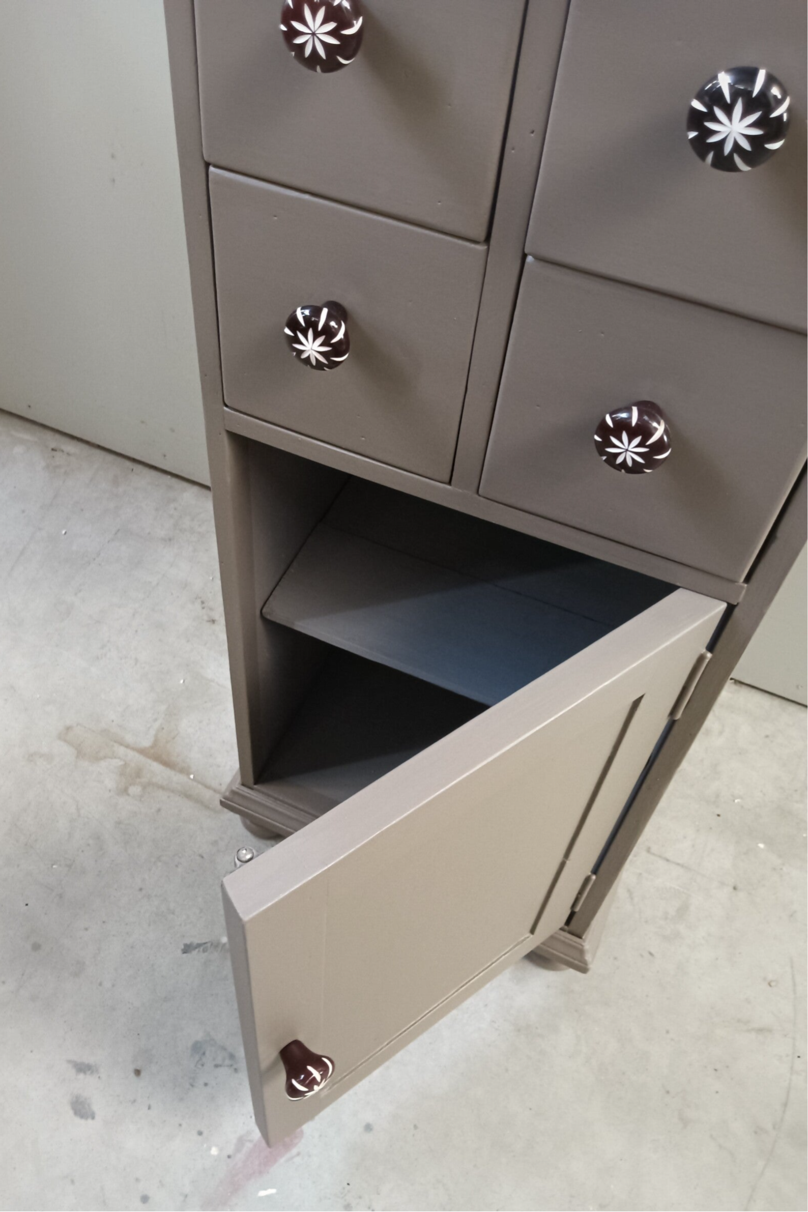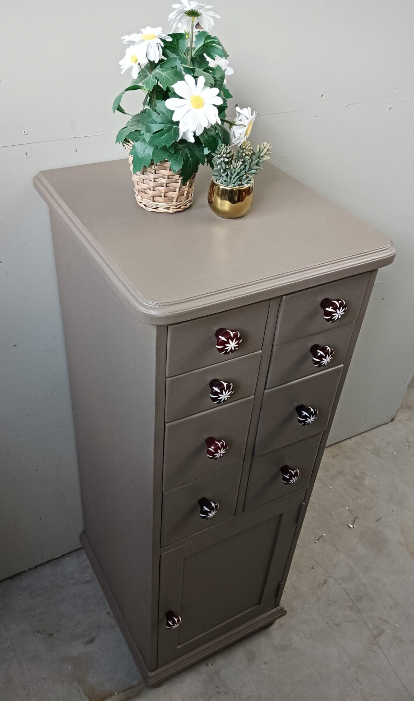 Een toffe ladenkast, vervaardigd uit goede kwaliteit hout, dus deze kast loop je niet zomaar omver ;-). De kleur is Woodwick en komt uit het assortiment van Fusion Mineral Paint. De kleur is een warm en enigszins caramel/bronsachtige tint. Deze kleur geeft sfeer en past eigenlijk overal bij. De knoppen maken het een echte eycather, een kast die niemand anders heeft. Leuk voor in de hal, maar ook in de woonkamer, met een mooie plant er op. Ach....genoeg kansen voor deze kanjer toch?