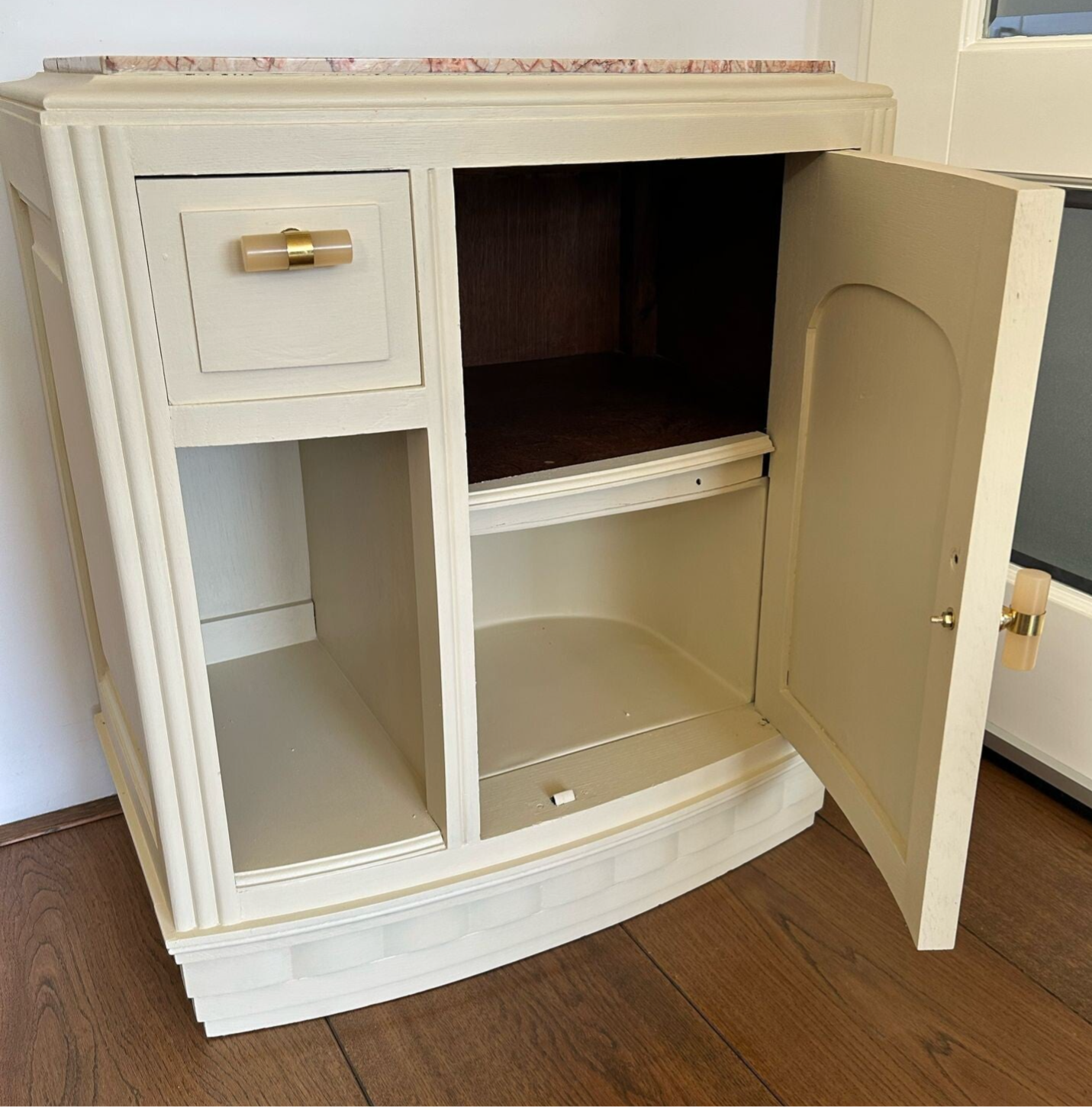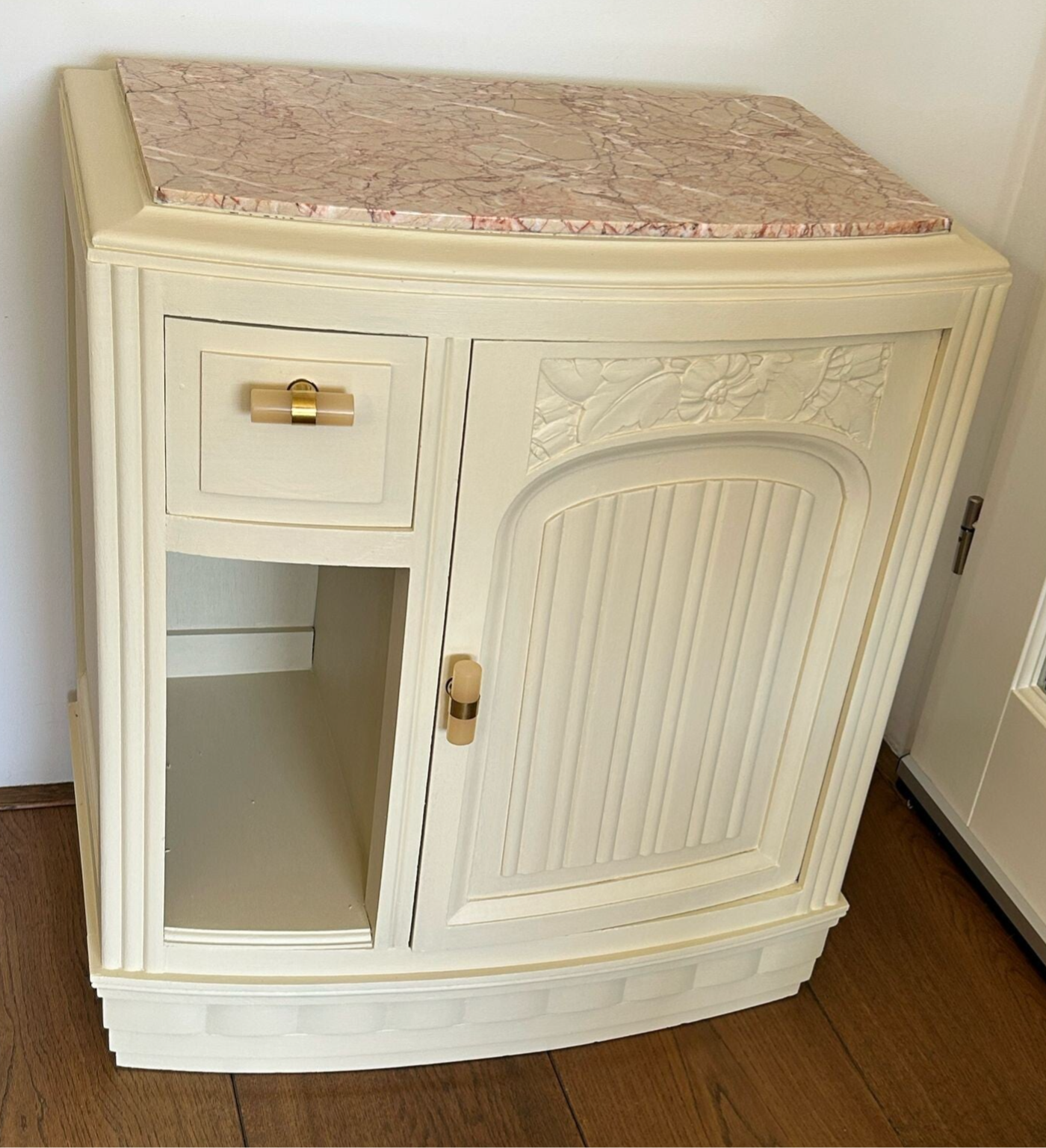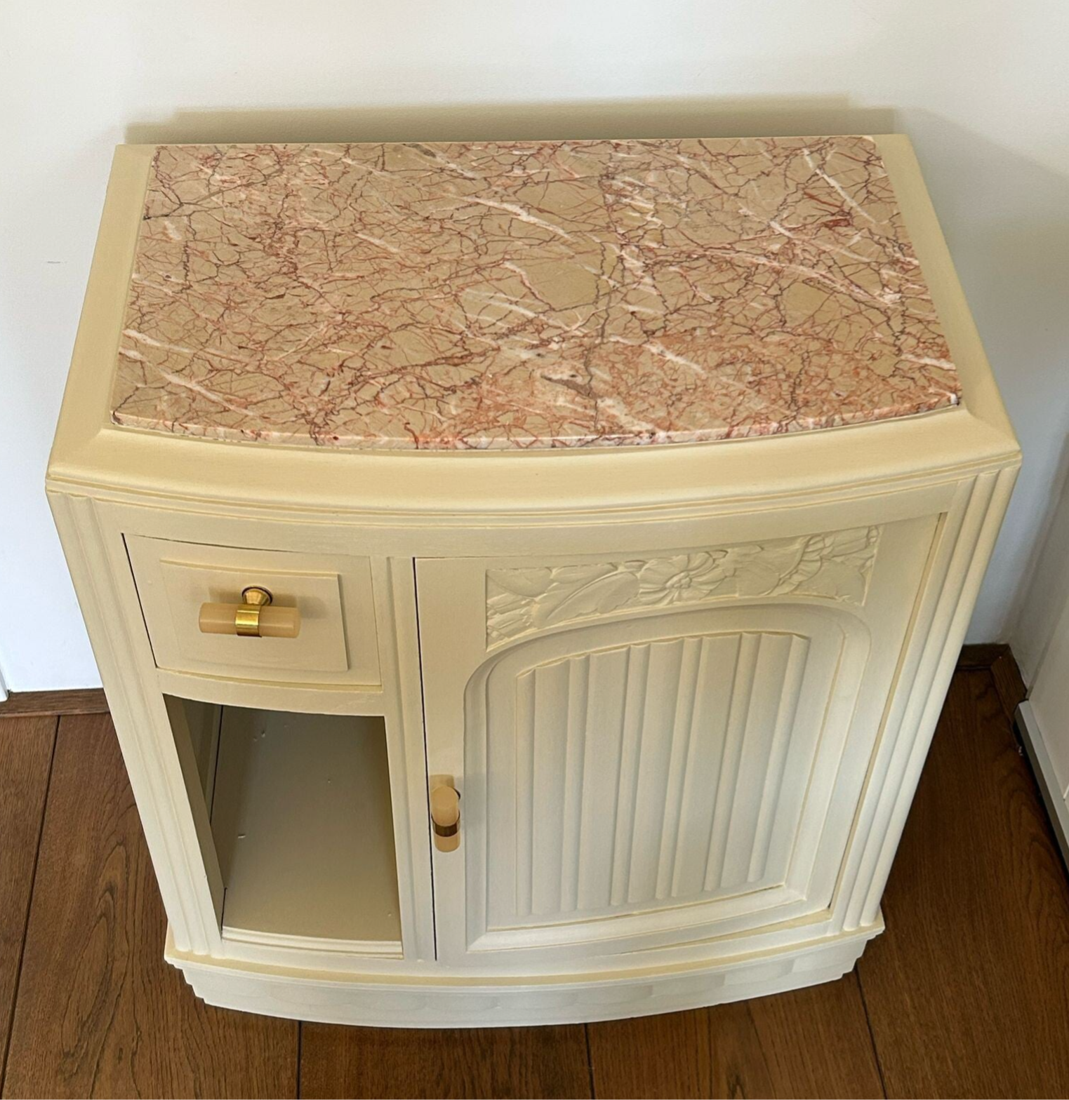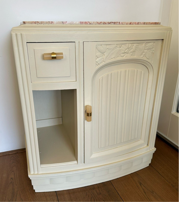 Een prachtig wandkastje rechtstreeks uit Frankrijk. Mooi zware kwaliteit, prachtig houtsnijwerk en een prachtig gevlamd marmeren blad. De kleur die we gebruikt hebben is Plaster van Fusion Mineral Paint, hetgeen als creme wit door het leven gaat. Dit past wat ons betreft uitstekend bij de verschillende kleuren van het marmeren blad en ook de knoppen hebben we daarop afgestemd. Al met al een prachtig kastje wat voor vele doeleinde geschikt is.