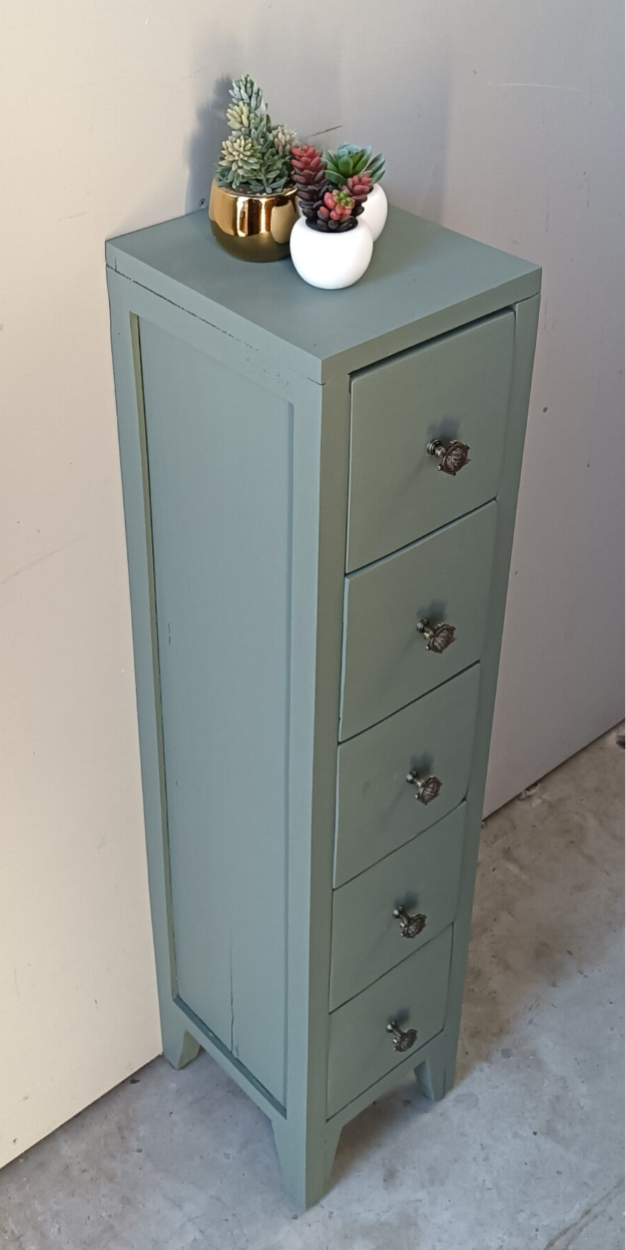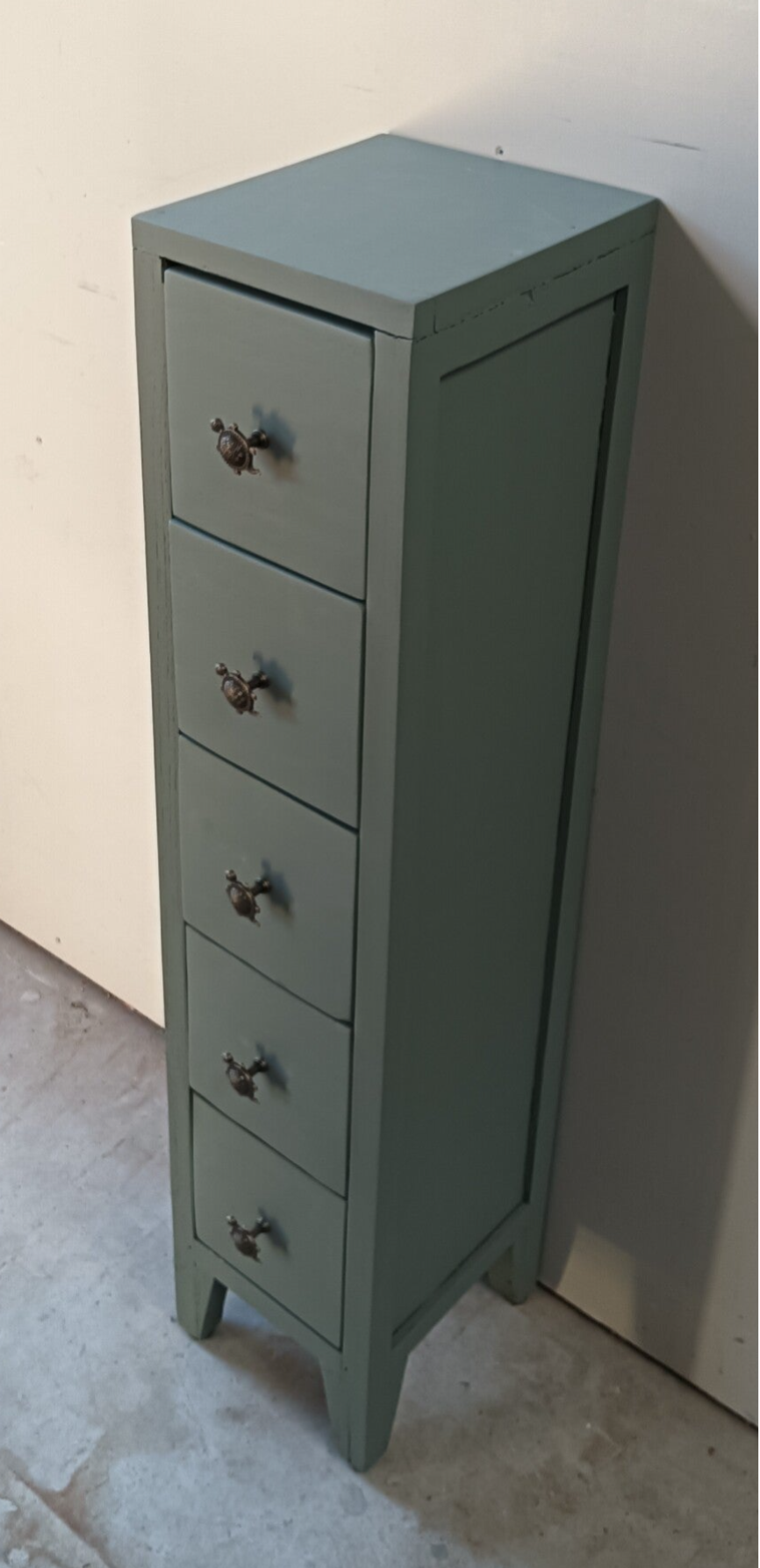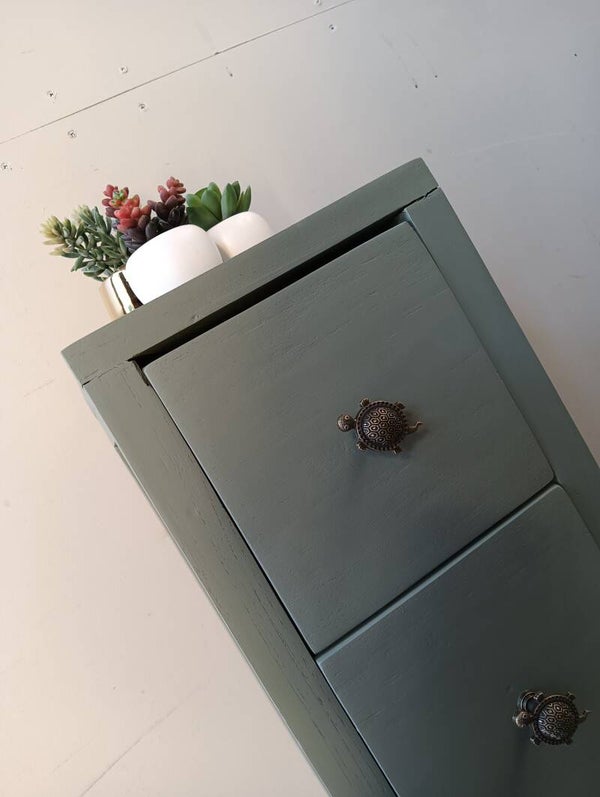 Lang en smal maar wel massief hout, dit super leuke en praktische ladenkastje. De kleur Carriage House, van Fusion Mineral Paint, is hier gebruikt en laat zich het beste omschrijven als een lagune groen tint. De knopjes zijn natuurlijk helemaal leuk en net weer even anders als anders. Qua afmetingen dus bescheiden en dus snel een plekje voor toch?!