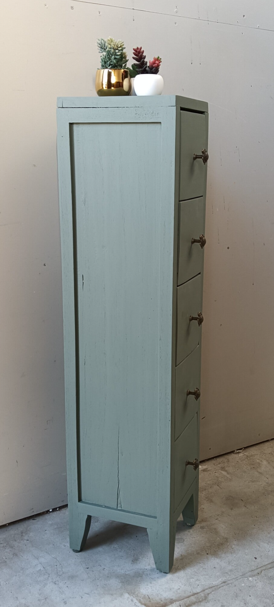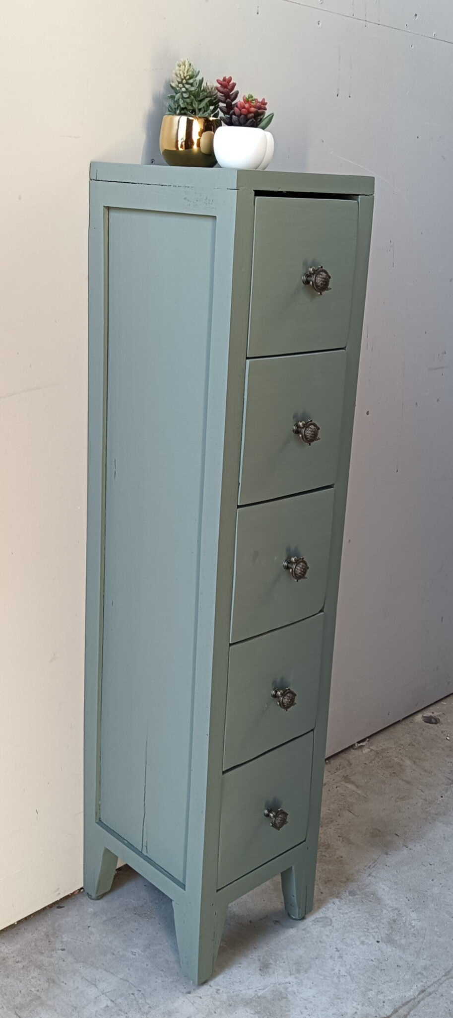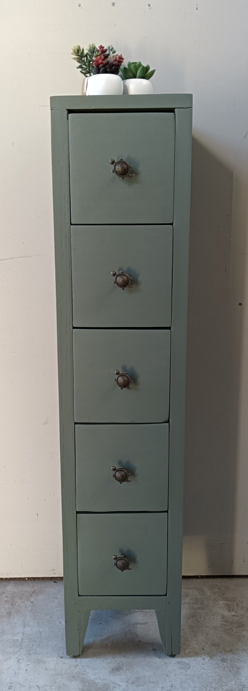 Lang en smal maar wel massief hout, dit super leuke en praktische ladenkastje. De kleur Carriage House, van Fusion Mineral Paint, is hier gebruikt en laat zich het beste omschrijven als een lagune groen tint. De knopjes zijn natuurlijk helemaal leuk en net weer even anders als anders. Qua afmetingen dus bescheiden en dus snel een plekje voor toch?!
